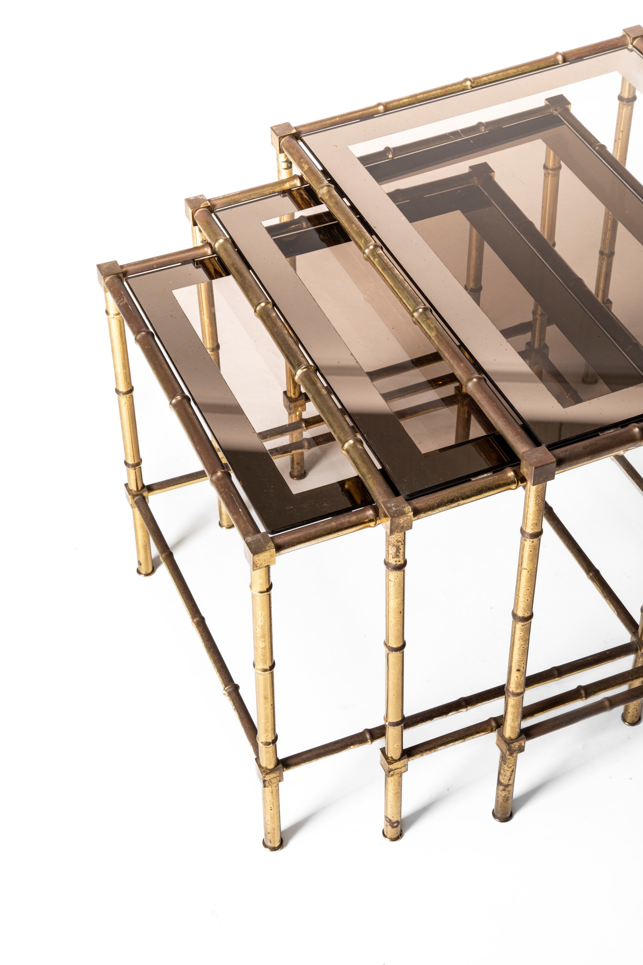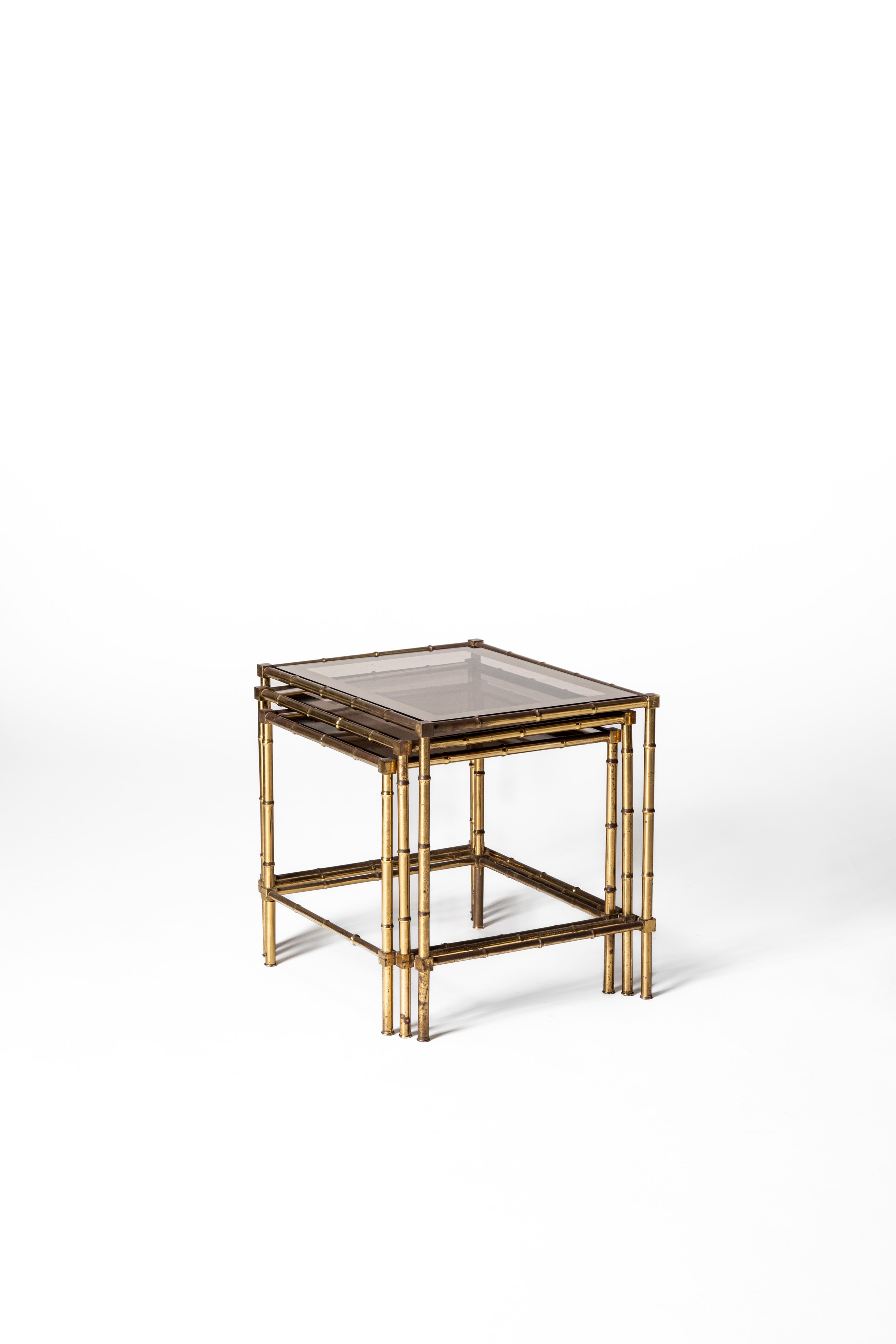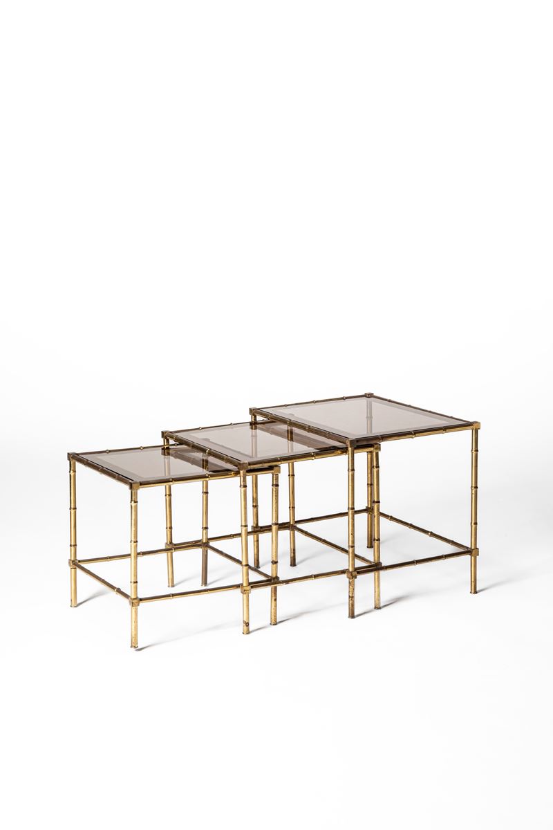 Tris di tavolini a nido con lavorazione a foggia di bambù e piani in cristallo