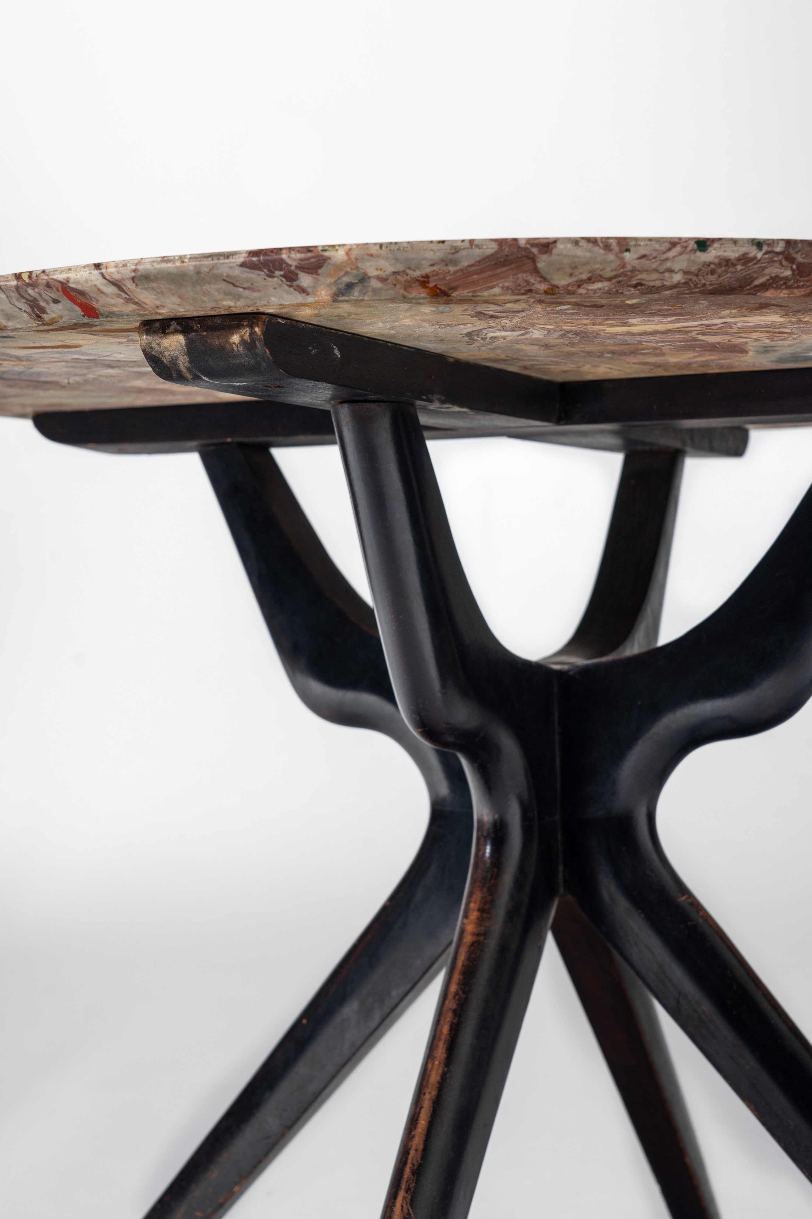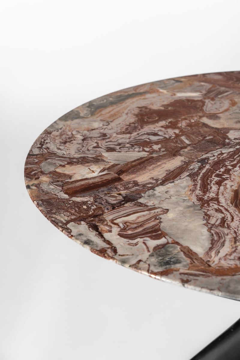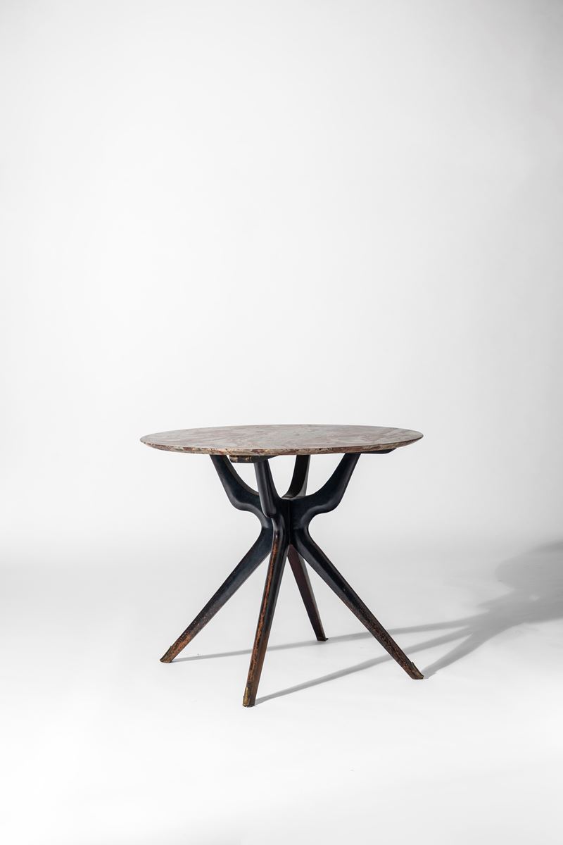 Tavolo circolare con piano in marmo, struttura in legno e puntali in ottone