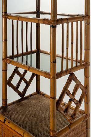 Étagère con struttura in bambù, piani in cristallo e dettagli in ottone
