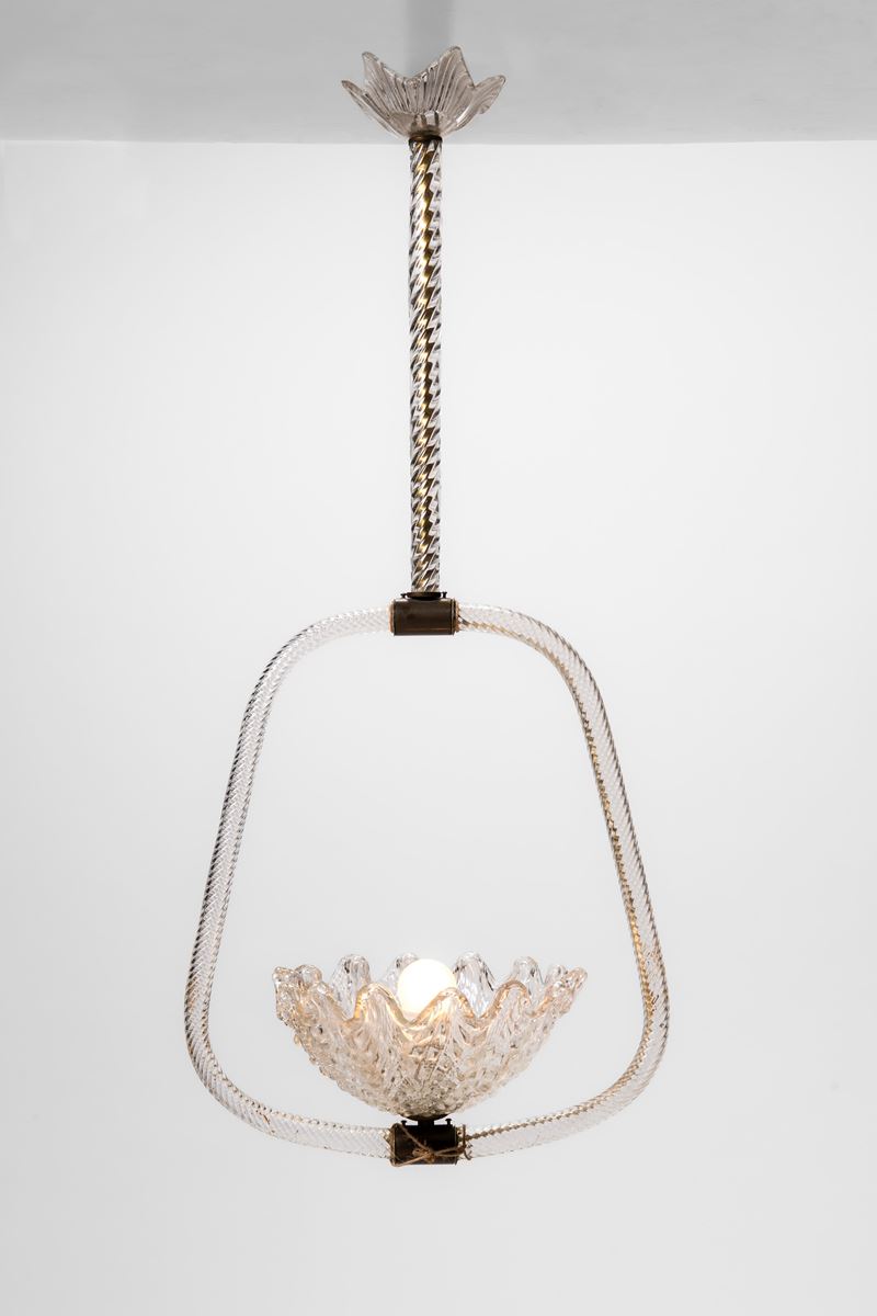 Lampada a sospensione in vetro di Murano, struttura in vetro incolore a treccia, diffusore a valva di conchiglia costolato ed elementi in ottone