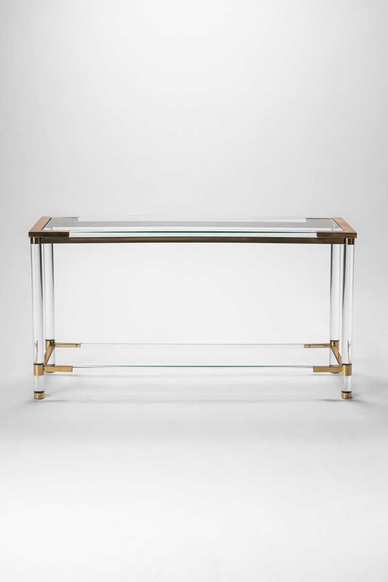 Consolle con struttura in plexiglass, piani in vetro vetro e dettagli in ottone