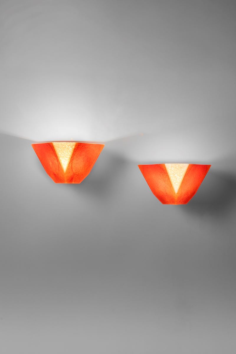Coppia di lampade da parete con struttura triangolare in metallo verniciato e diffusore in vetro policromo