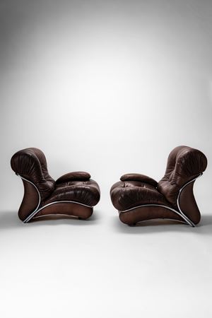 Coppia di poltrone con rivestimento in pelle e struttura in metallo cromato