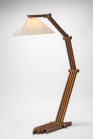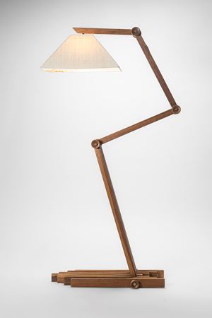 Lampada da terra regolabile con struttura in legno e paralume in tessuto