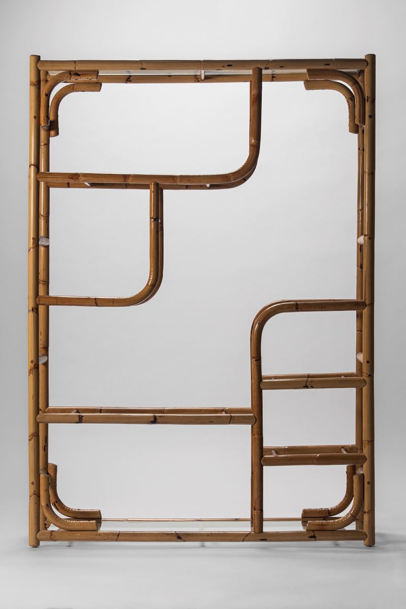 Libreria con struttura in bambù curvato e piani in cristallo