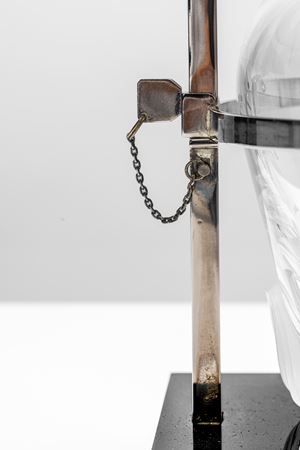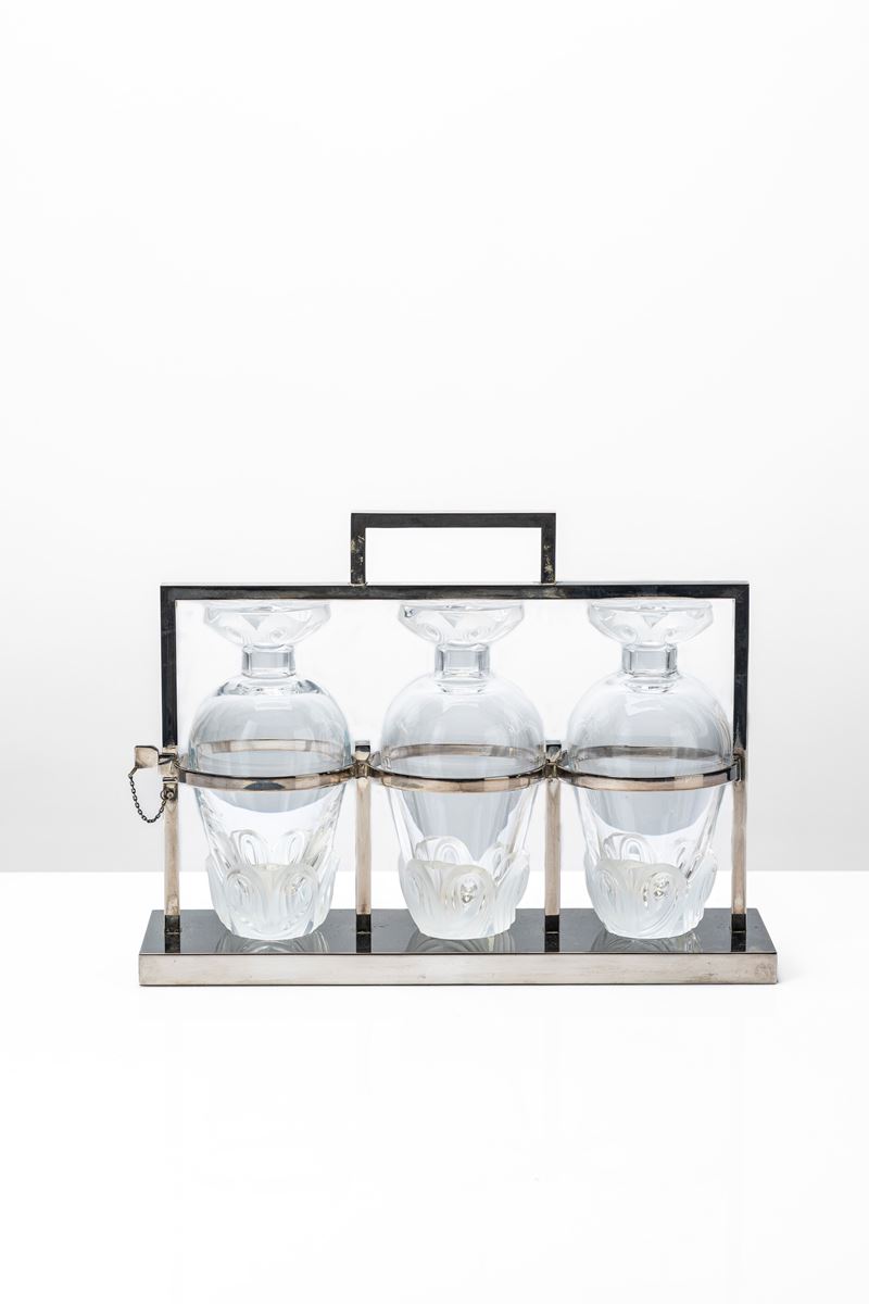 Set di tre bottiglie decanter modello Tantalus no. 13353 in cristallo di forte spessore decorato e satinato, portabottiglie a chiusura dedicato in metallo argentato