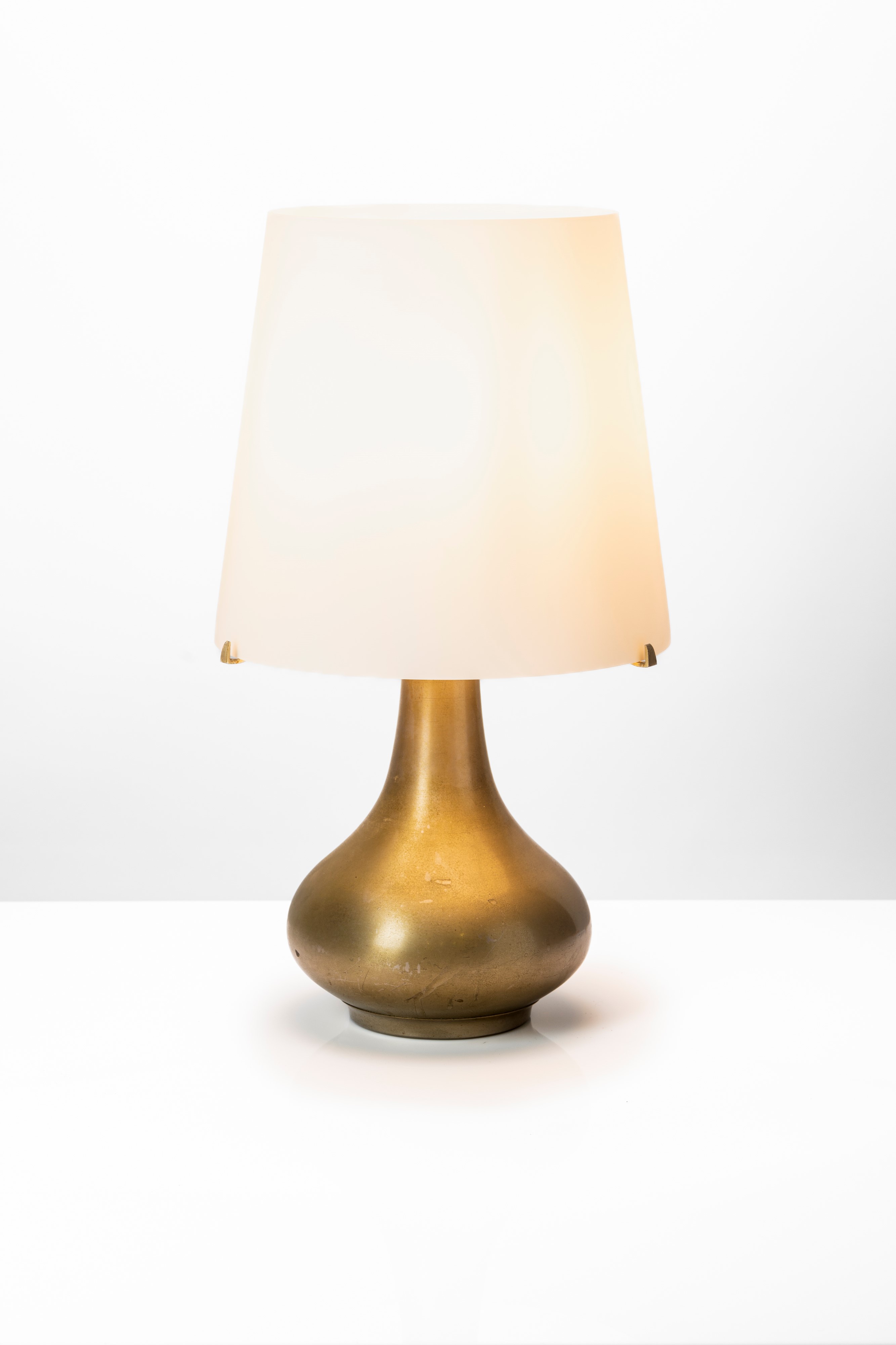 Lampada da tavolo modello 2344 con base in metallo nichelato spazzolato e diffusore in vetro opalino