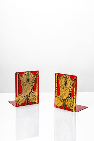 Coppia di fermalibri, decoro strumenti musicali, 1960 circa