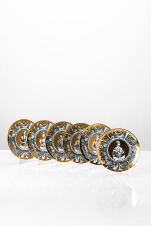 Set di sei piatti dalla serie Melodramma a fondo oro con decoro a trionfi musicali