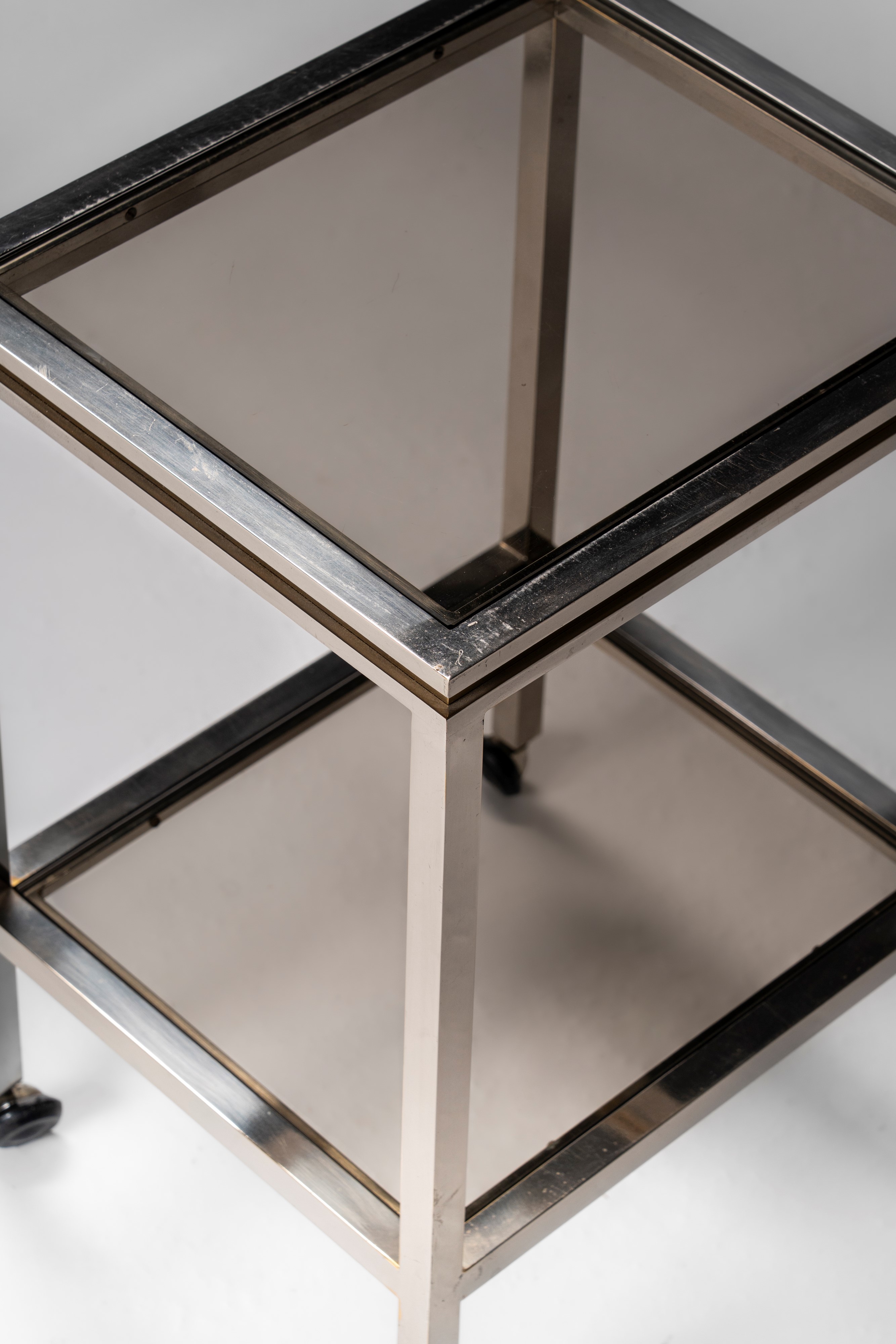 Coppia di side table mobili con struttura in ottone cromato, ottone lucido e doppio piano in cristalli fumé