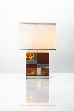 Lampada da tavolo con base in ottone cromato con inserti in radica e paralume originale in tessuto profilato