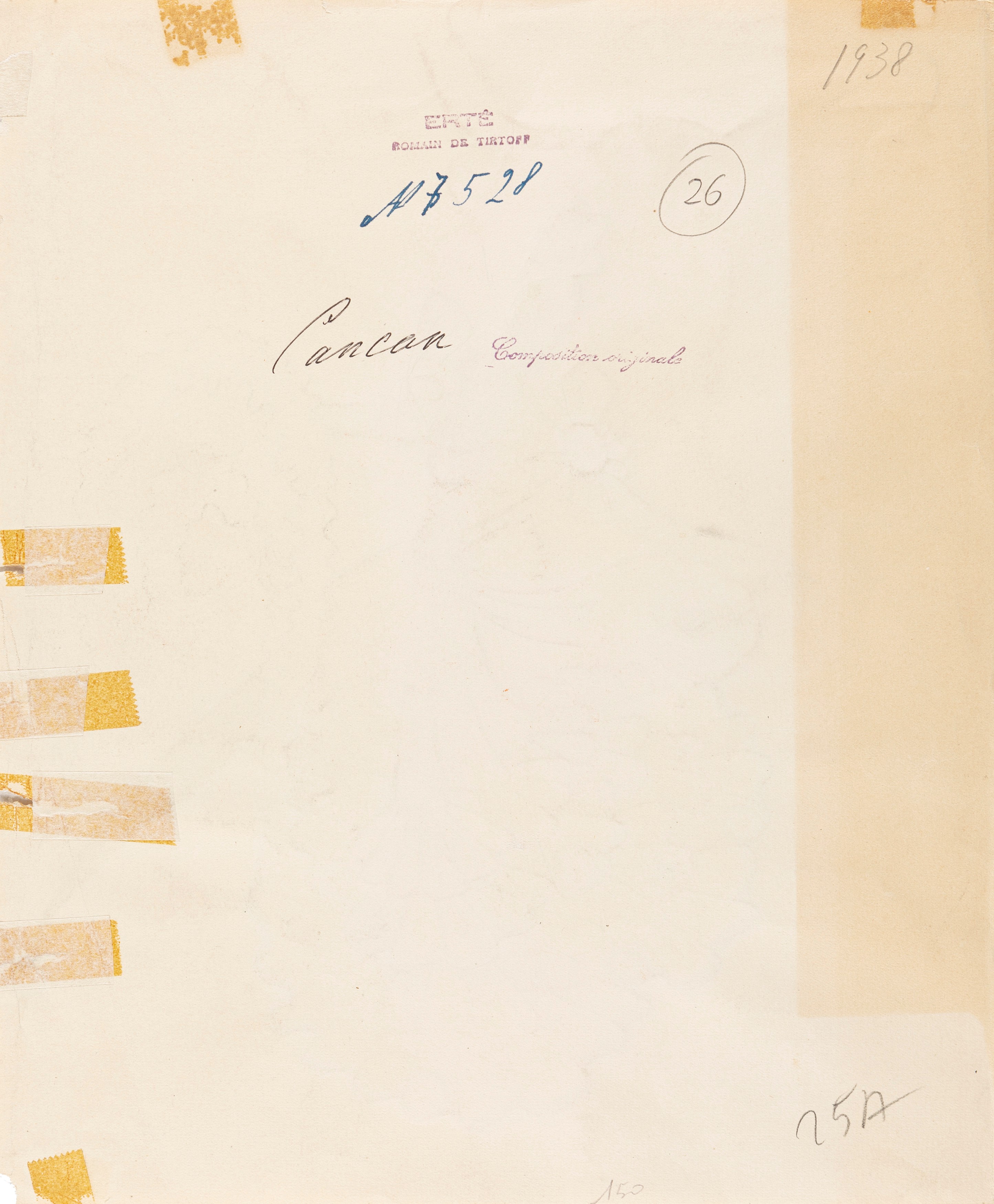 Disegno originale realizzato da Erté negli anni '40 per i costumi di una rappresentazione teatrale. Recante al retro il titolo, il timbro dell'artista e il numero d'archivio 7528. Pieghe, strappi e mancanza al margine destro. Firmato.