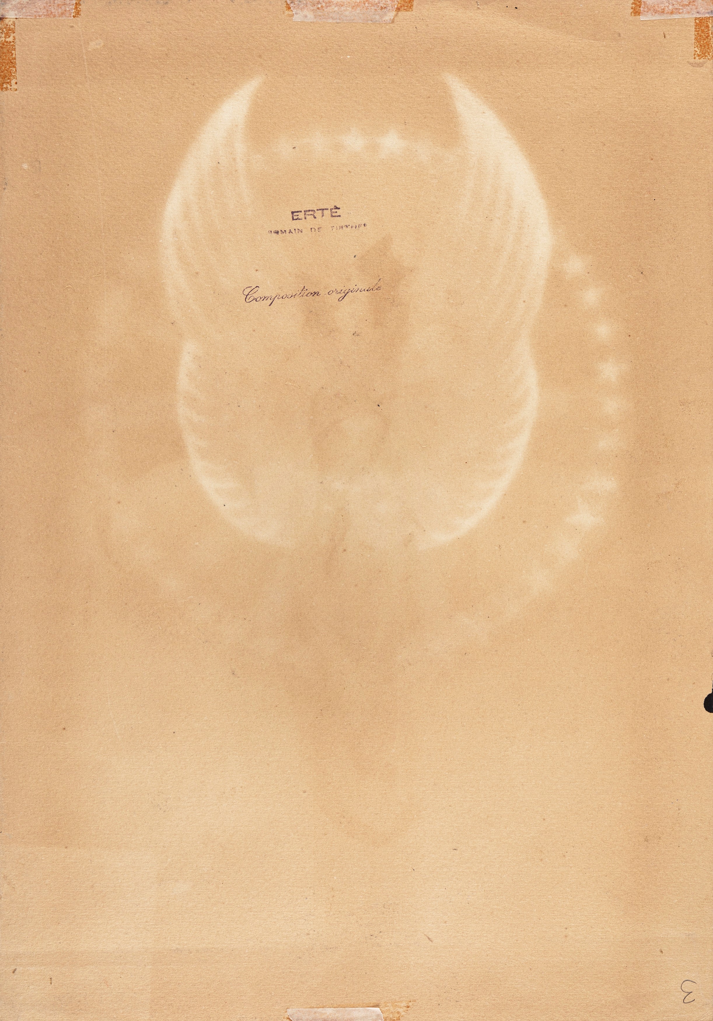 Disegno originale realizzato da Erté nel 1943 per i costumi di una rappresentazione teatrale tenutasi nel celebre locale parigino Tabarin. Opera pubblicata nel volume "Erté: Cose che ricordo" edito da Edizioni La Bautta nel 1987. Recante al retro il timbro dell'artista. Lieve piega al margine superiore. Firmato.