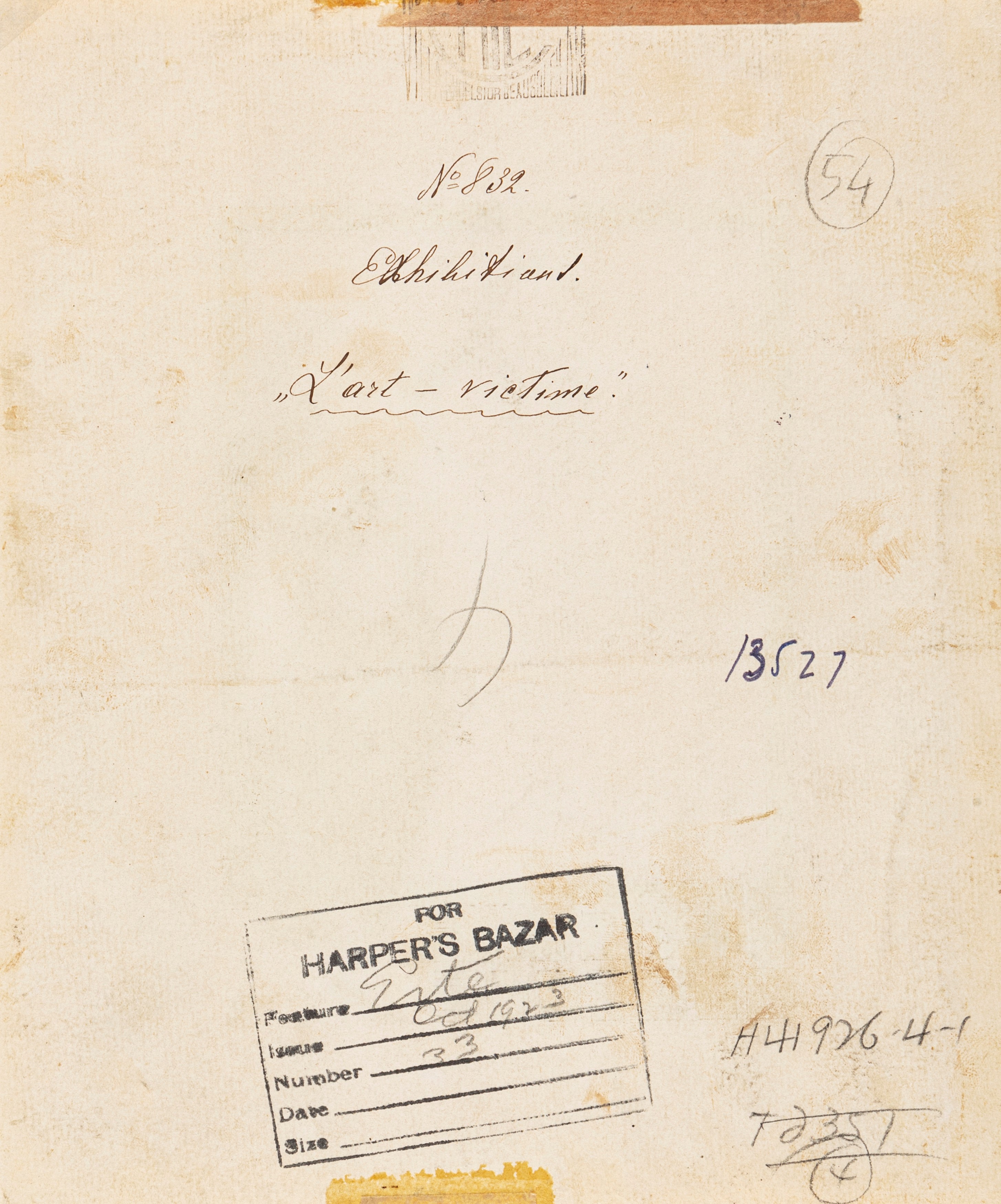 Disegno originale realizzato da Erté nel 1923 per la celebre rivista Harper’s Bazaar. Recante al retro il titolo, il timbro dell'artista, il timbro editoriale e il numero d'archivio 832. Lieve piega orizzontale al centro. Firmato.