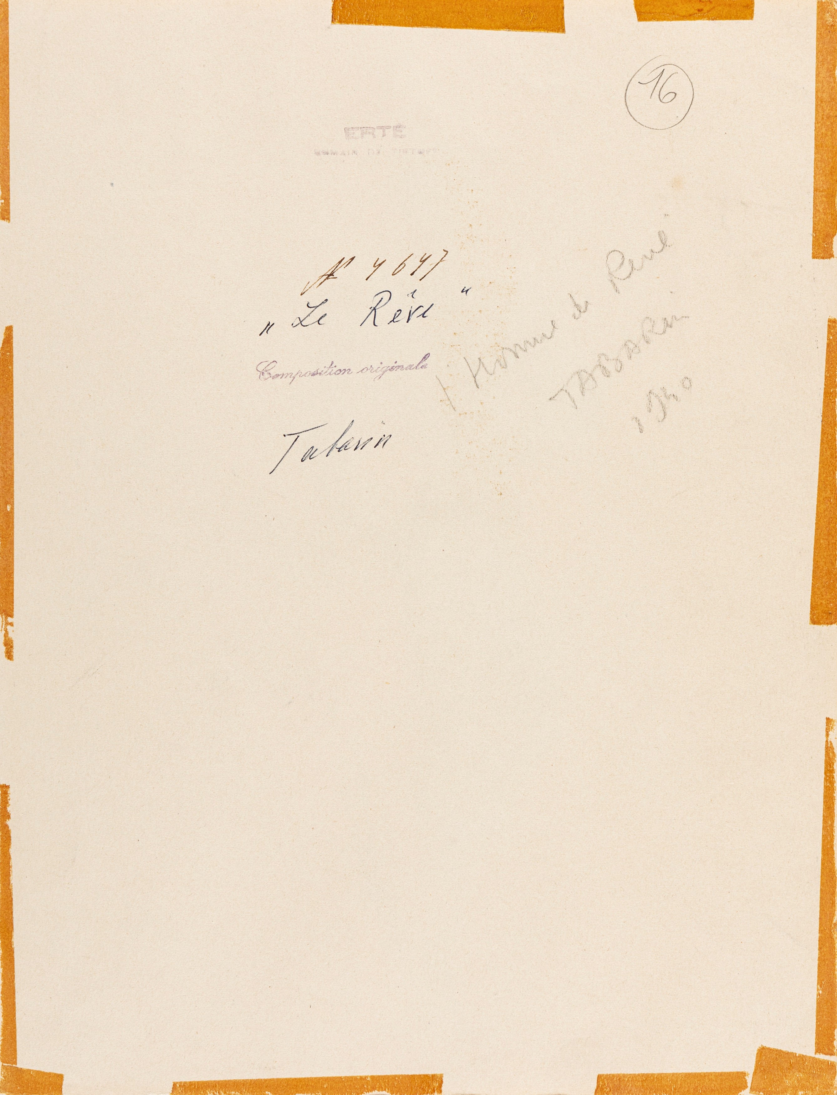 Disegno originale realizzato da Erté nel 1940 per i costumi di una rappresentazione teatrale tenutasi nel celebre locale parigino Tabarin. Recante al retro il titolo, il timbro dell'artista e il numero d'archivio 4647. Firmato.