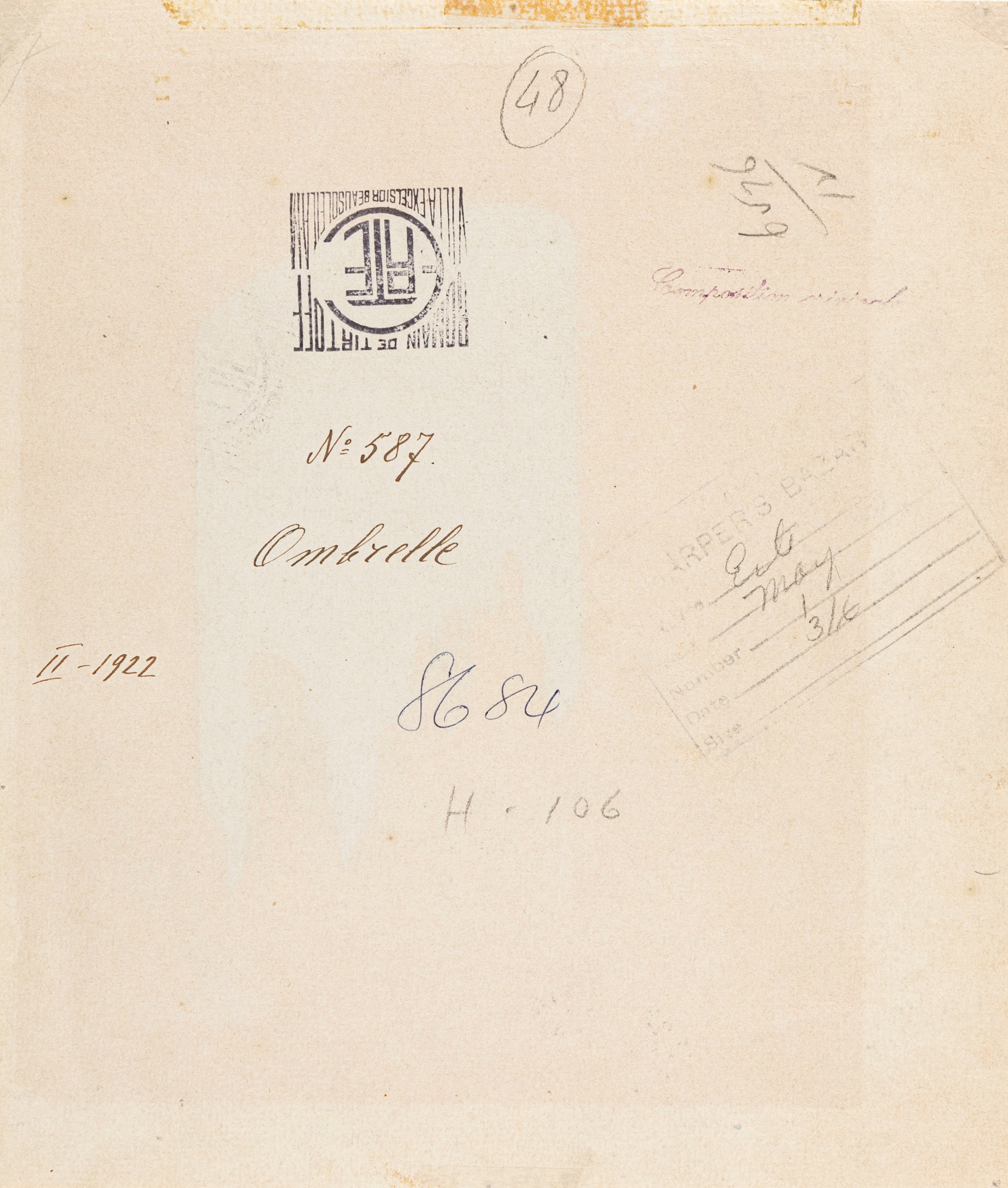 Disegno originale realizzato da Erté nel 1922 per la celebre rivista Harper’s Bazaar. Recante al retro il titolo, il timbro dell'artista, il timbro editoriale e il numero di archivio 587. Fori di affissione ai margini. Firmato.