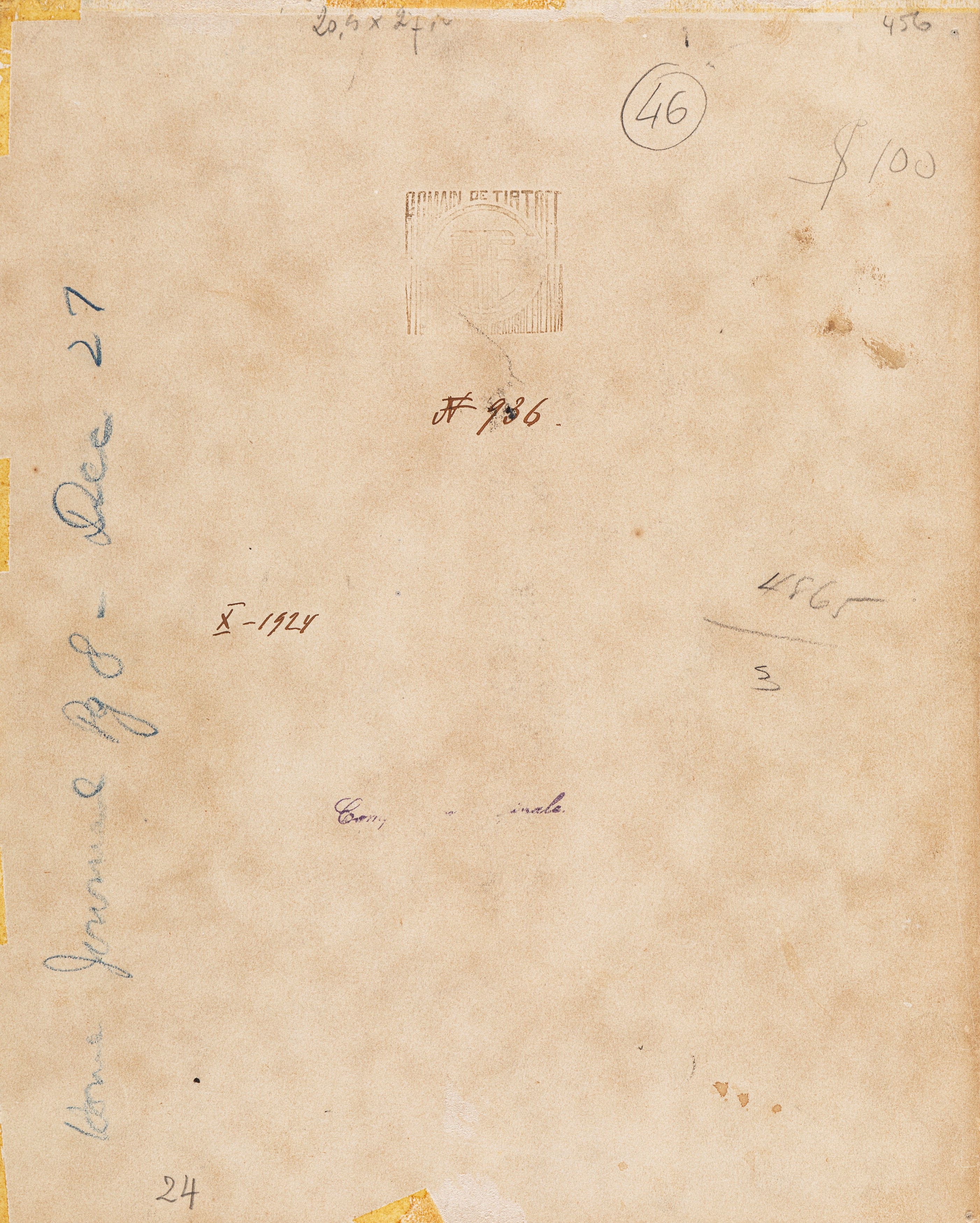Disegno originale realizzato da Erté nel 1924 per la celebre rivista Ladies’ Home Journal. Opera pubblicata nel volume "Erté: Cose che ricordo" edito da Edizioni La Bautta nel 1987. Recante al retro il timbro dell'artista e il numero d'archivio 936. Fori di affissione agli angoli. Firmato.