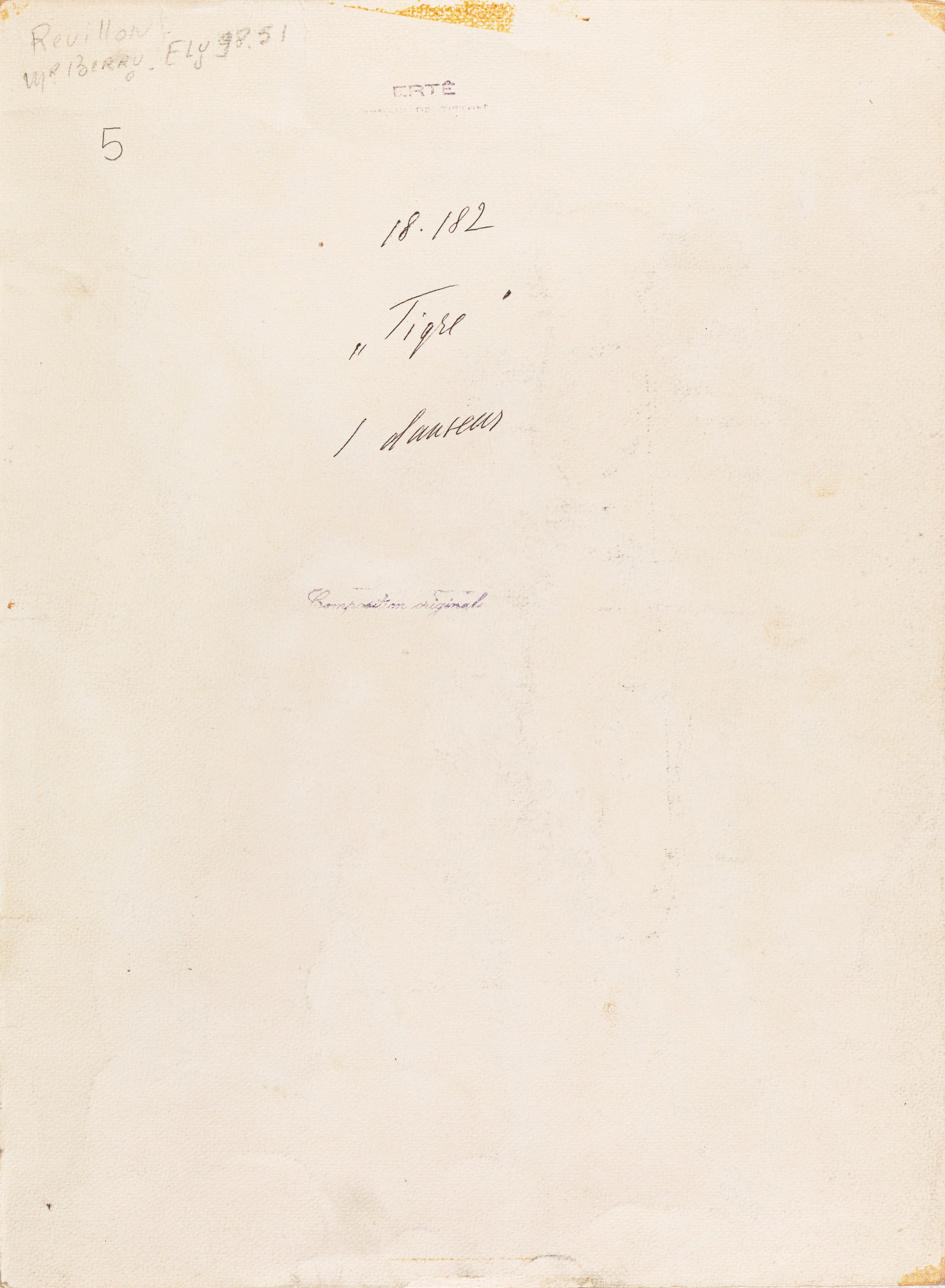 Disegno originale realizzato da Erté nei primi anni '70 per i costumi di una rappresentazione teatrale. Recante al retro il titolo, il timbro dell'artista e il numero d'archivio 18182. Lievi pieghe ai margini. Firmato.