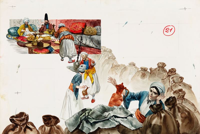 Illustrazione originale realizzata da Ferri per la fiaba "Alì Babà e i quaranta ladroni" edita nel 1966.