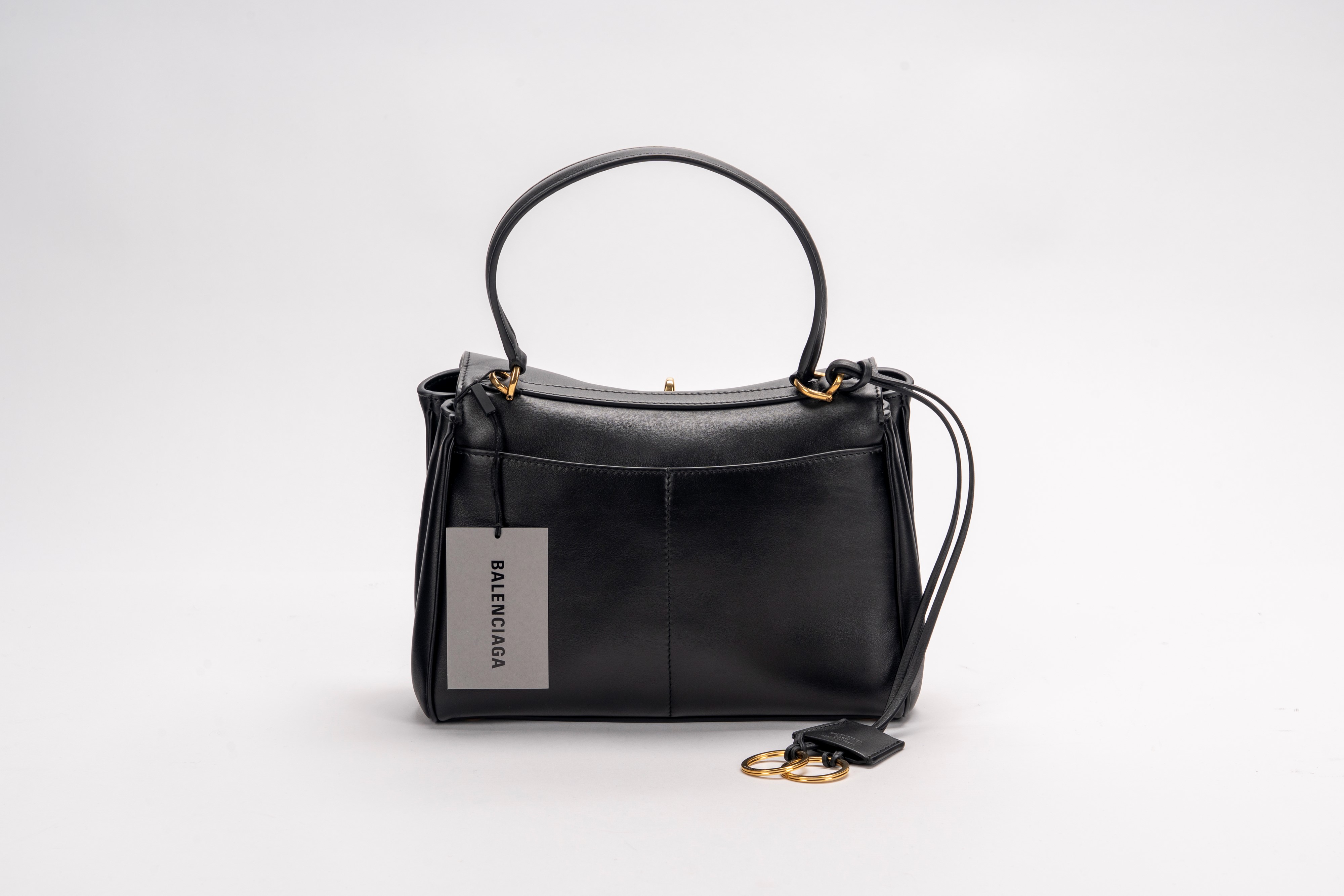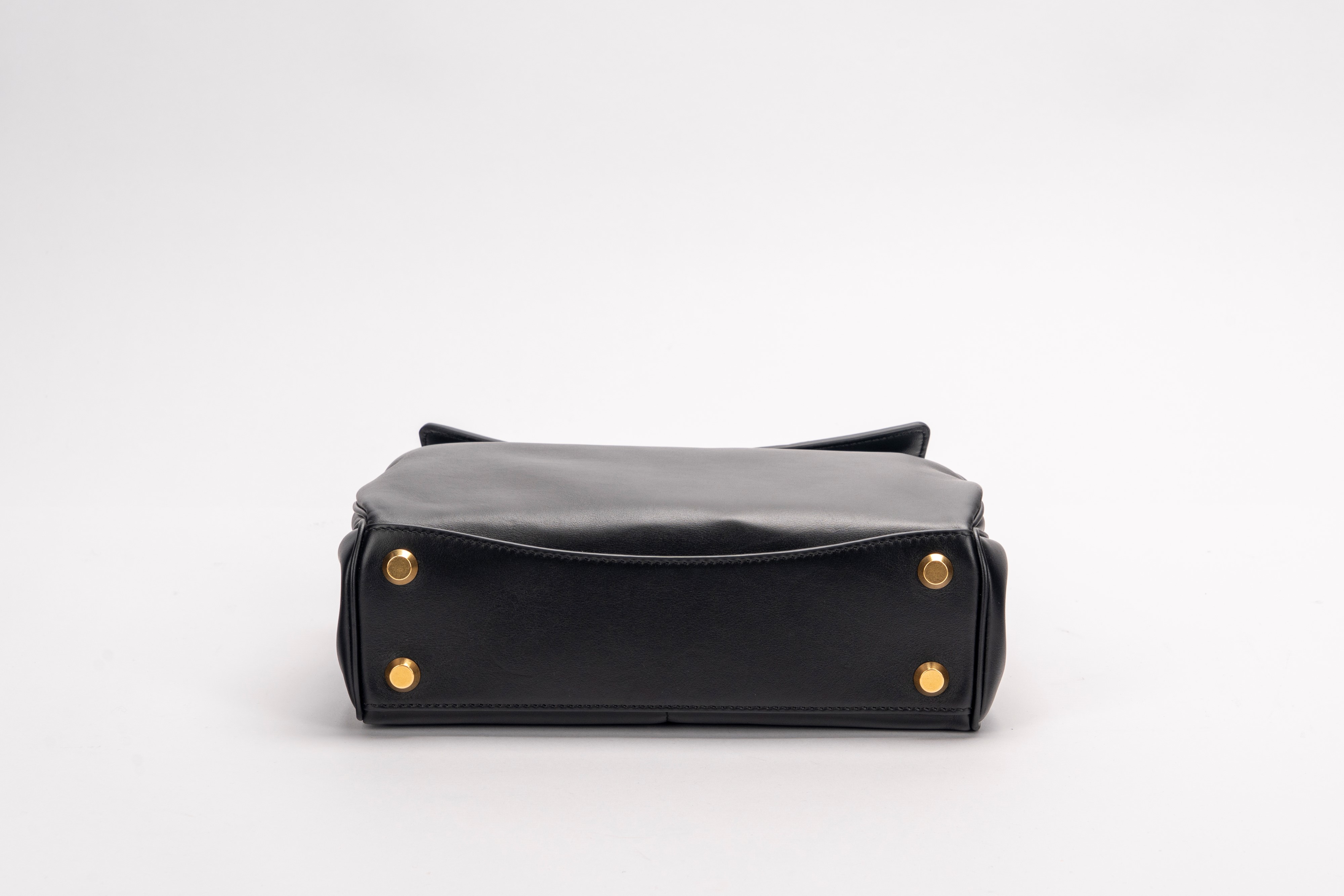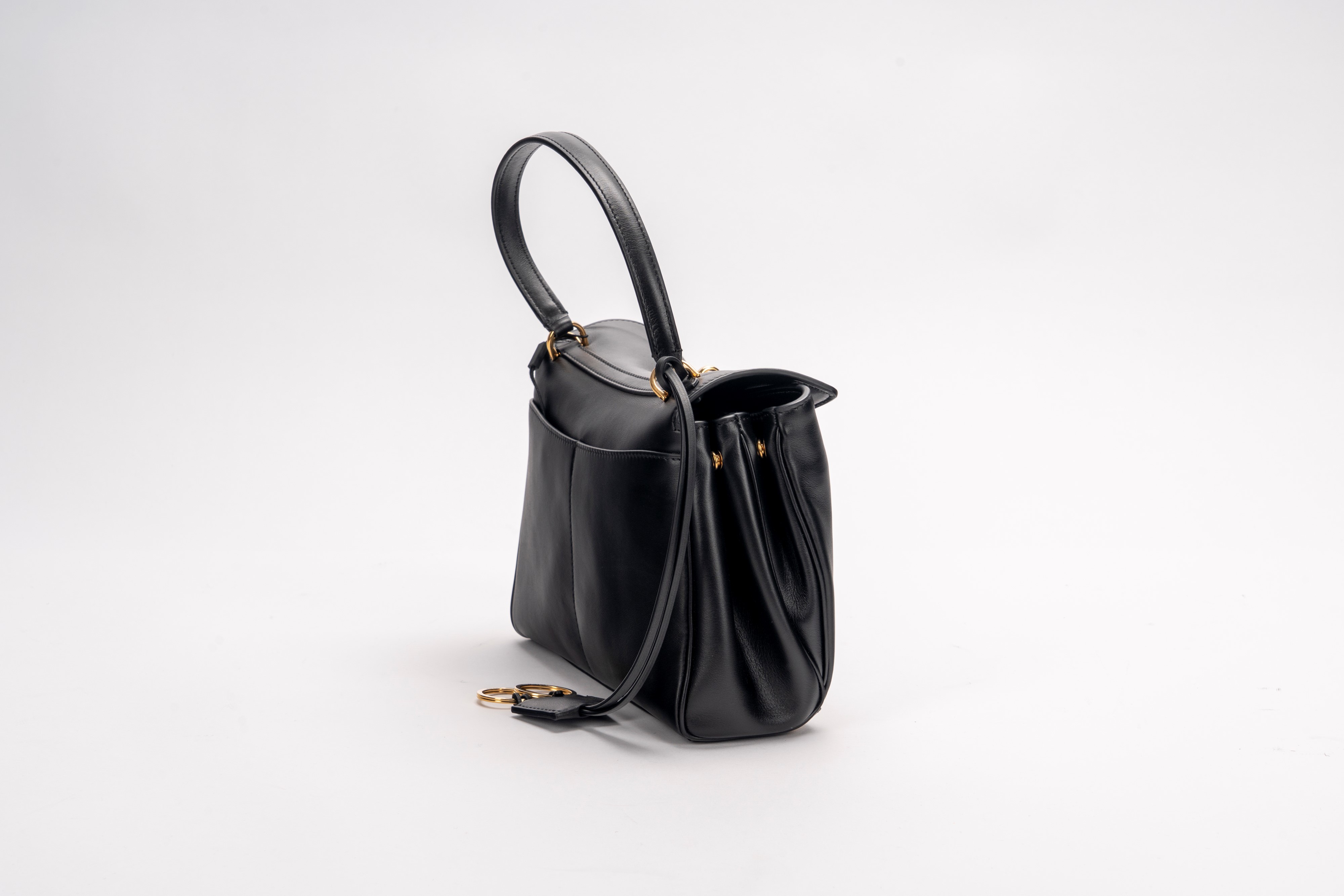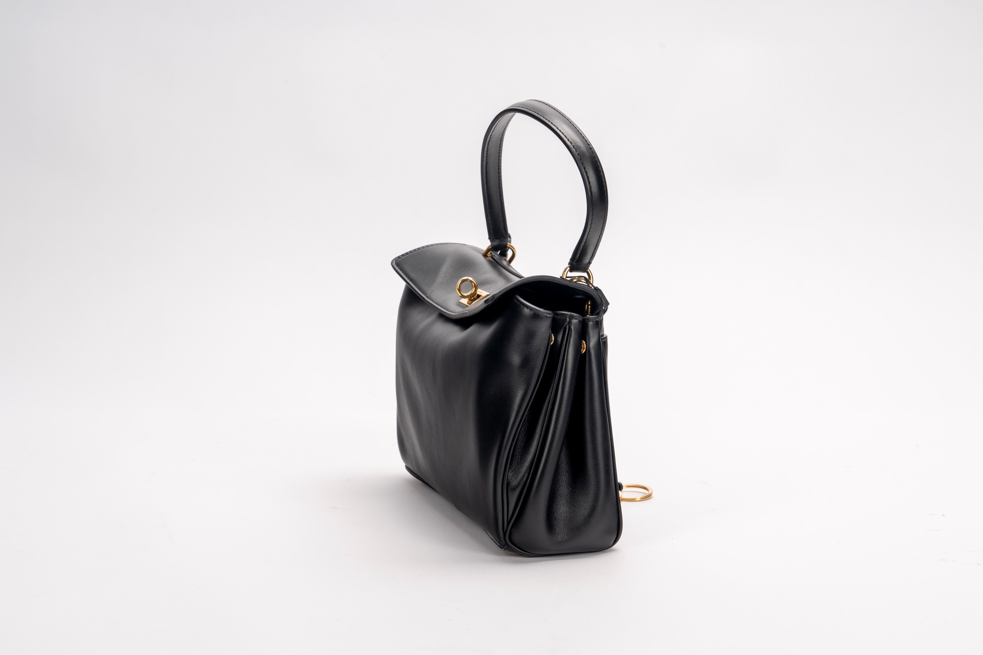 in pelle color nero, tracolla staccabile, dettagli in metallo dorato, cm 25, con sacchettoBase d'asta