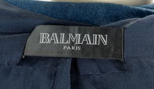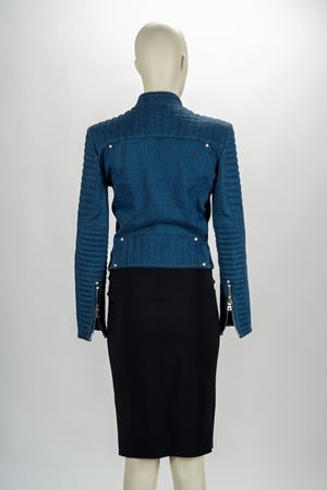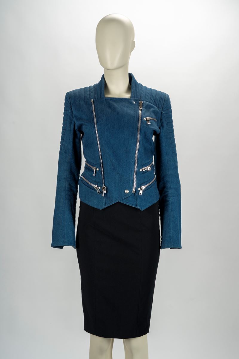 in tela denim color blu, maniche lunghe, dettagli a cerniera in metallo, spalline imbottite, taglia 36Gonna non inclusa