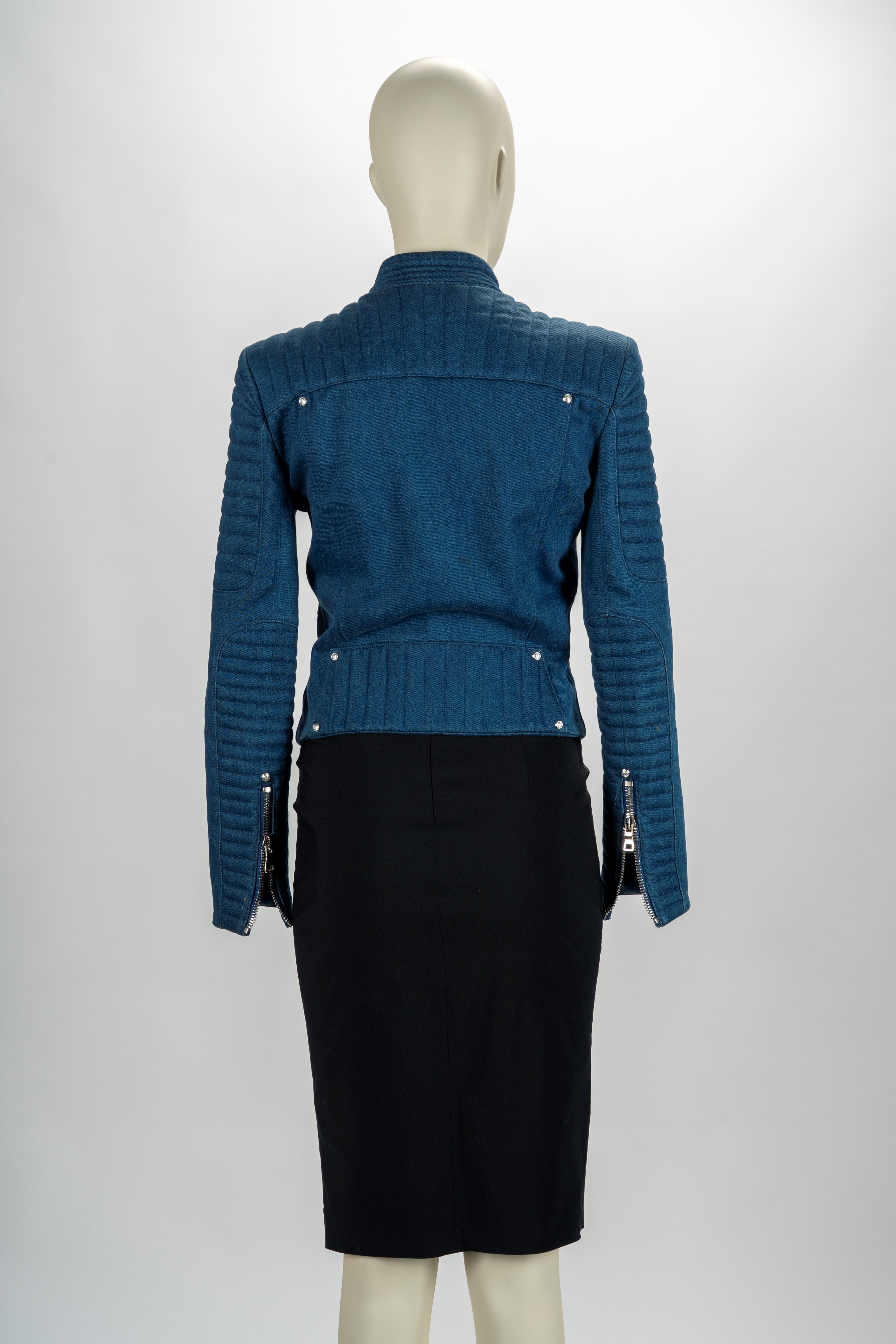 in tela denim color blu, maniche lunghe, dettagli a cerniera in metallo, spalline imbottite, taglia 36