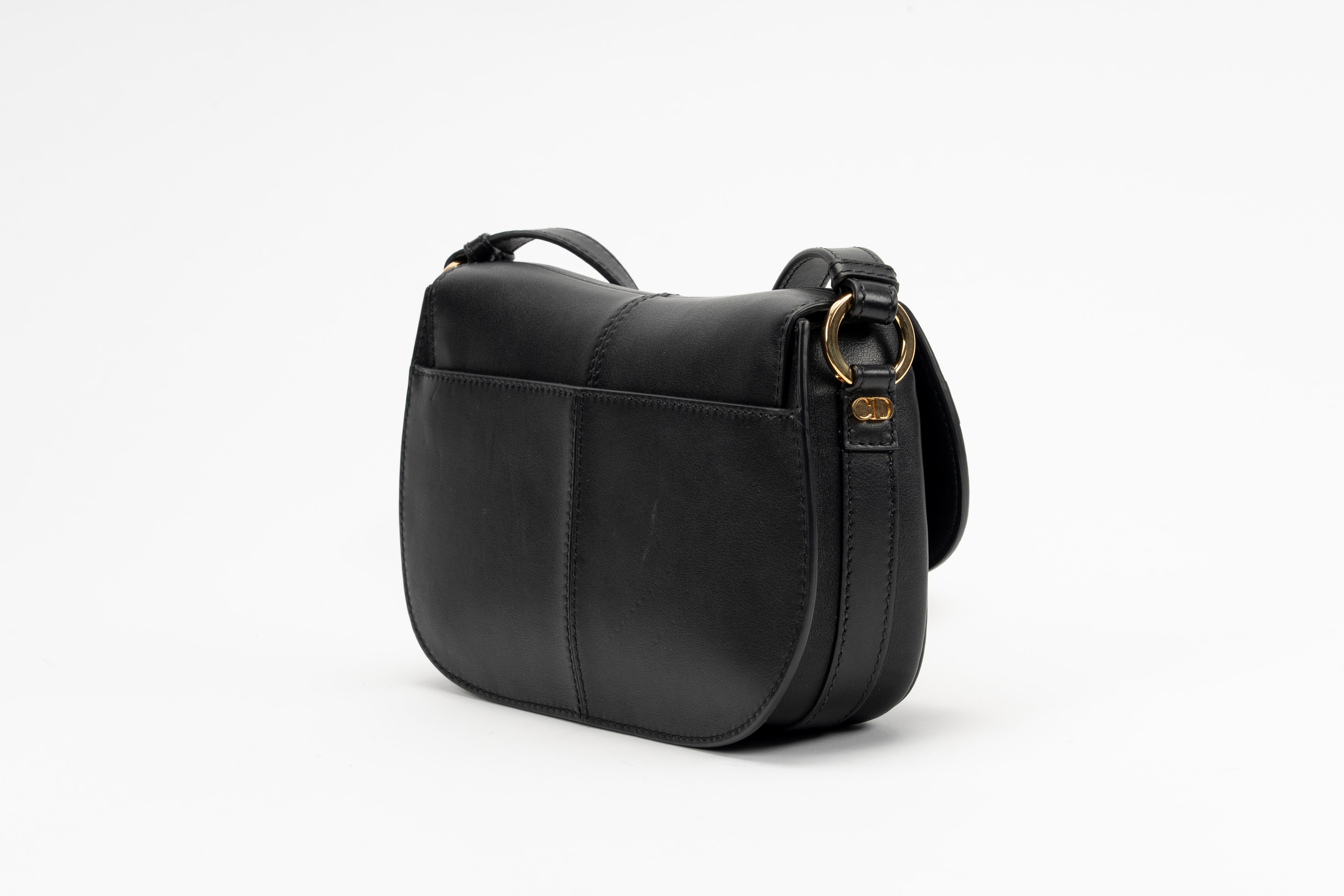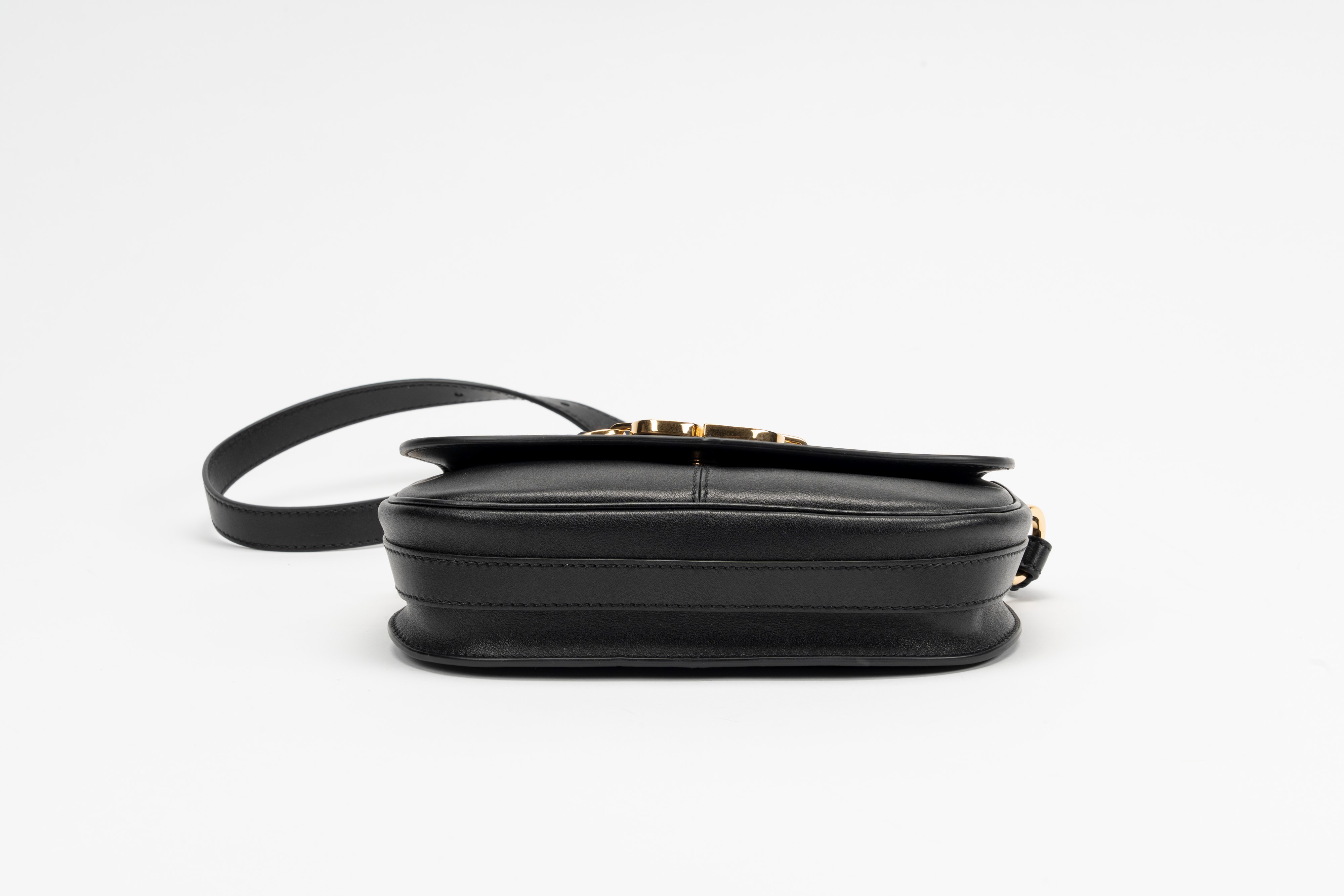 in pelle color nero, con tracolla regolabile, interno in camoscio, dettagli in metallo dorato, cm 24, con sacchetto (lievissimi segni d'uso)Base d'asta