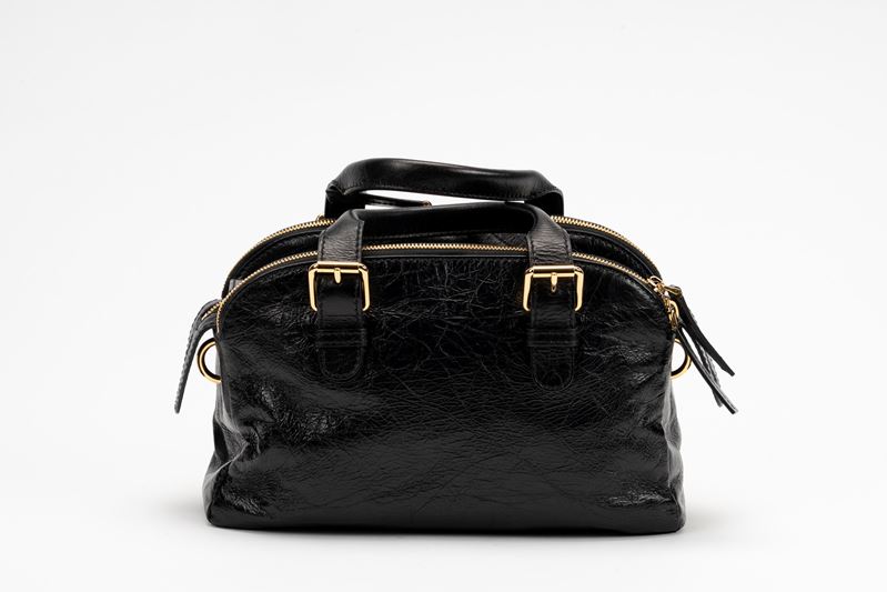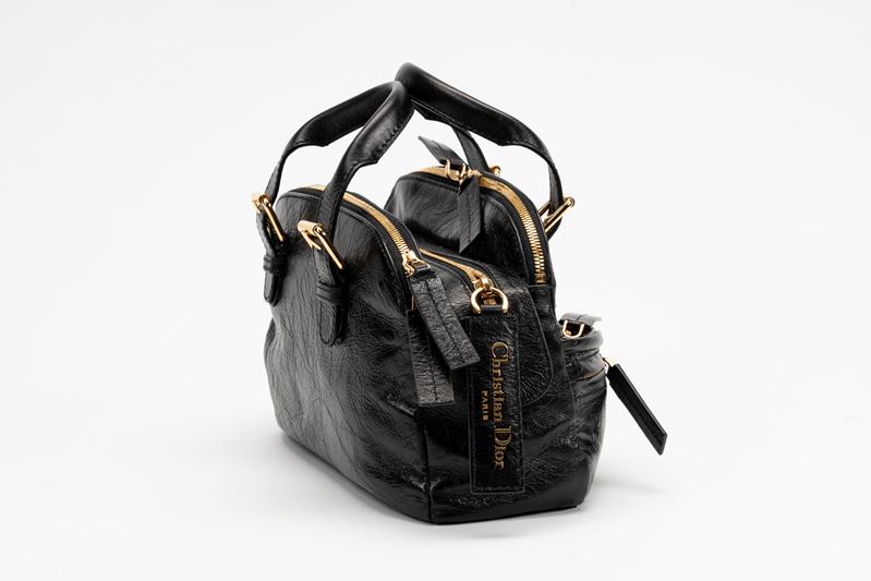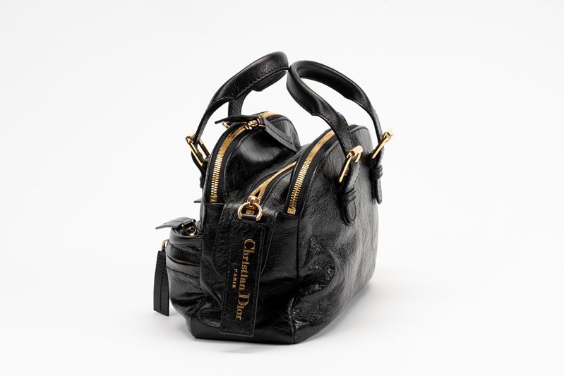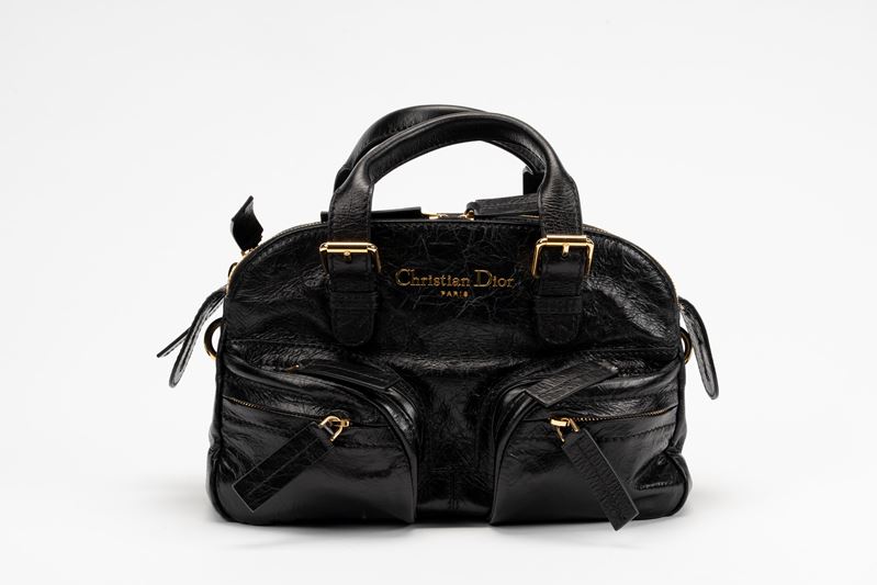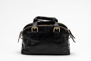 in pelle color nero, dettagli in metallo dorato, tracolla staccabile e regolabile, cm 28, con sacchettoBase d'asta