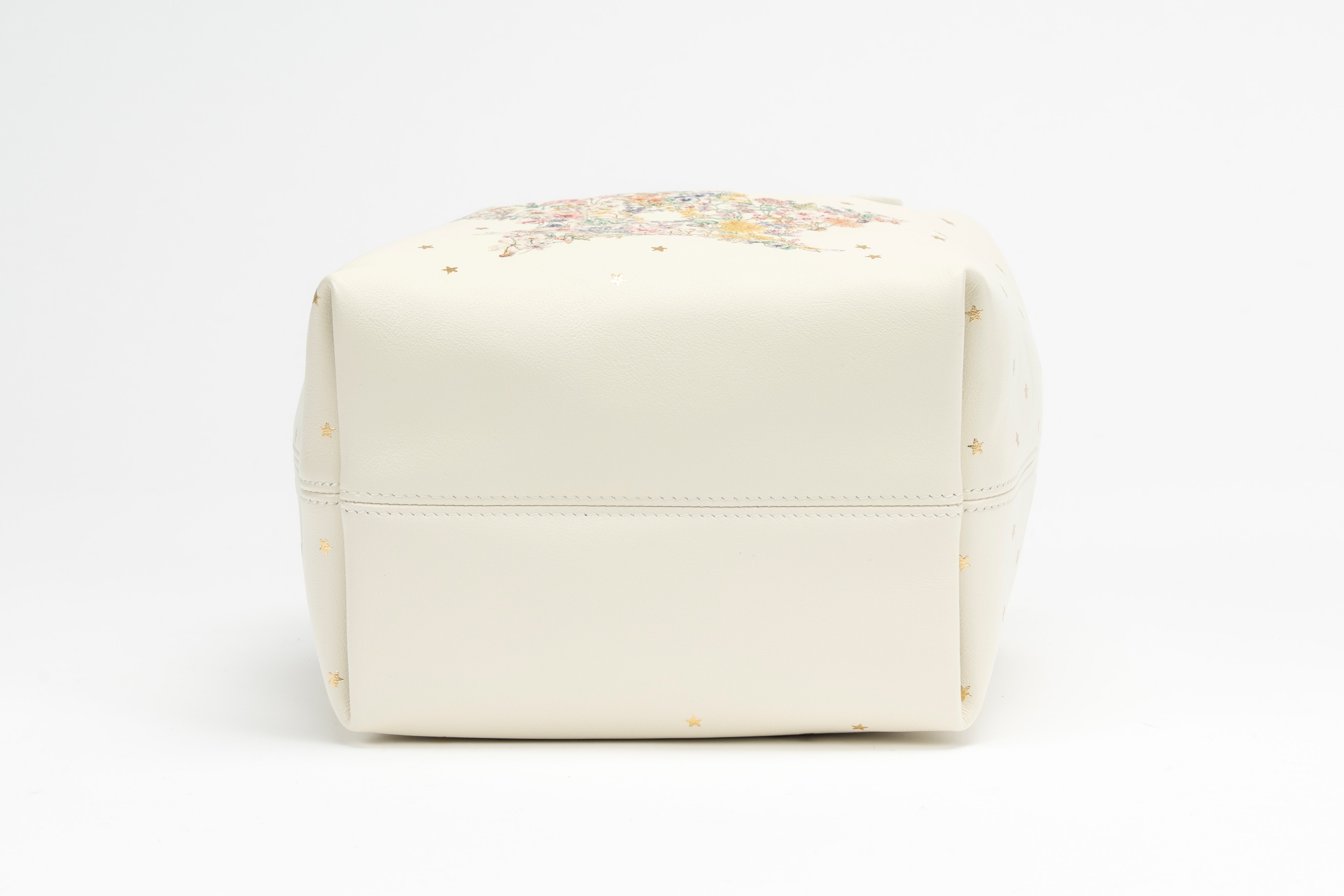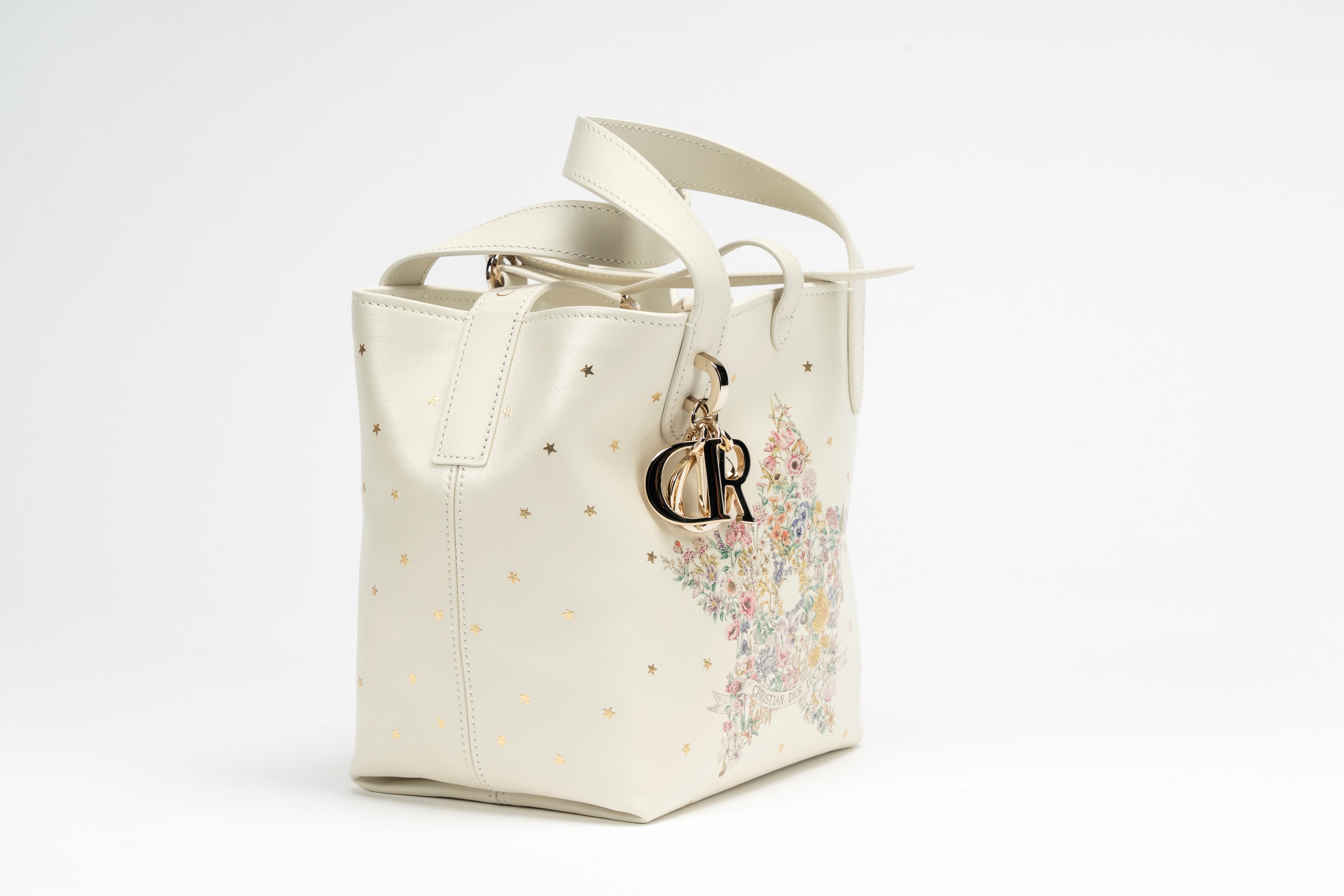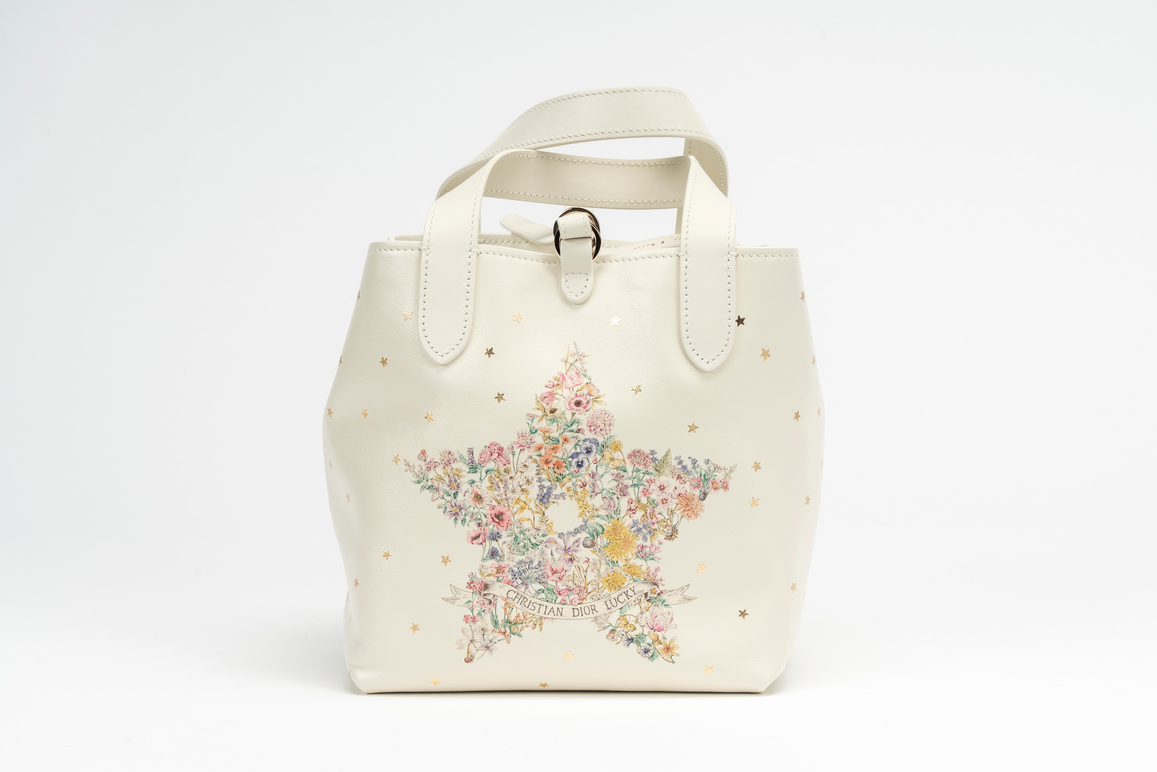 in pelle color latte e decor di Dior star multicolore, tracolla staccabile, dettagli in metallo, cm 17, con sacchettoBase d'asta