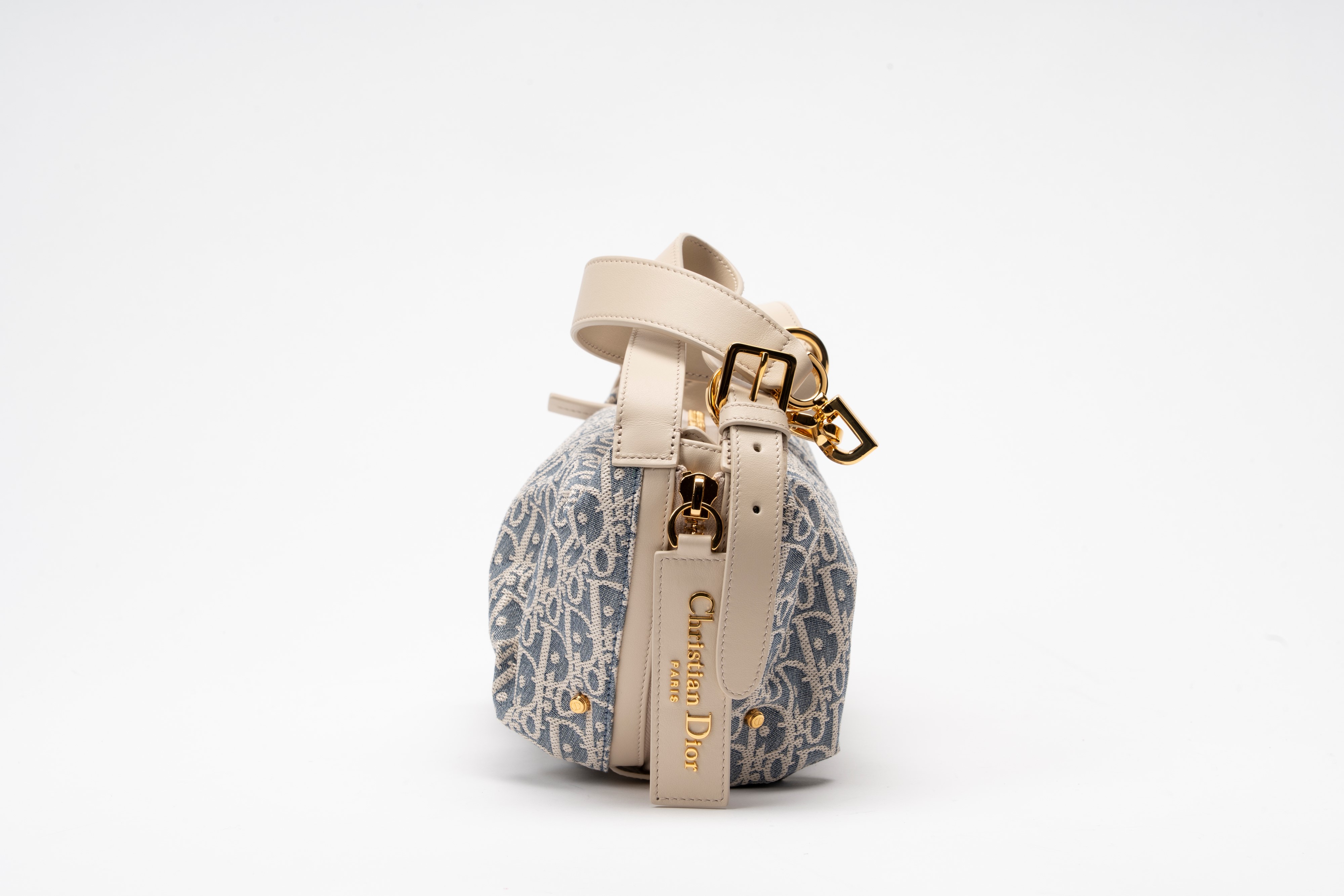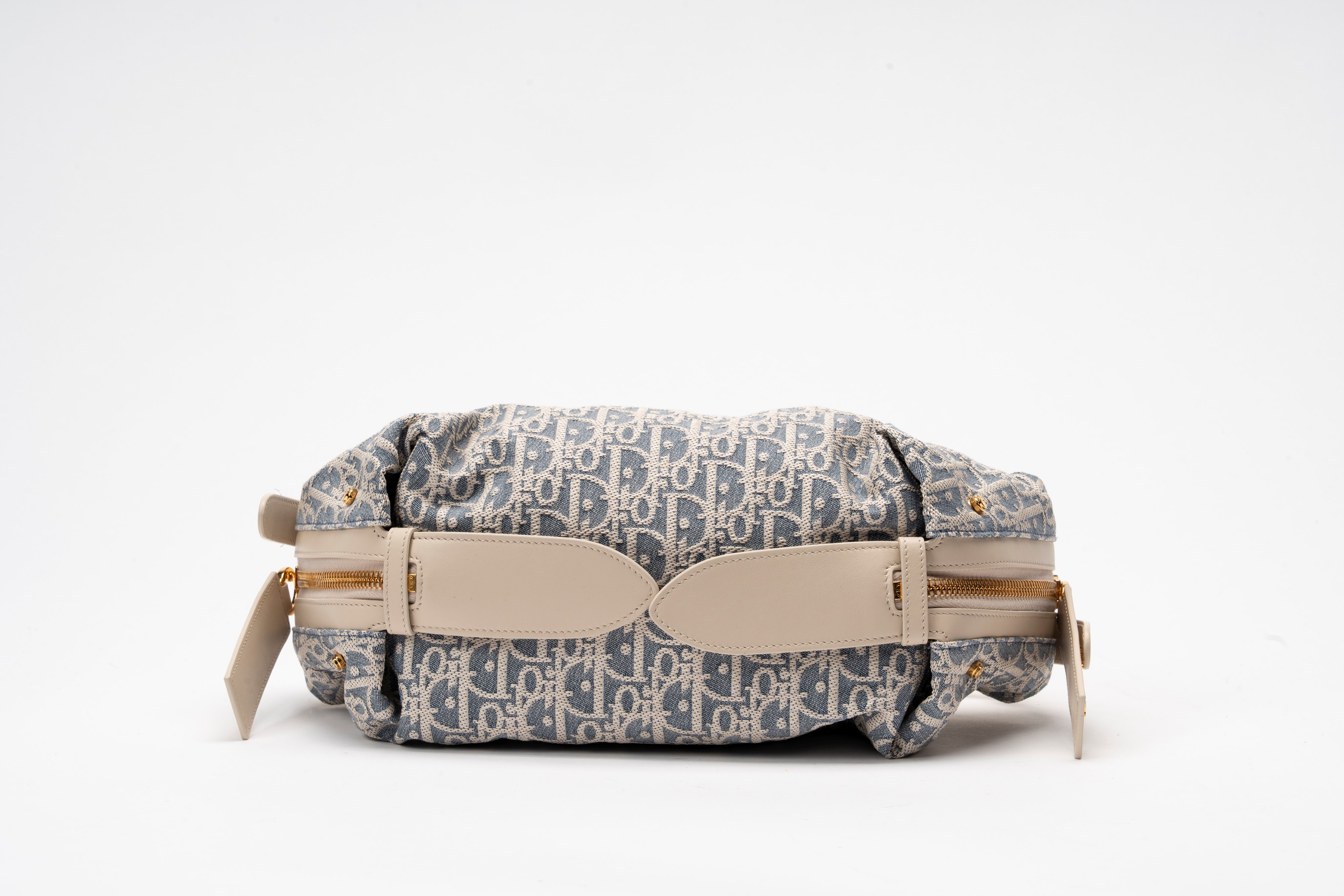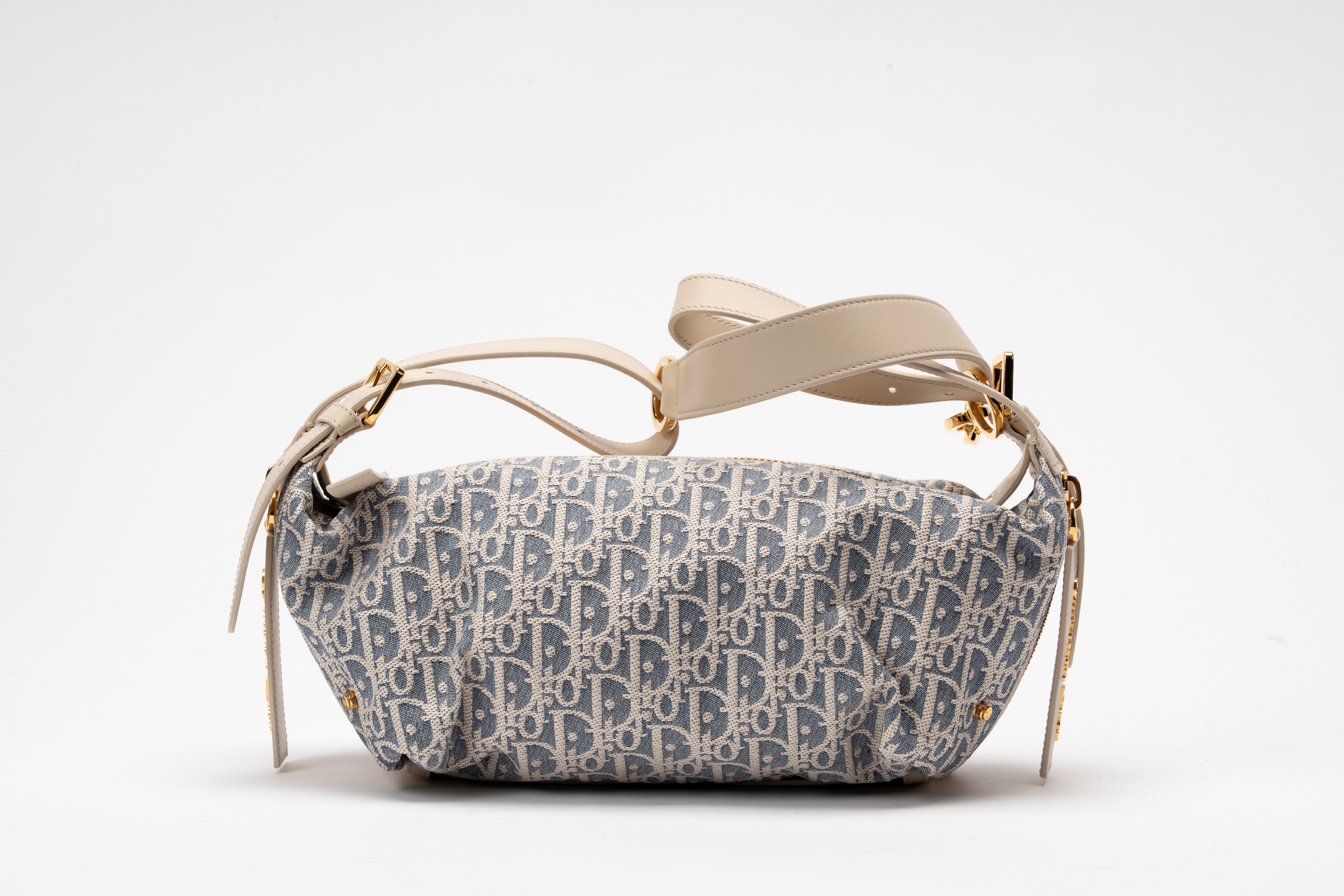 in tela Chambray Dior Oblique e pelle color beige, con tracolla regolabile, dettagli in metallo dorato, cm 23, con sacchettoBase d'asta