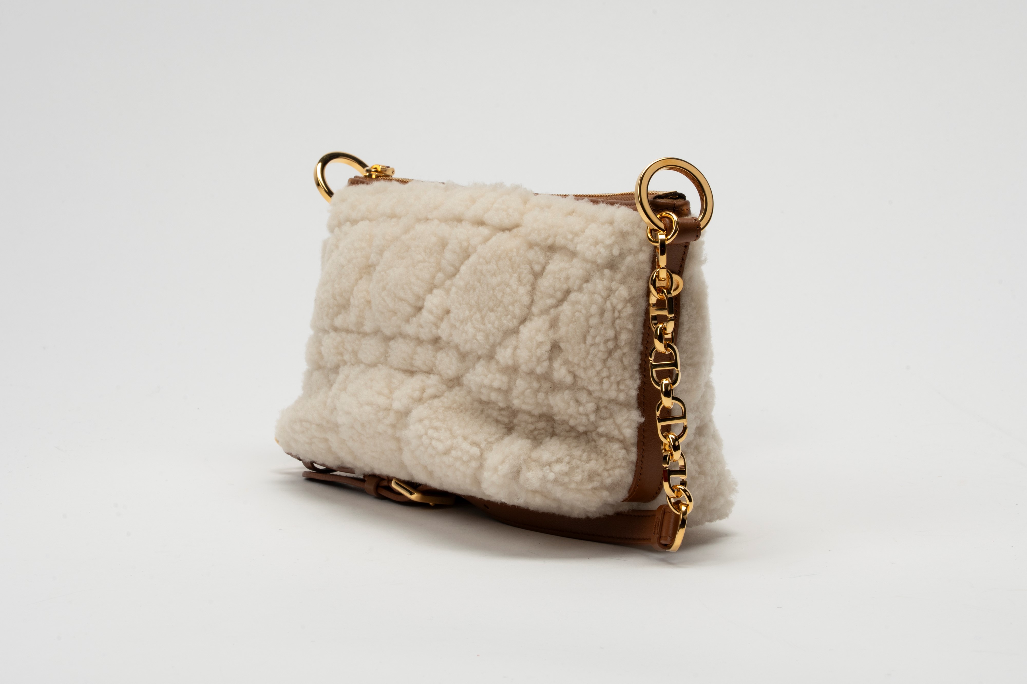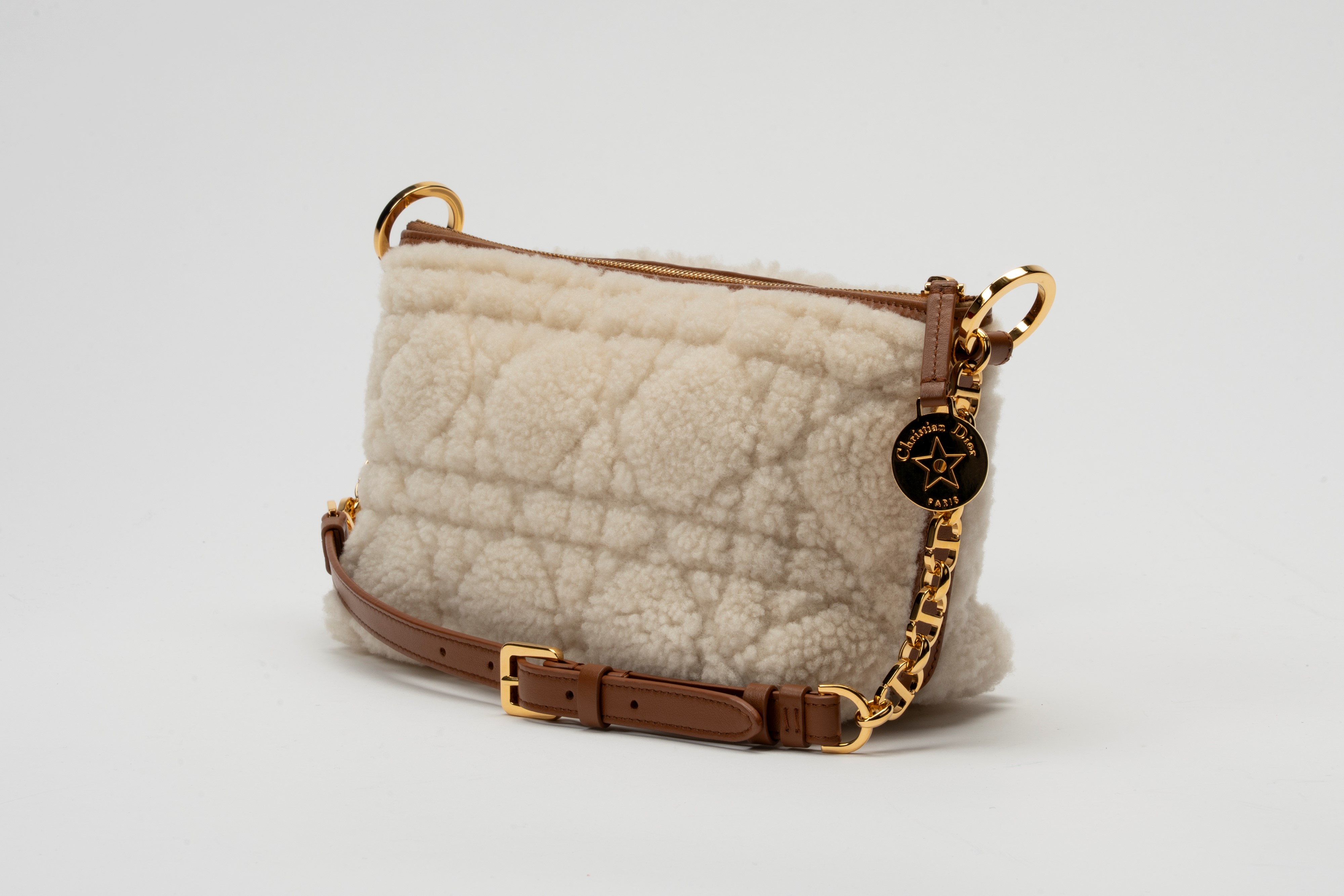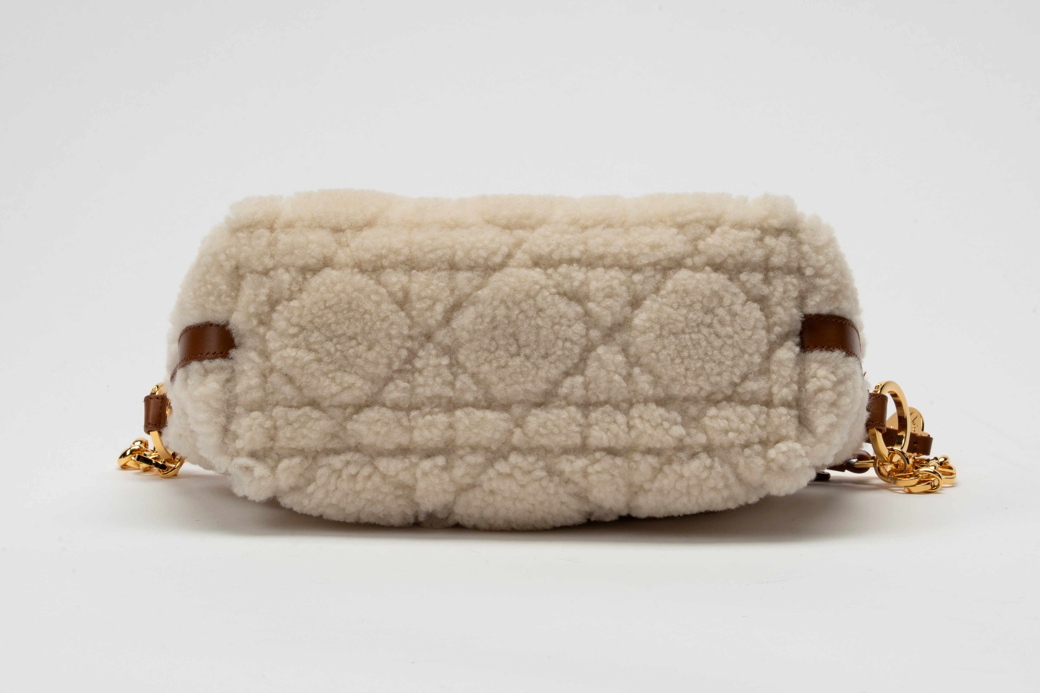 in montone cannage color écru e pelle color nocciola, interno in camoscio, tracolla a catena e pelle, dettagli in metallo dorato, cm 22, con sacchettoBase d'asta