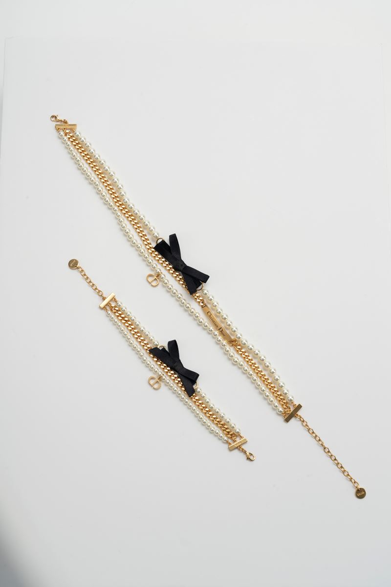 in metallo dorato e perle fancy con fiocchi, cm 35 collana, cm 20 bracciale, con sacchetti
