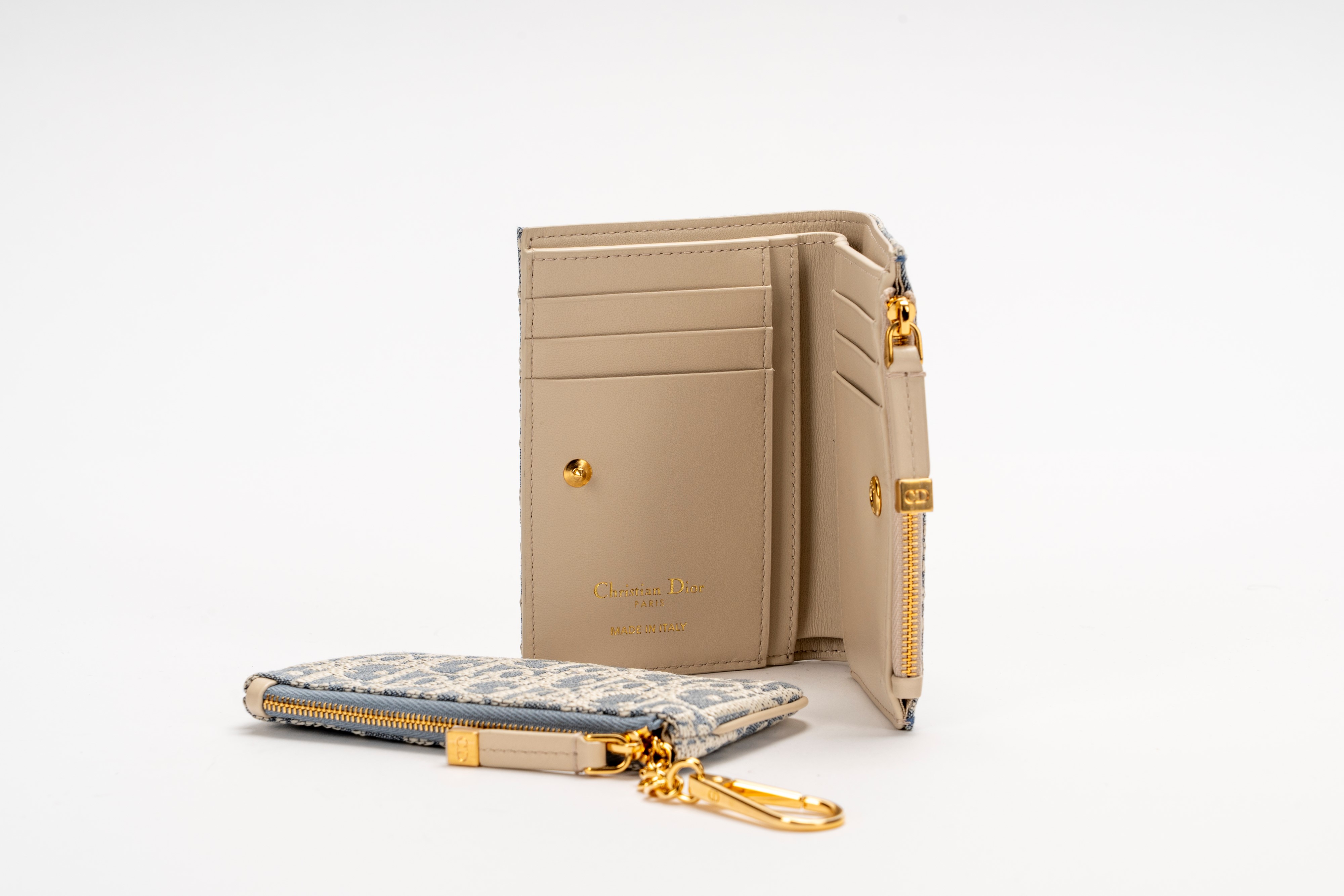 in tela Chambray Dior Oblique color blu e pelle color beige, dettagli in metallo dorato, cm 12 e cm 13, con sacchettiBase d'asta