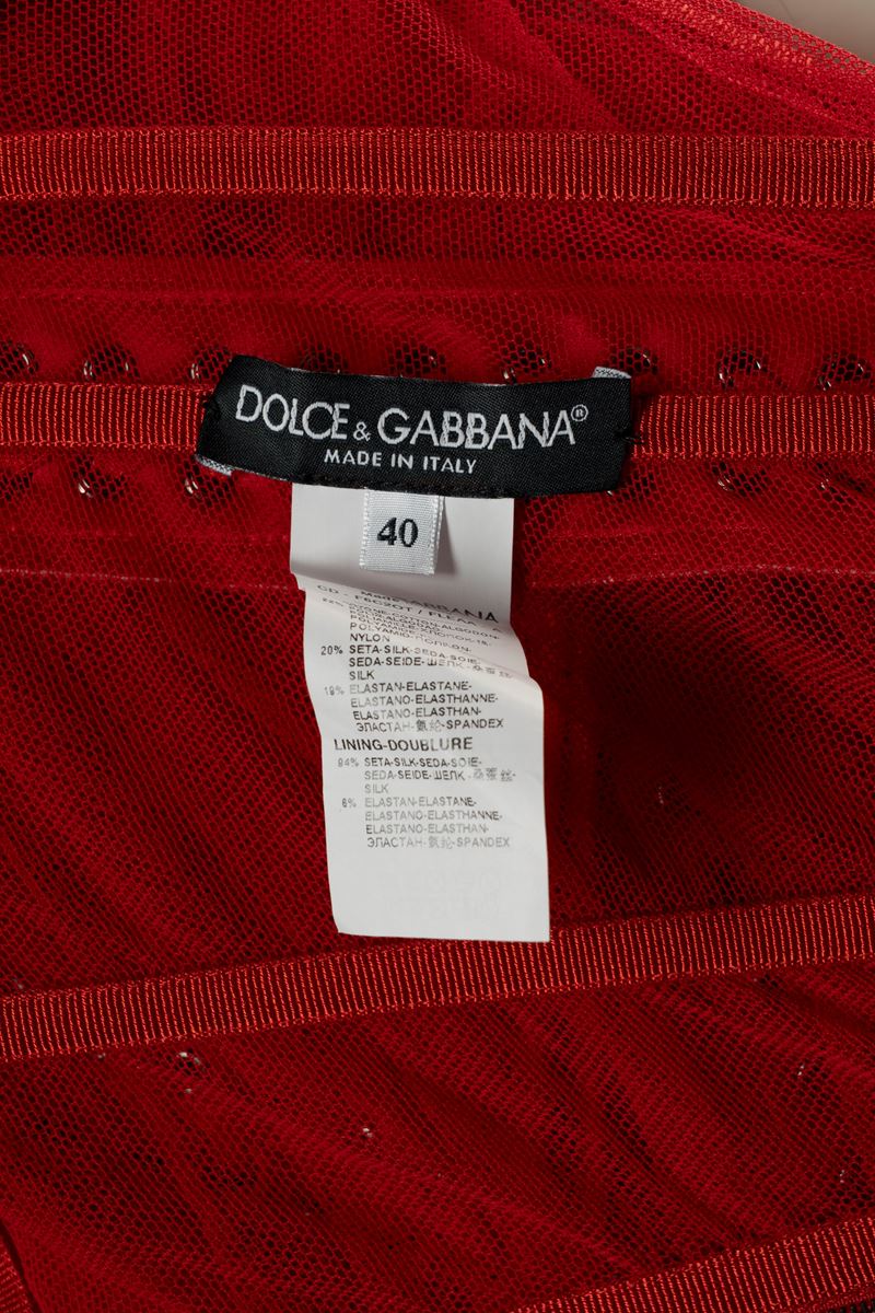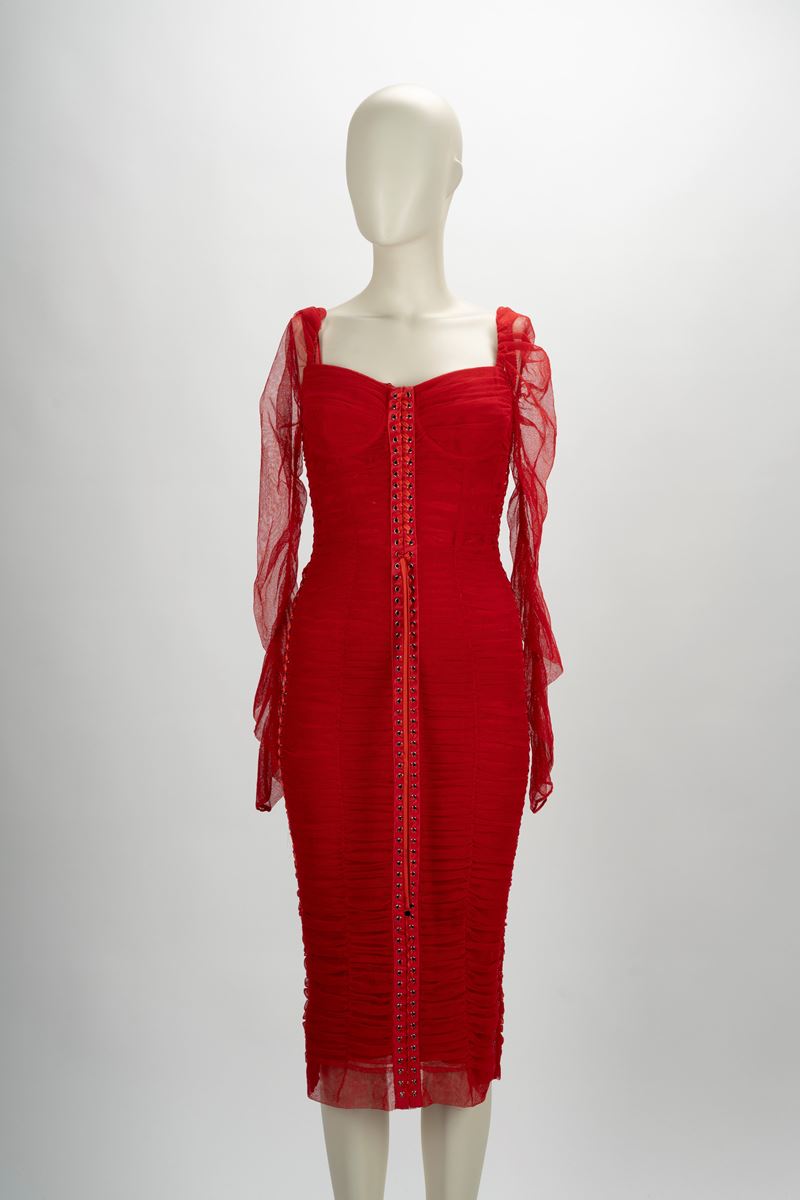 in cotone e tulle arricciato color rosso, maniche lunghe con sottoveste in raso di seta, taglia 40 (scucitura sulla spalla destra)