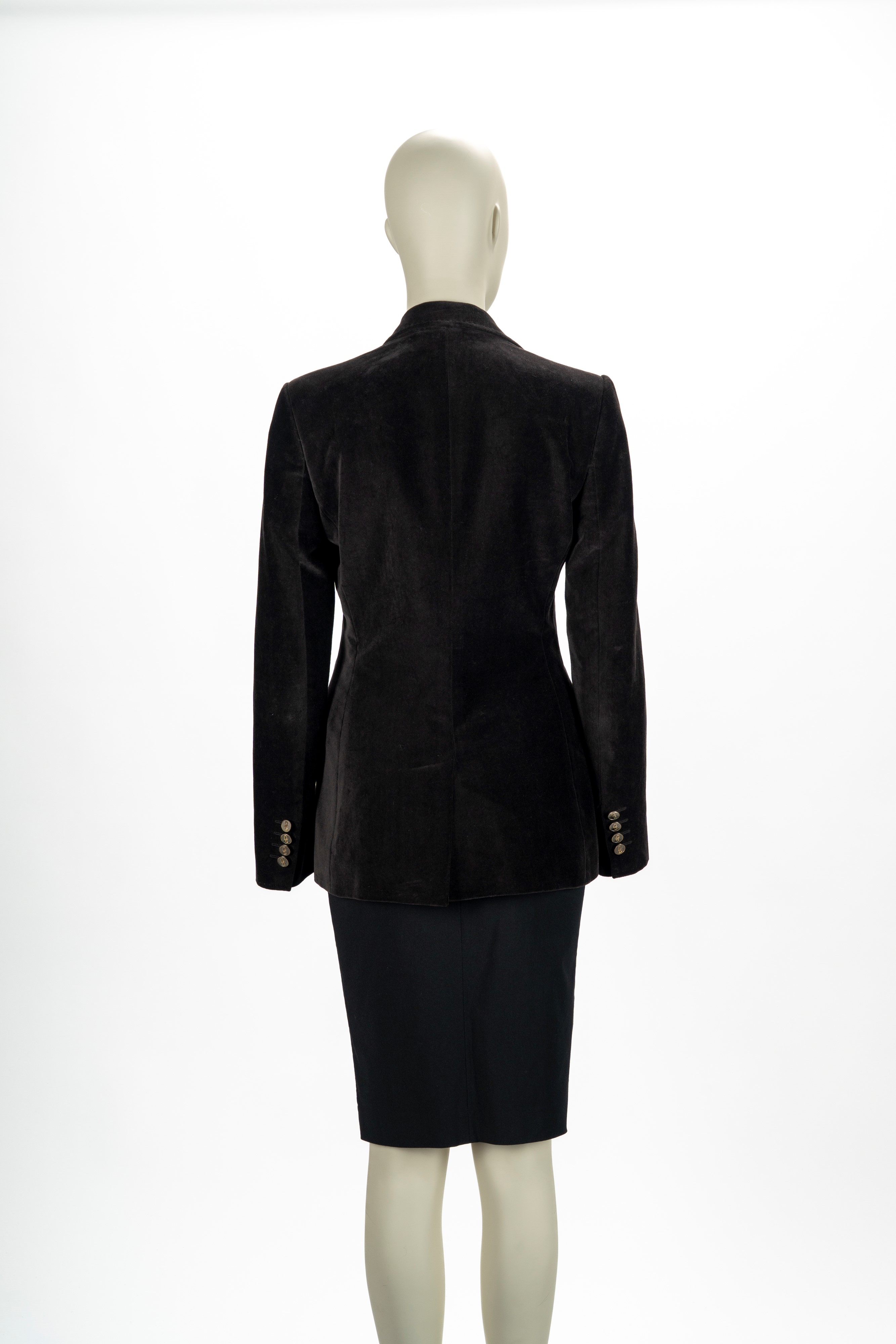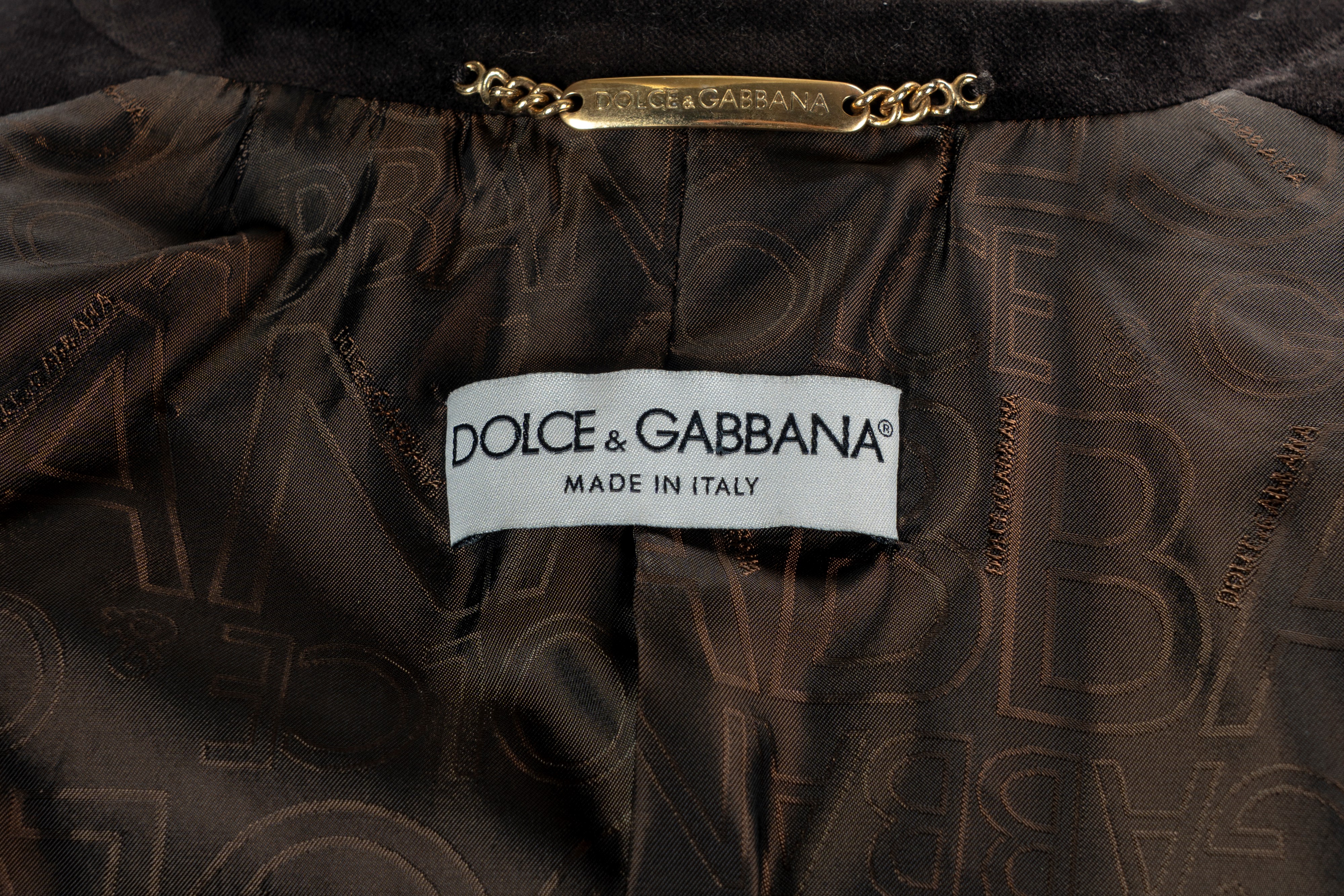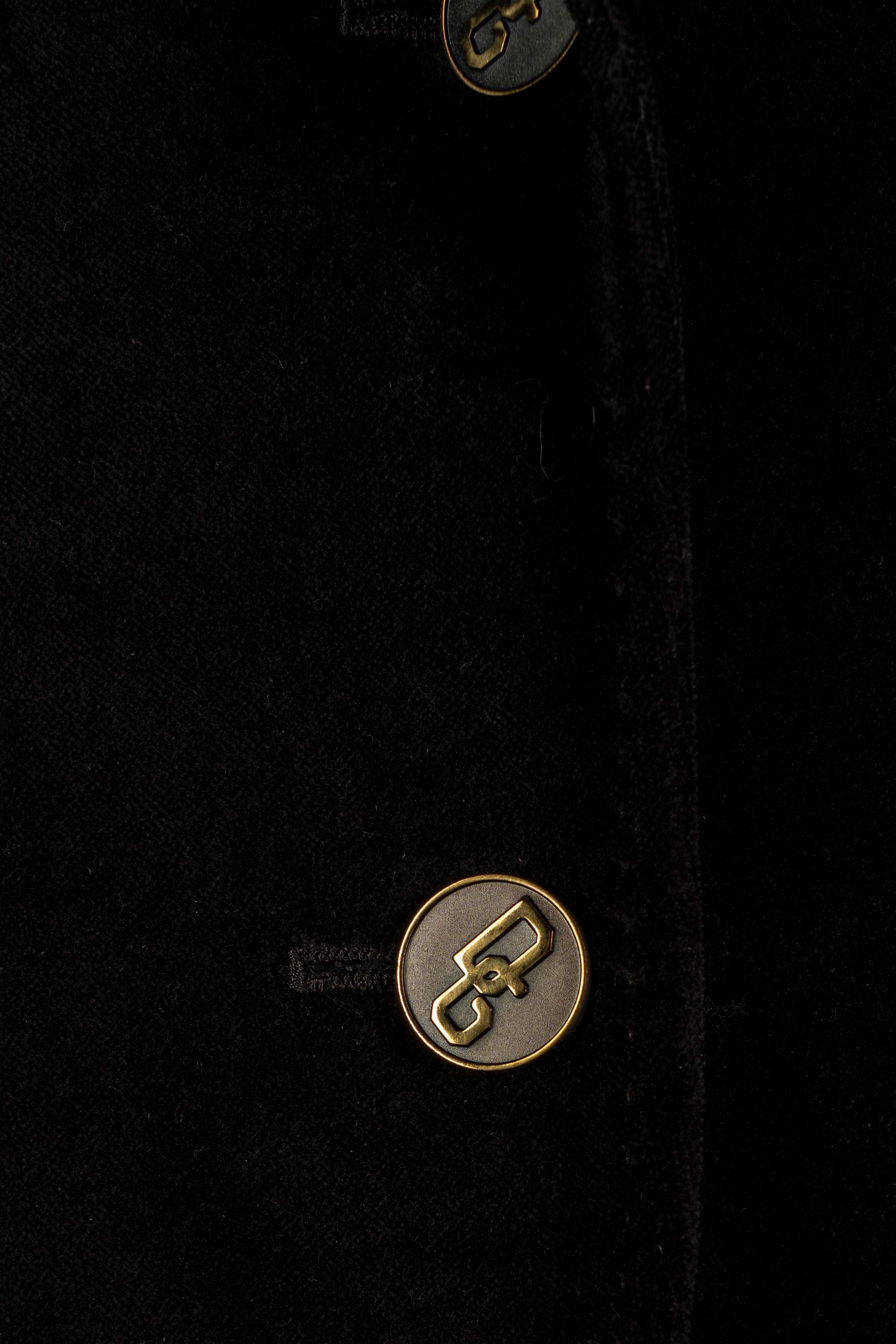 in velluto color testa di moro, fodera e bottoni in metallo logati, taglia 40 (lievissimi segni d'uso)