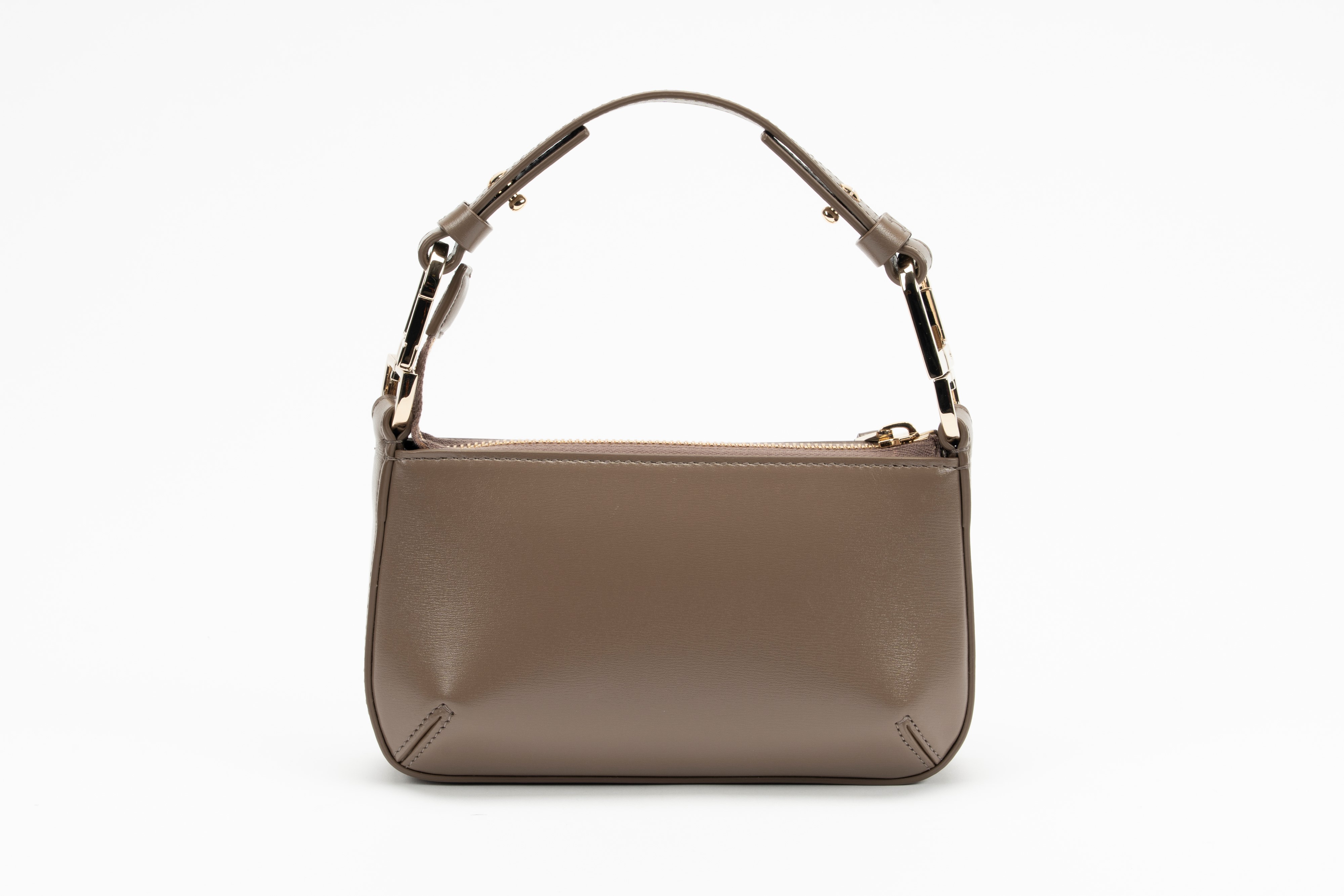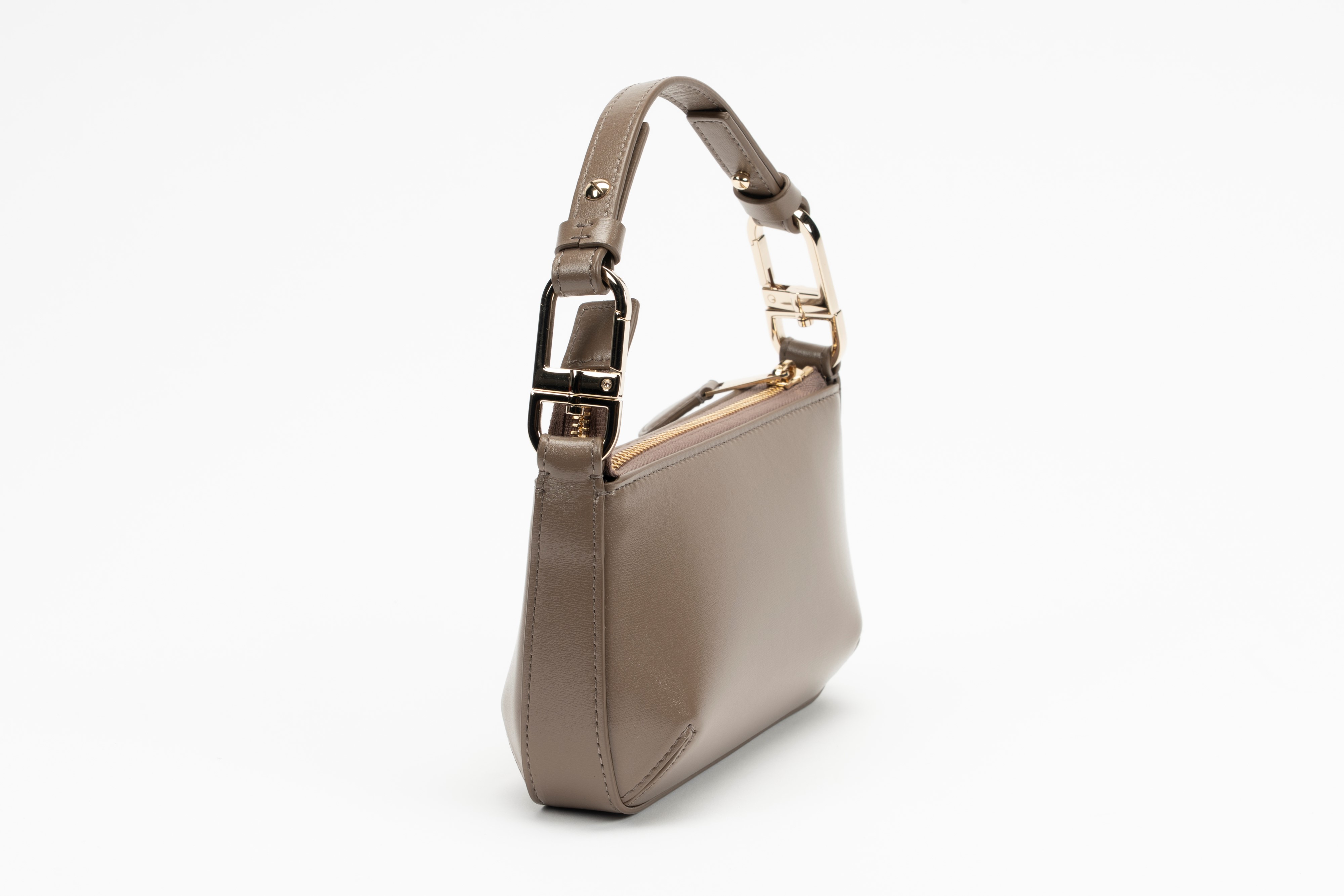 in pelle color greige, tracolla staccabile, dettagli in metallo dorato, cm 18, con sacchetto