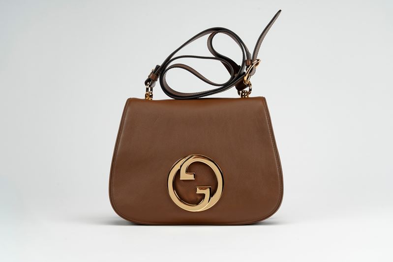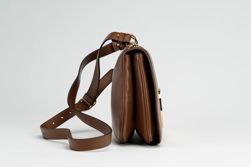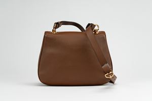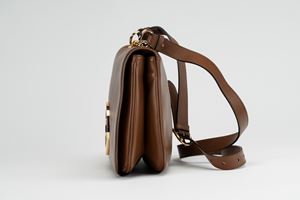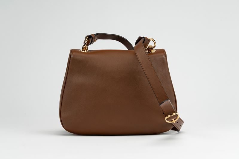 in pelle color marrone, manico staccabile e doppio tracolla in pelle e tessuto a banda web, dettagli in metallo dorato, cm 30, con sacchetto (lievissimi segni d'uso)