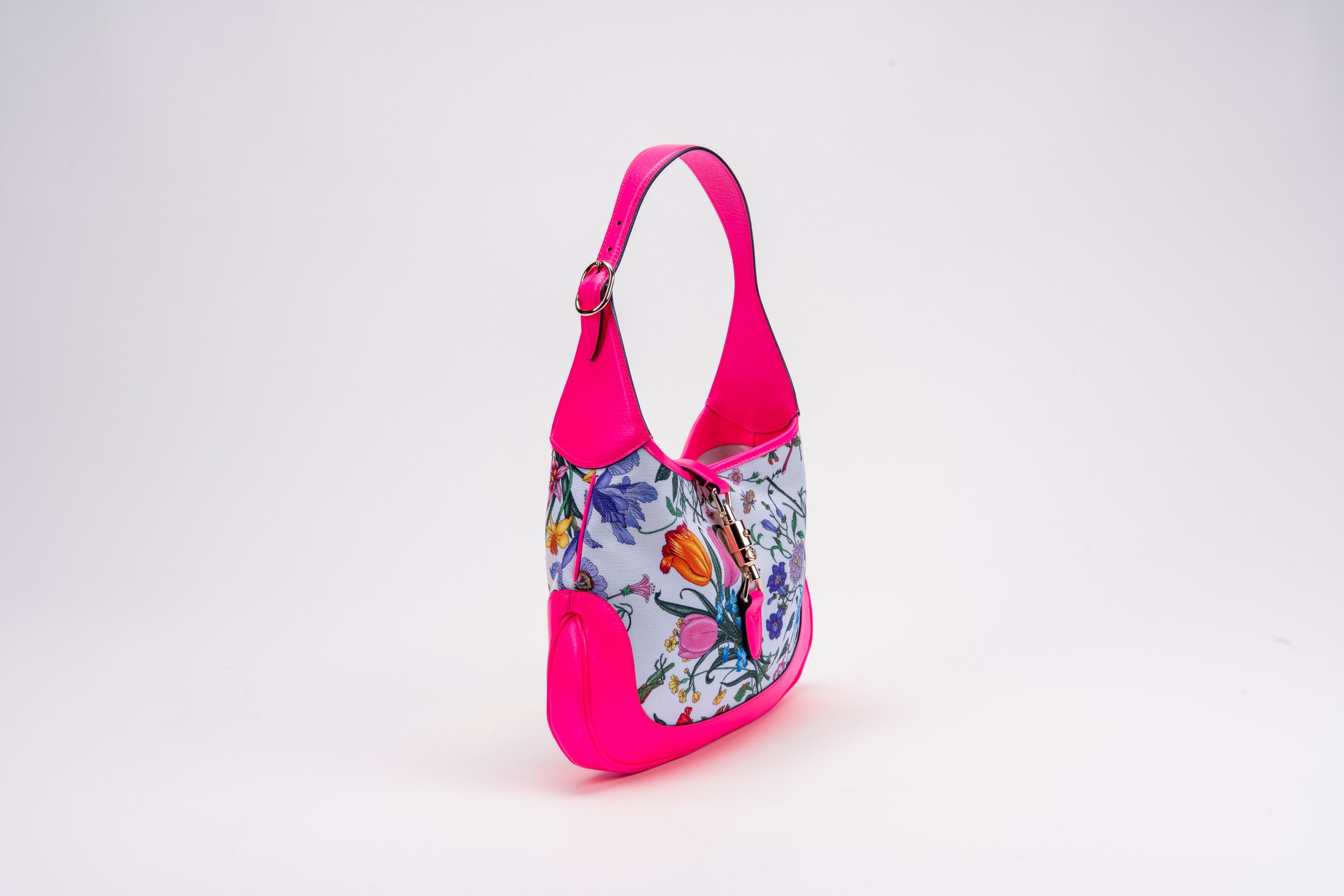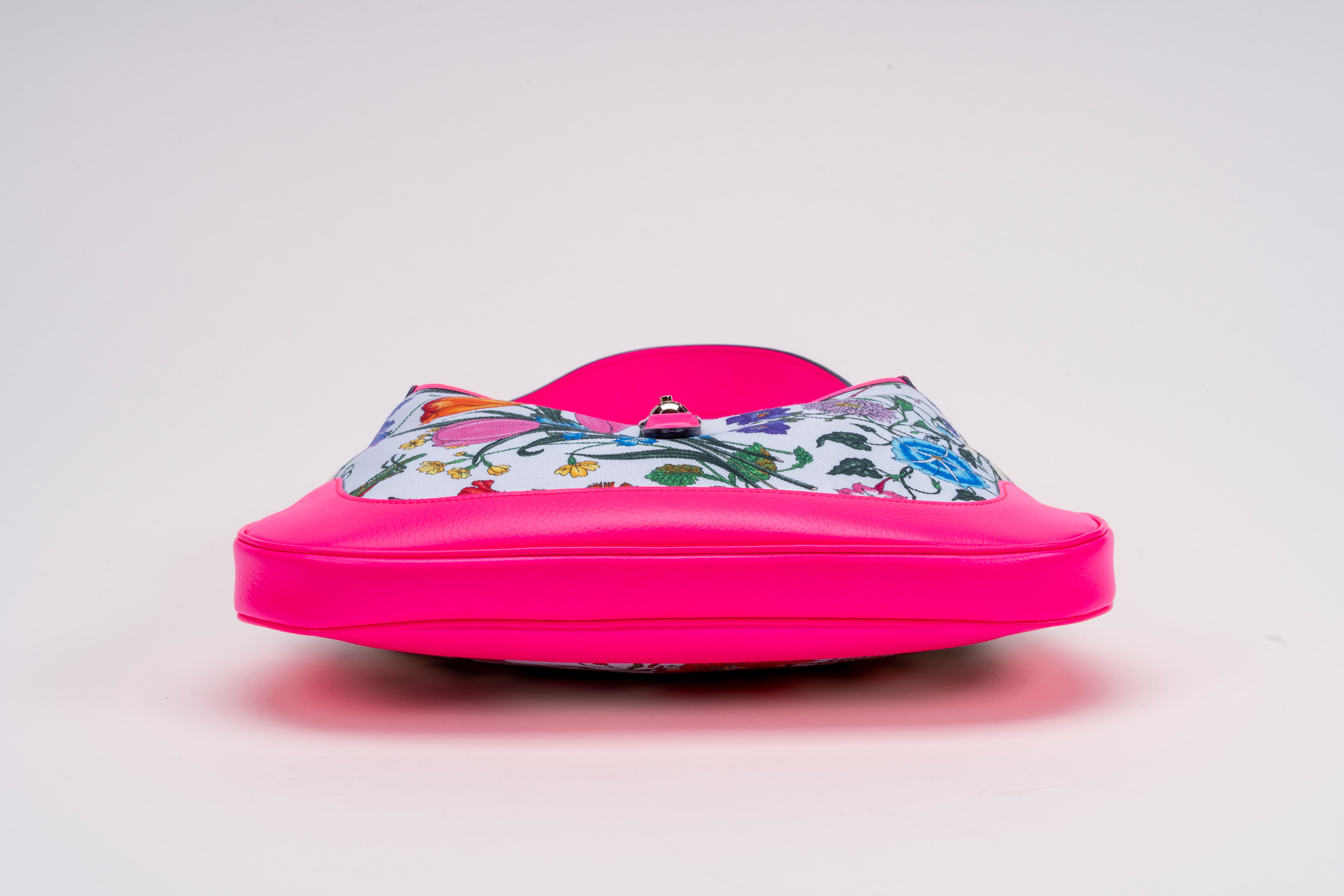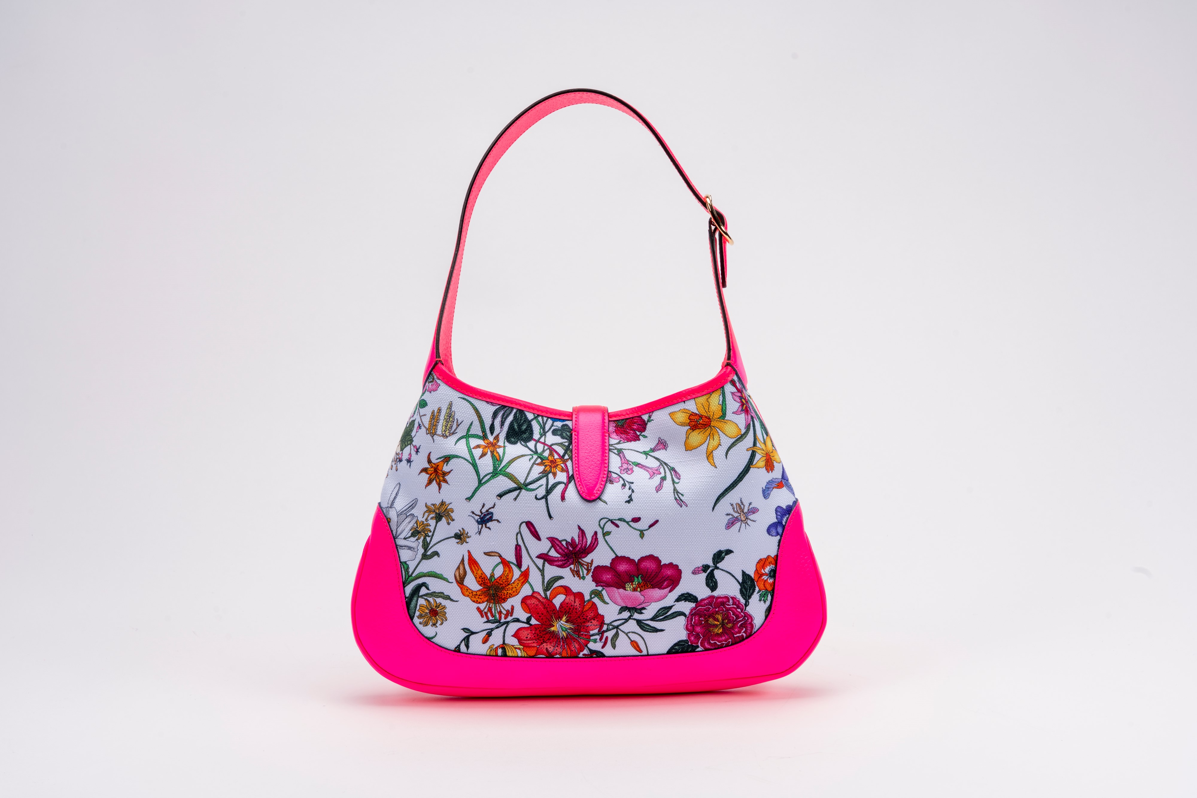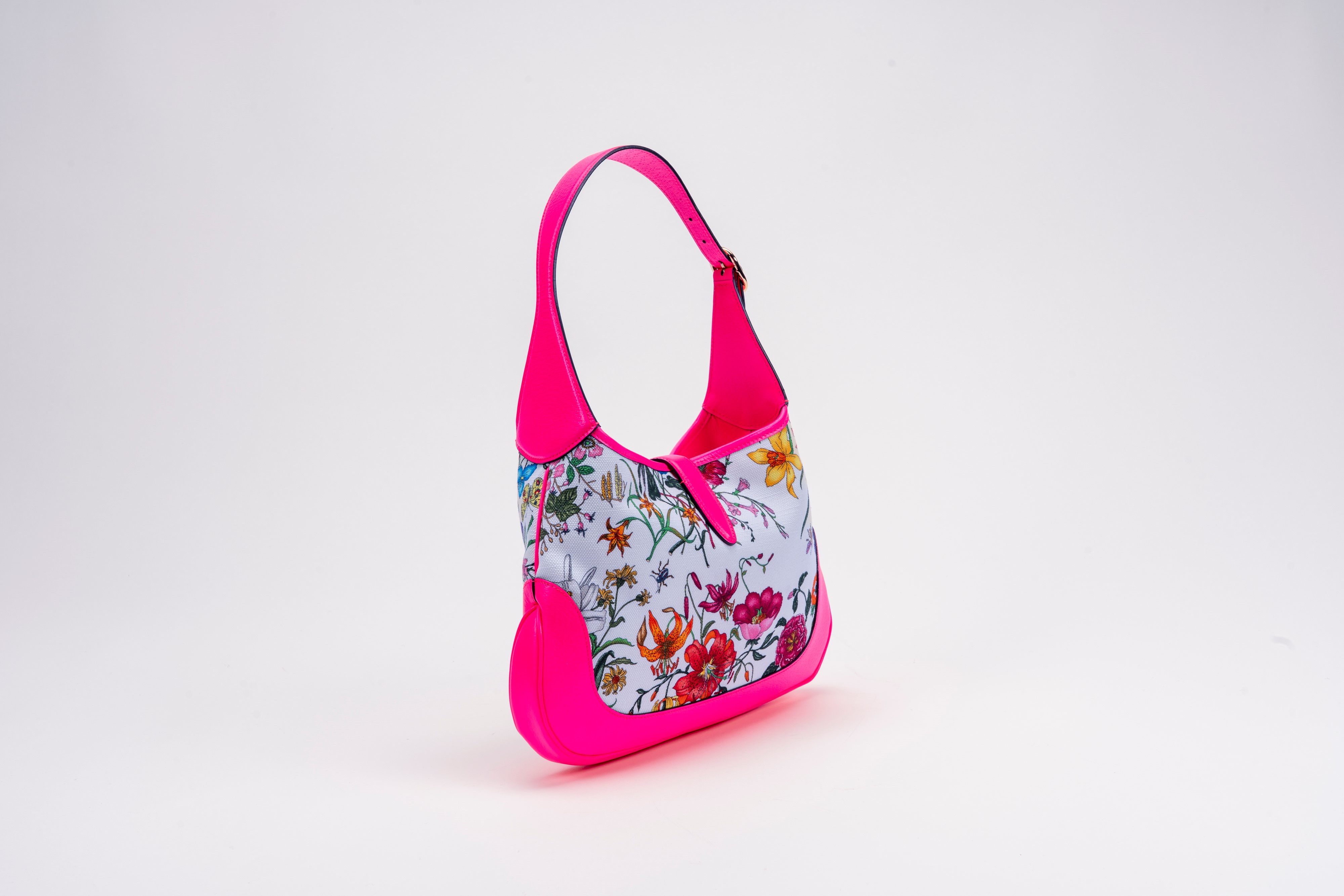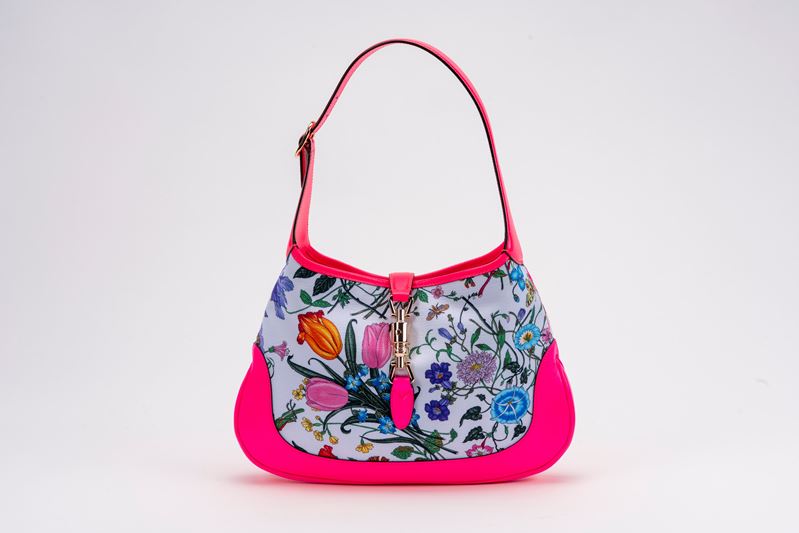in tessuto stampa Flora, profili in pelle di cinghiale color rosa fluo, dettagli in metallo dorato, cm 32, con sacchettoBase d'asta