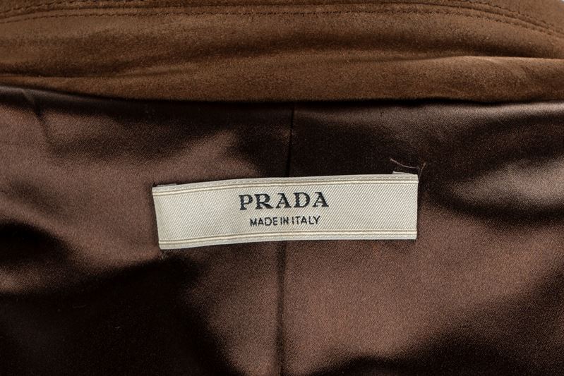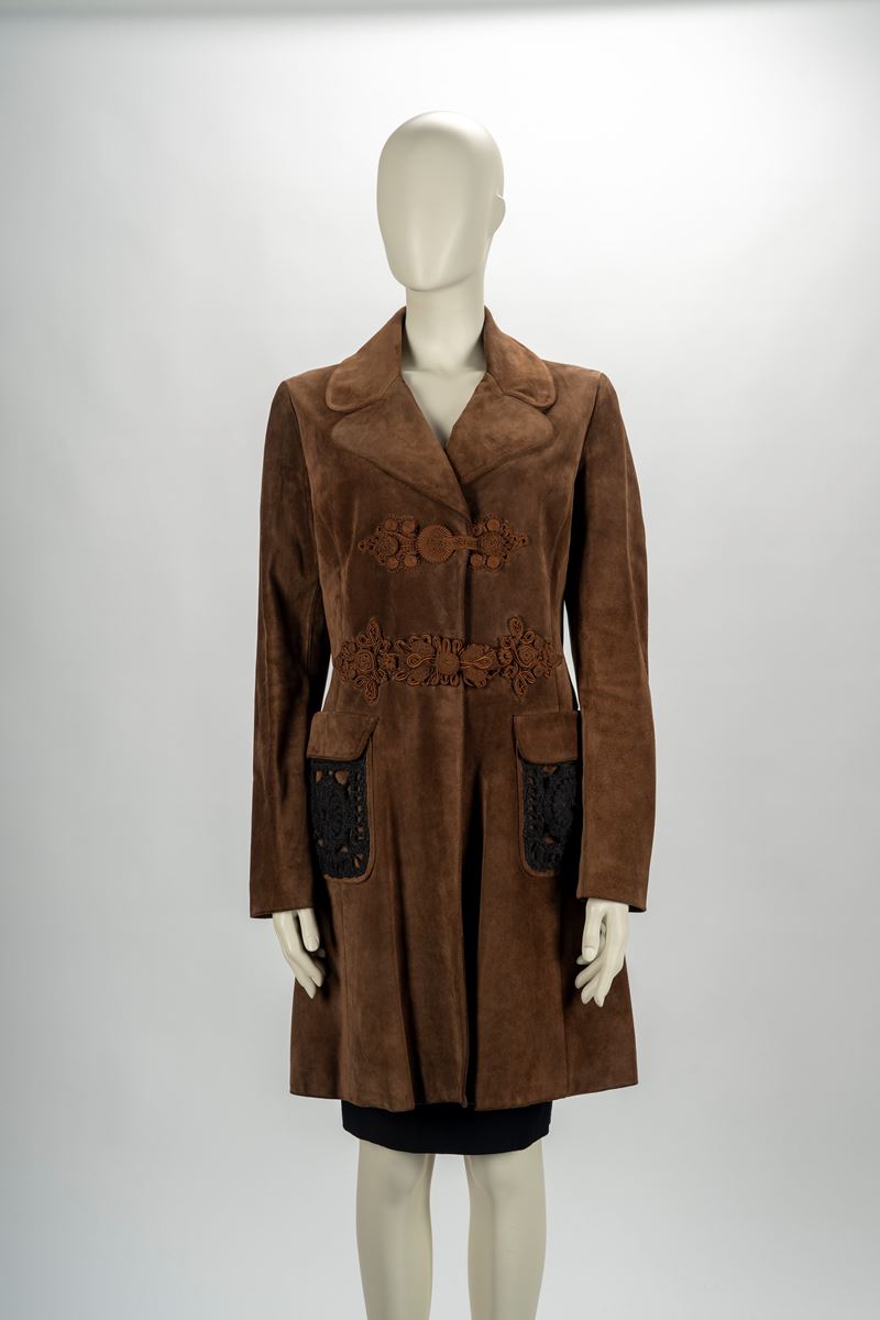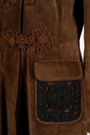 in pelle scamosciata color marrone, applicazioni con alamari, taglia 44, con custodia (lievi segni d'uso)Base d'asta