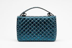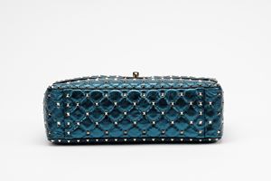 in pelle color blu metallizzato, dettagli in metallo, manico staccabile, tracolla a catena, cm 30, con sacchetto