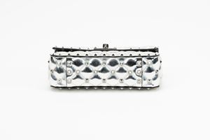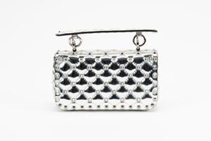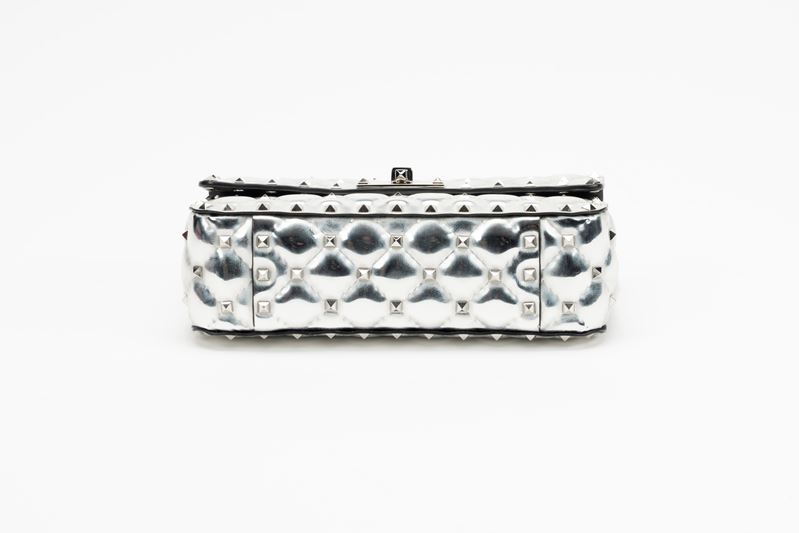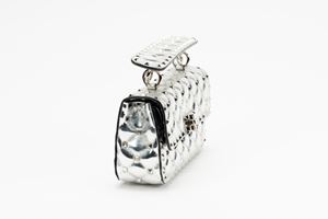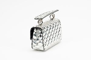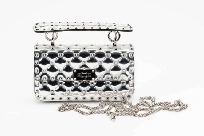 in vernice color argento, interno in pelle color nero, dettagli in metallo, manico staccabile, tracolla a catena, cm 20, con sacchettoBase d'asta