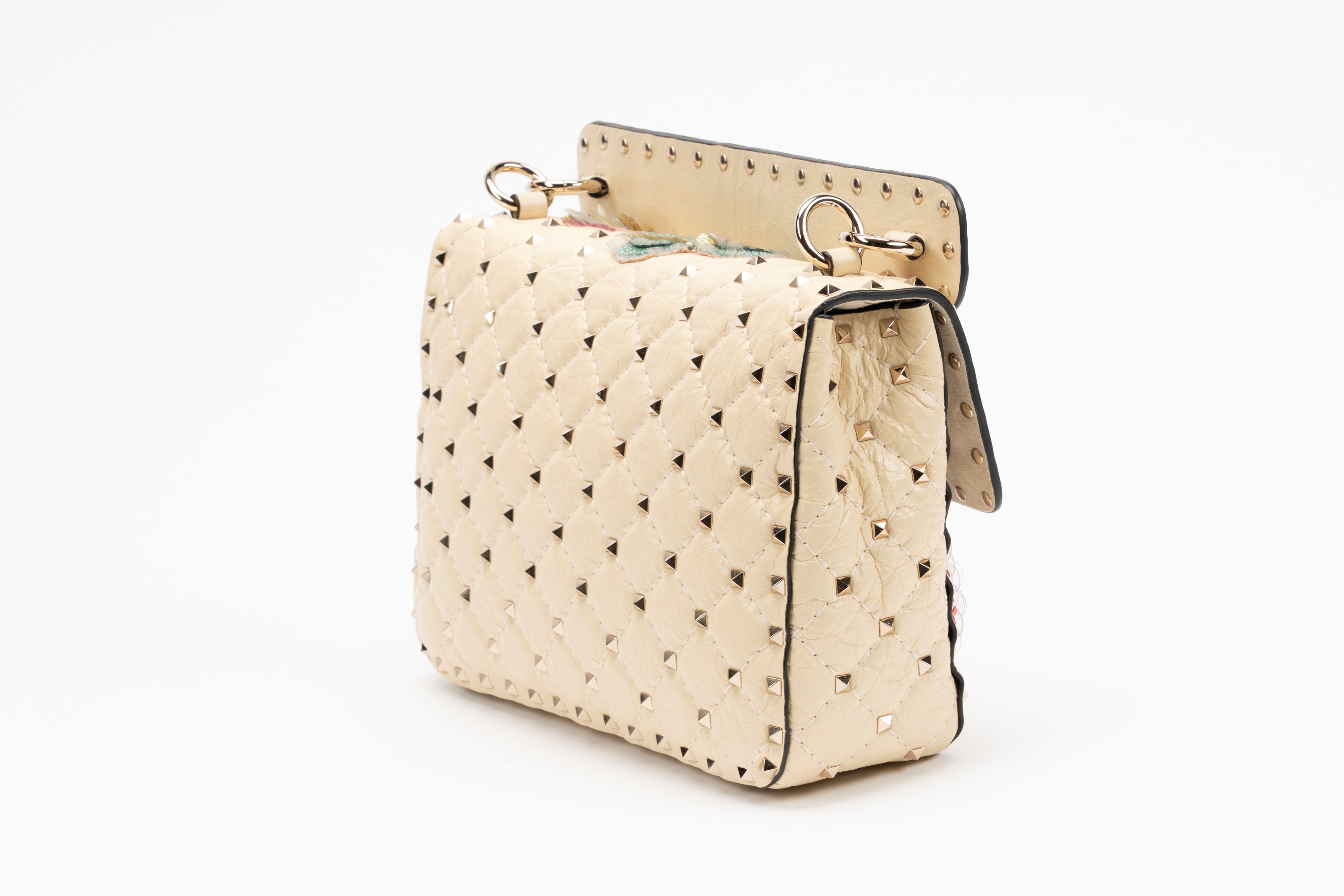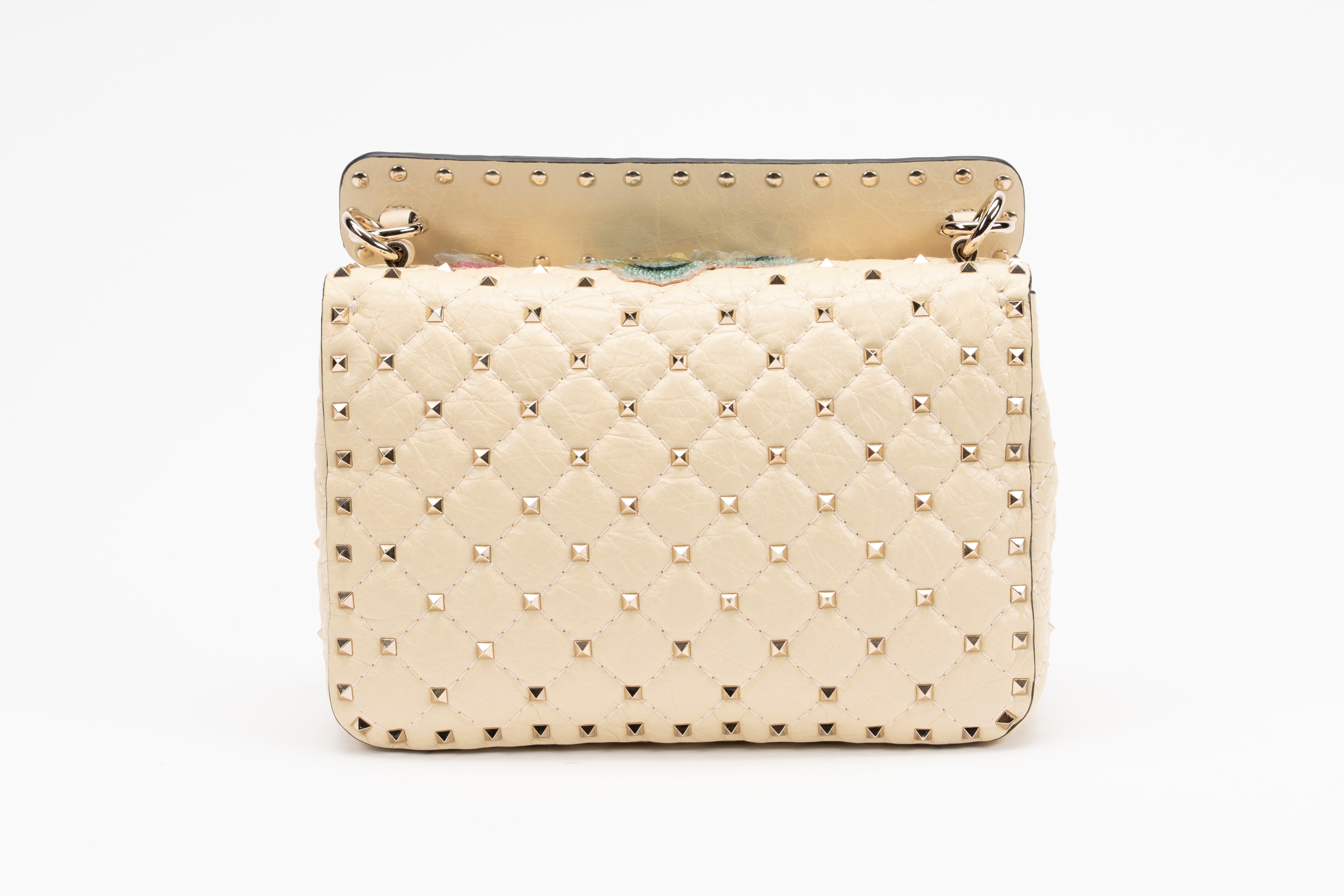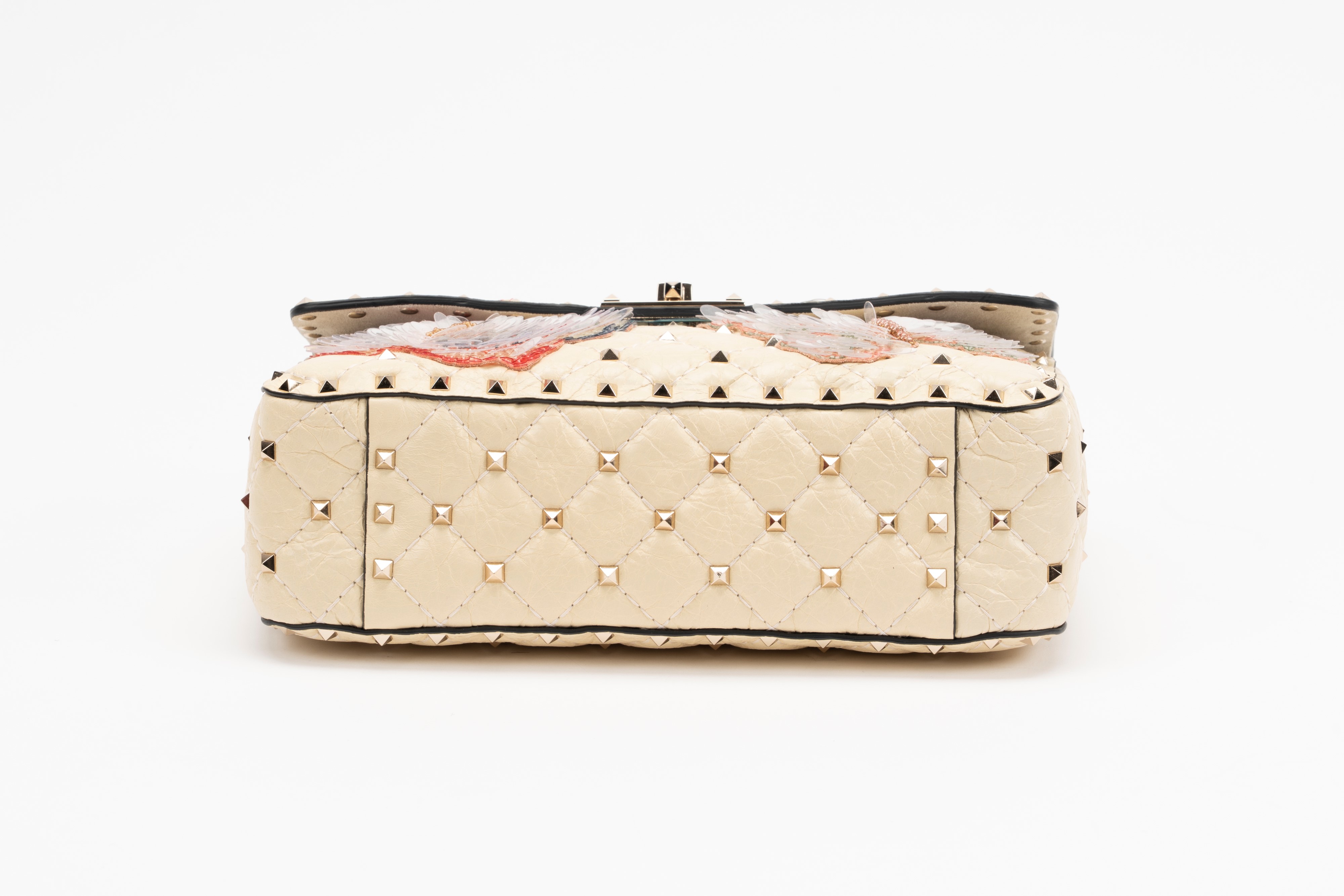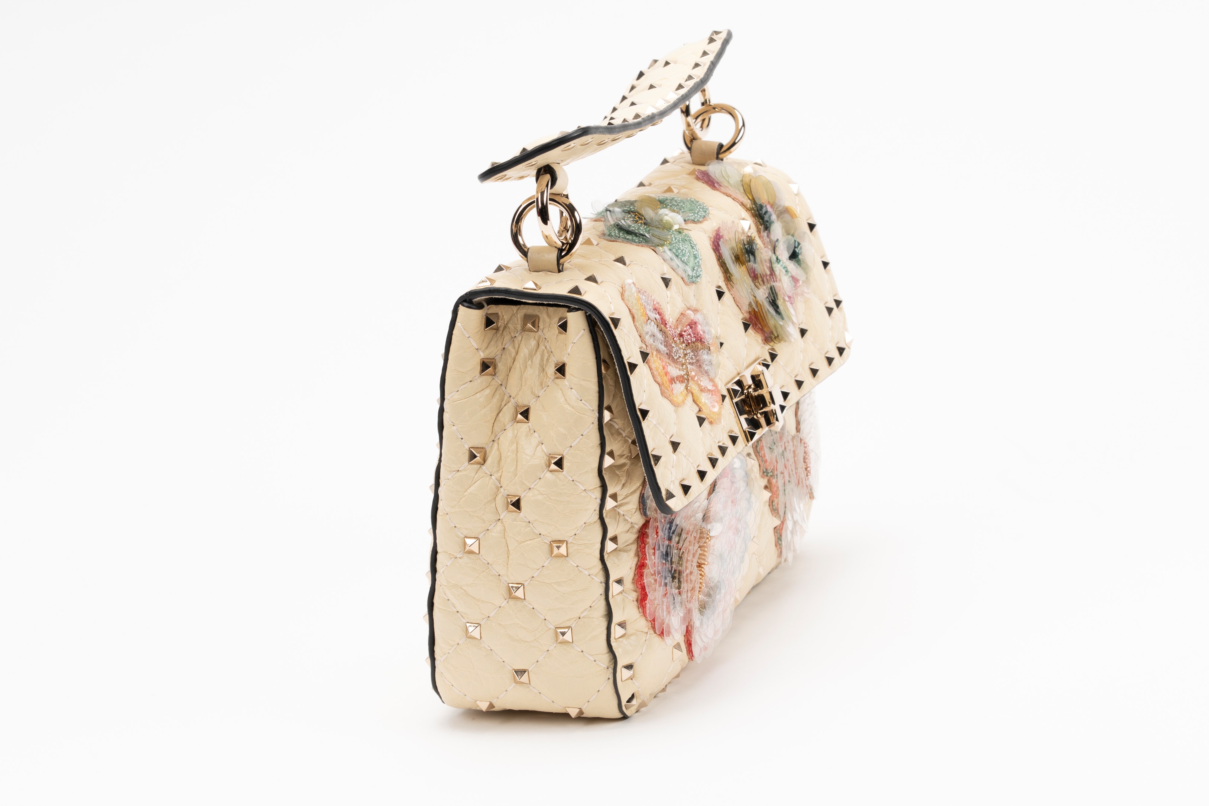 in pelle color crema, applicazioni a forma di farfalle ricamate con paillettes multicolor, dettagli in metallo, manico staccabile, tracolla a catena, interno in camoscio, cm 23, con sacchetto (lievissimi segni d'uso)Base d'asta