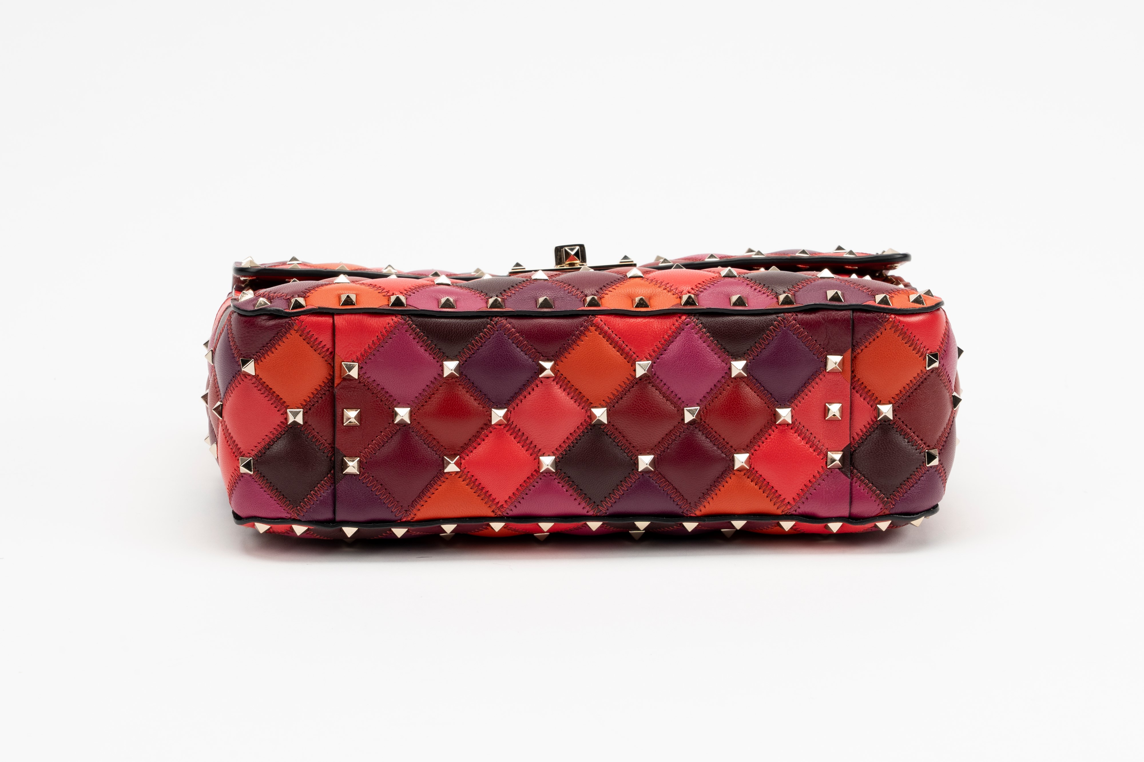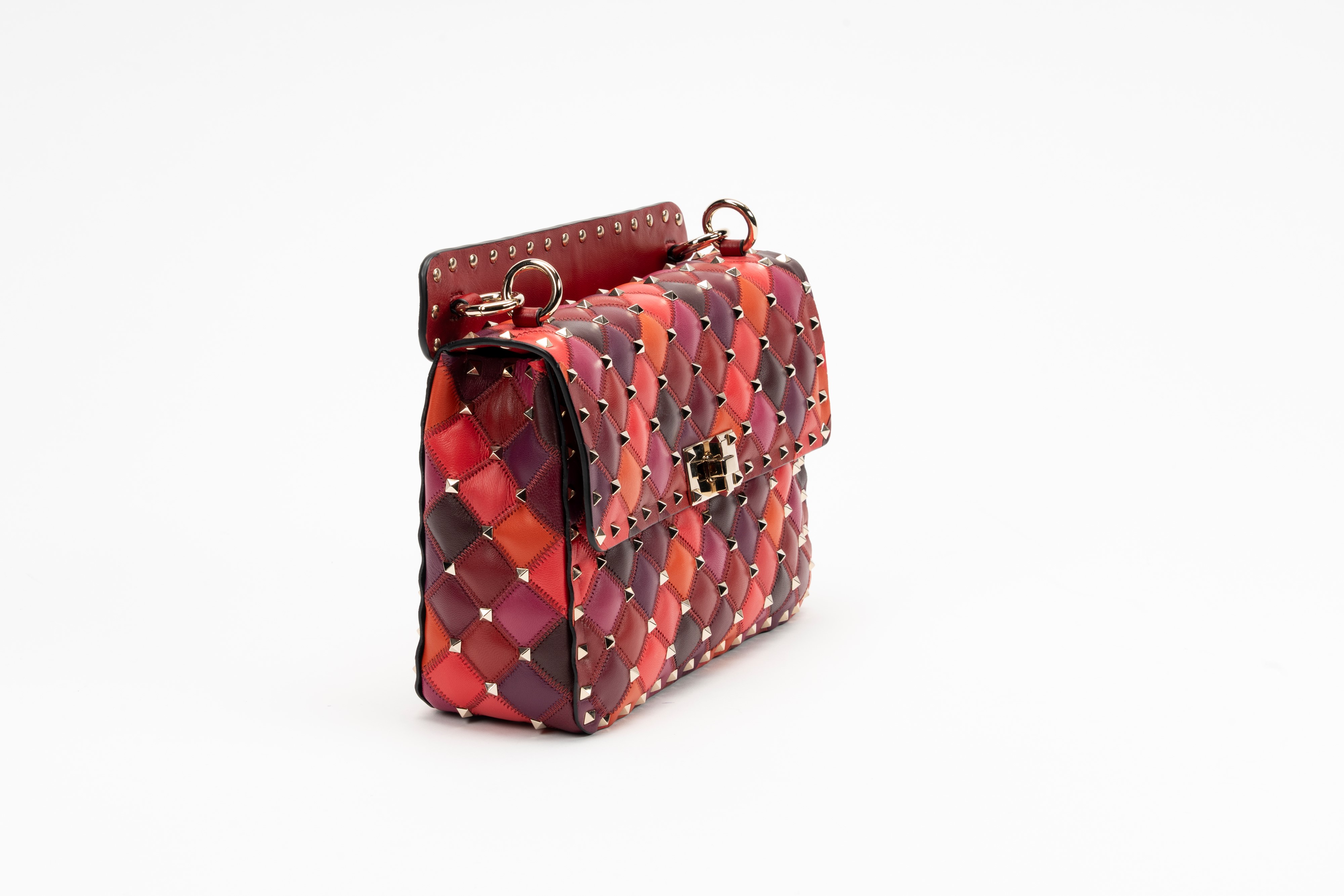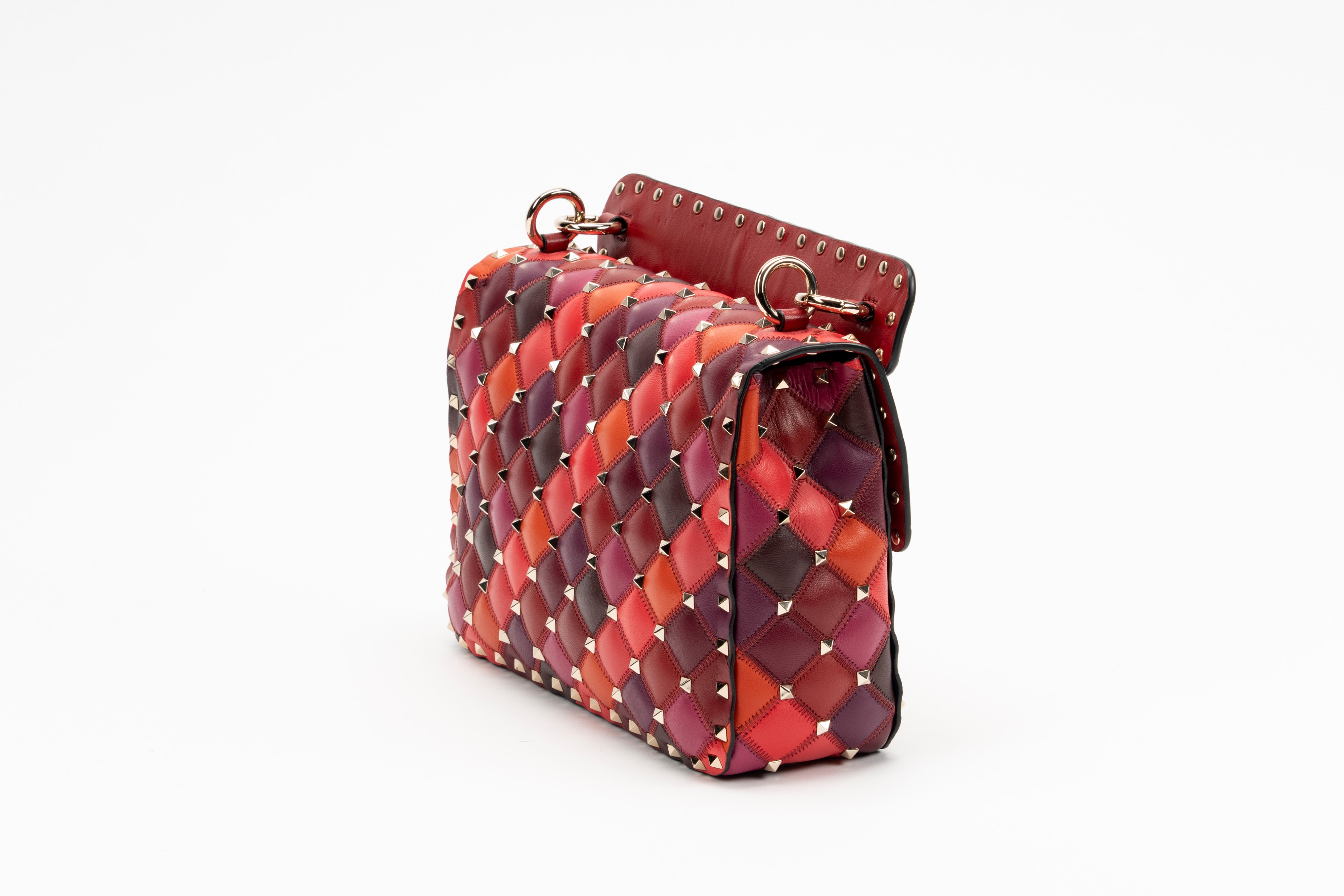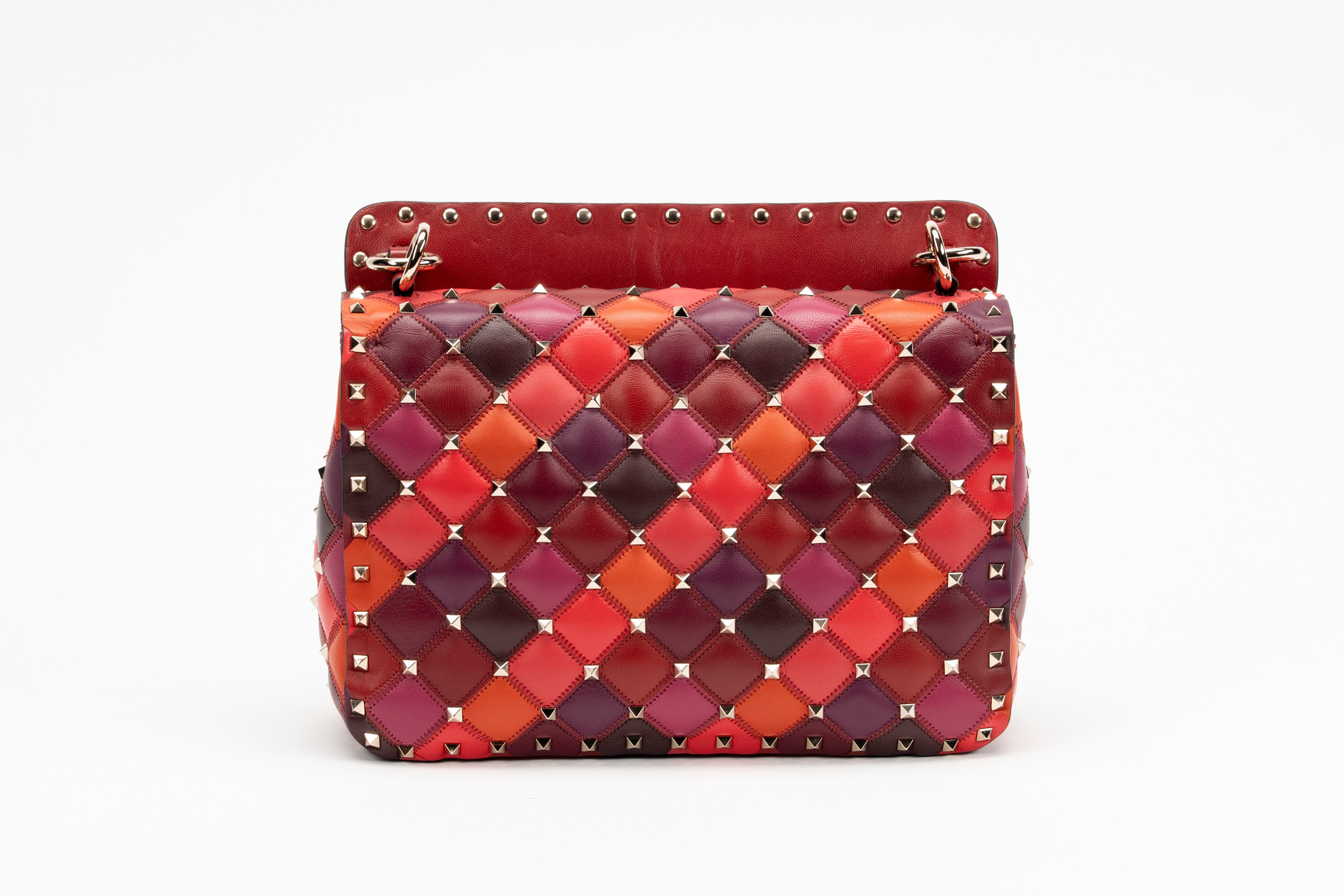in pelle nelle tonalità del rosso, arancione e bordeaux, dettagli in metallo, interno in pelle color rosso, manico staccabile, tracolla a catena, cm 23, con sacchetto (lievissimi segni d'uso)Base d'asta