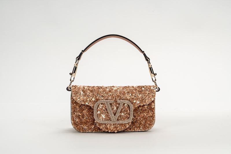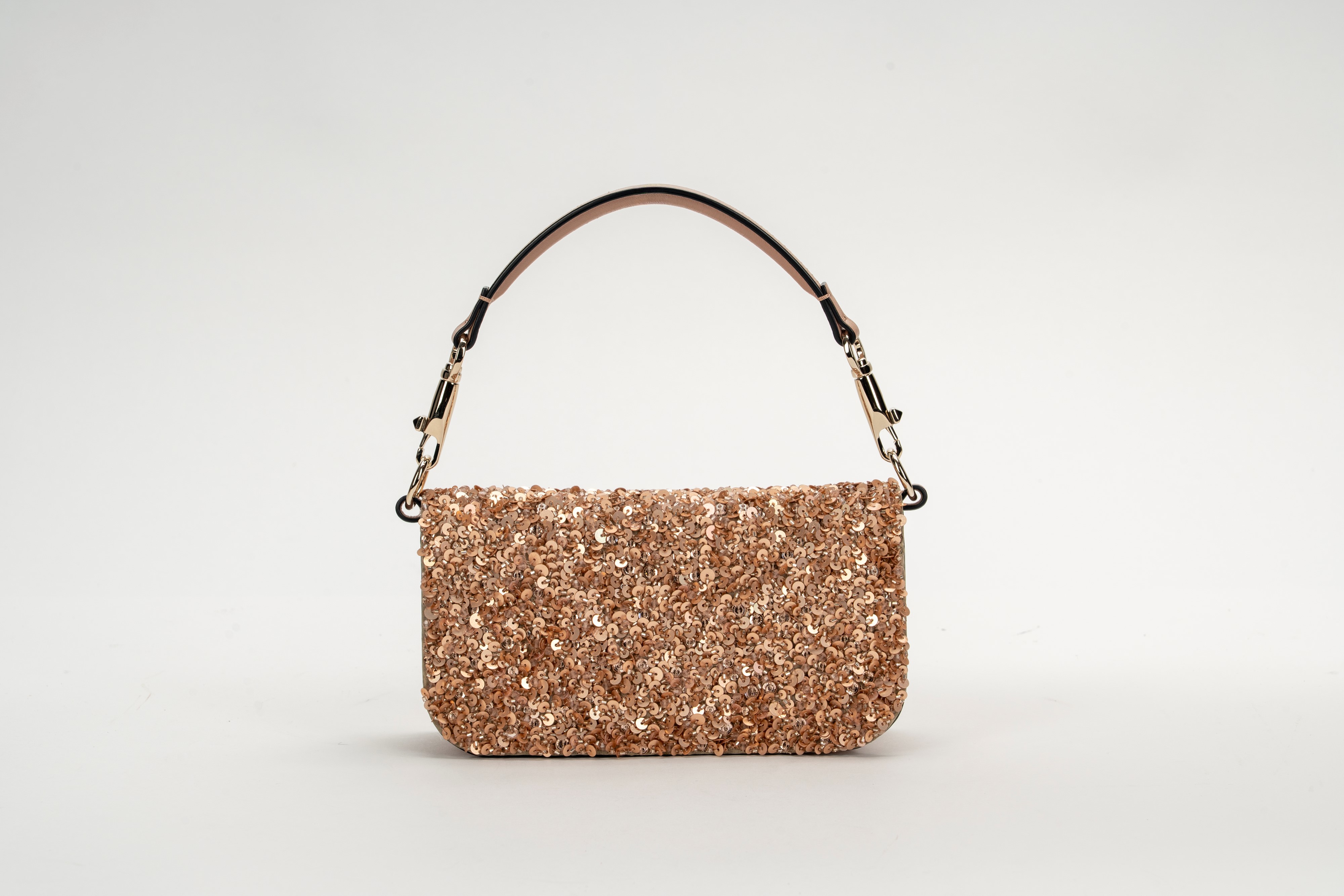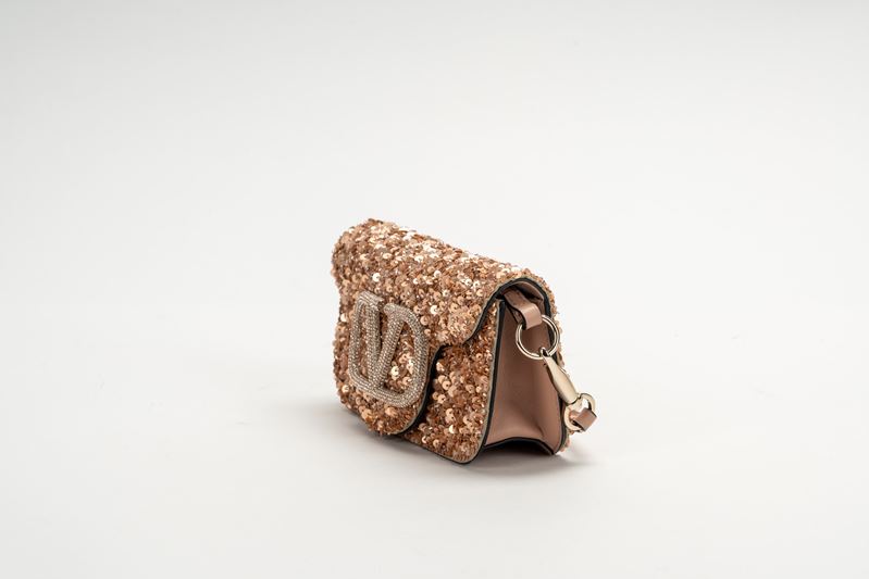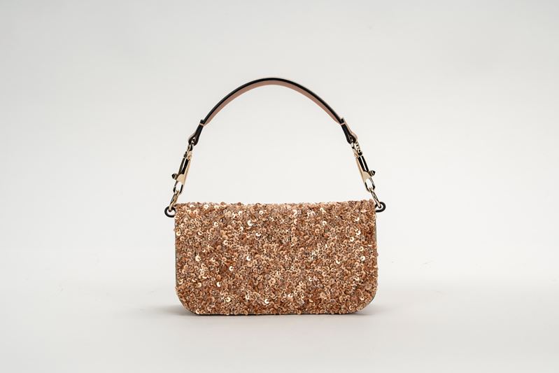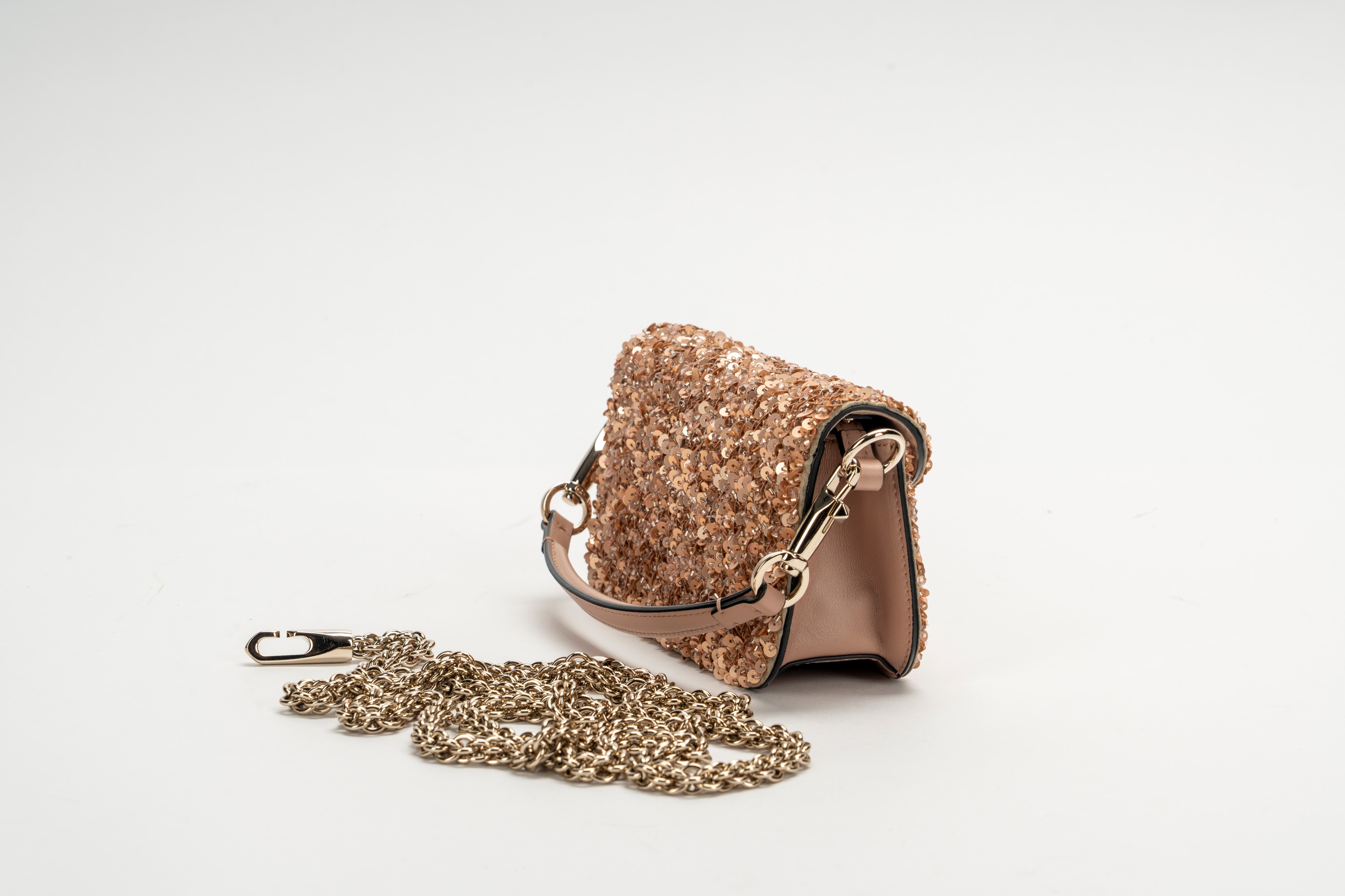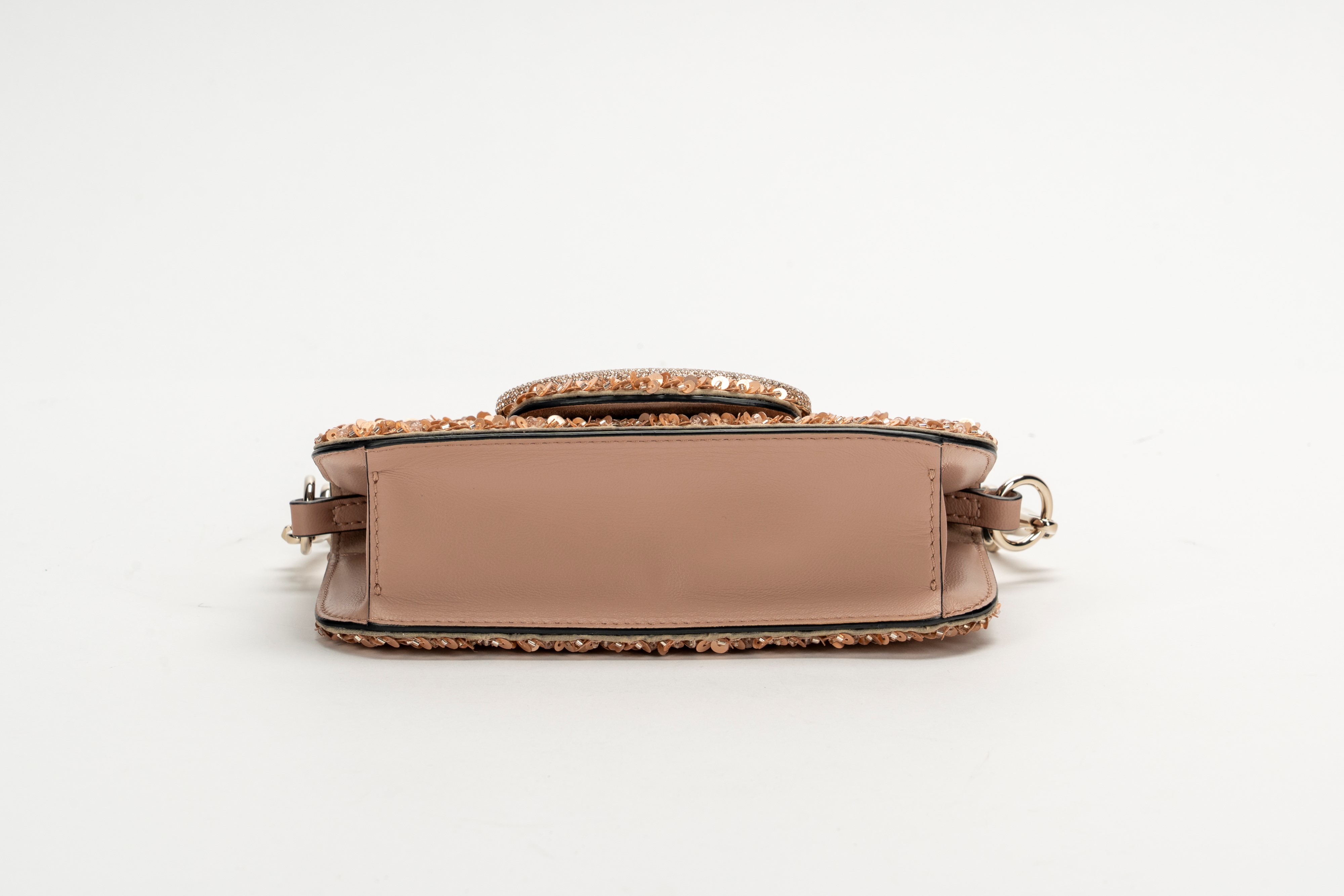 in pelle color rosa cipria, interamente ricamata con paillettes, grande fibbia in metallo dorato e strass, tracolla a catena in metallo staccabile, cm 19,5, con sacchettoBase d'asta