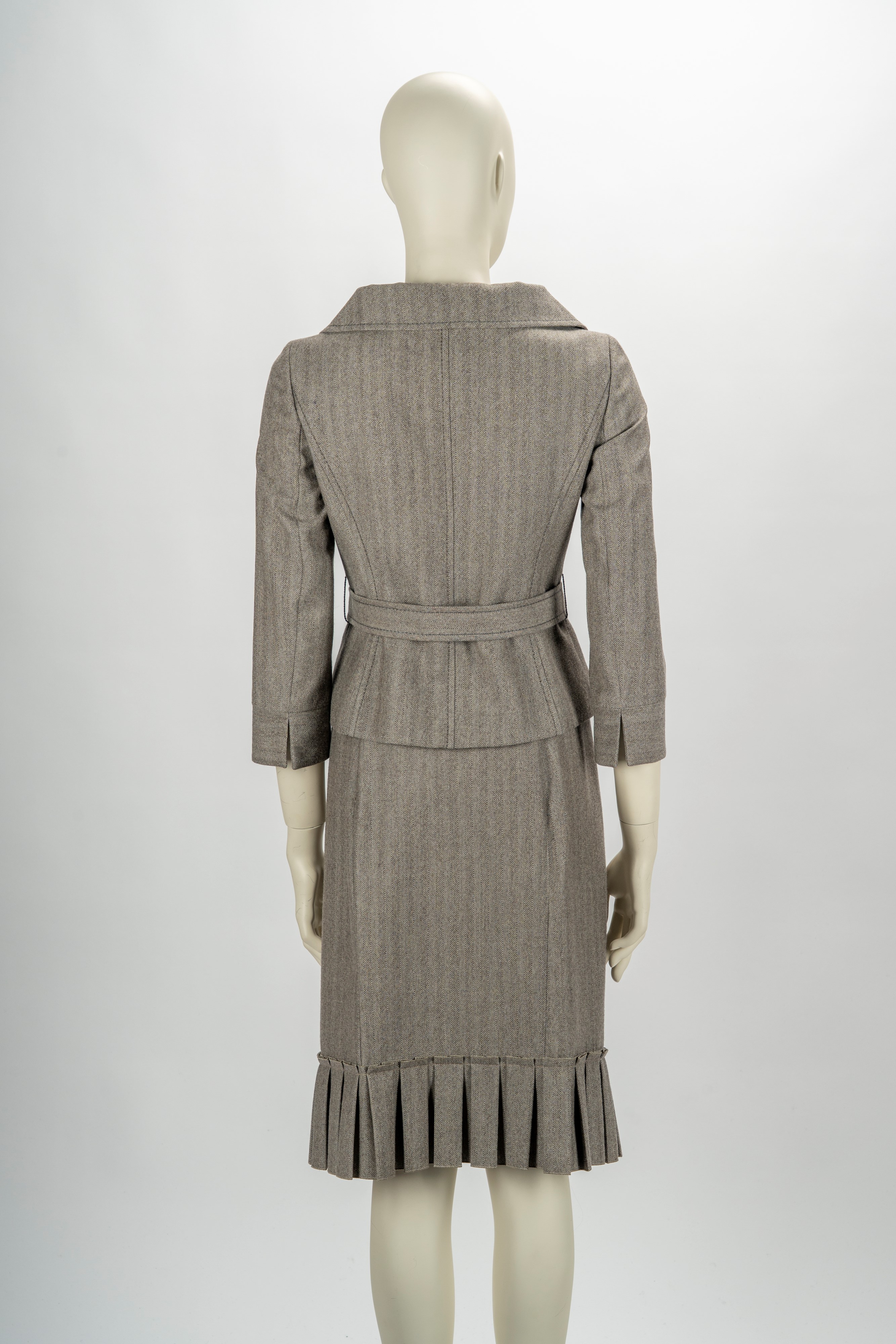 in lana a spina di pesce, giacca manica lunga con cintura fiocco, gonna con bordo a pieghe, fodera monogrammata, taglia 42