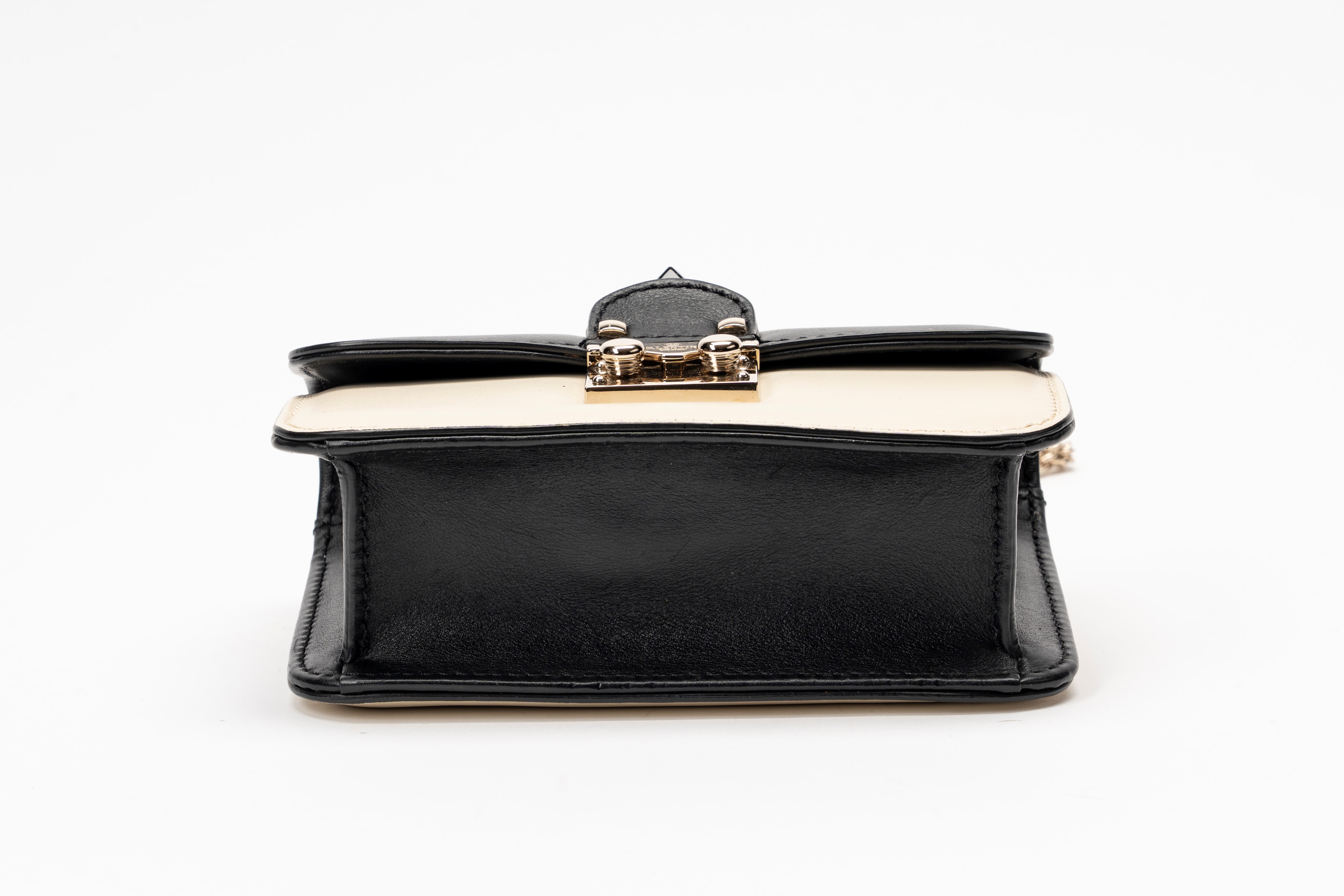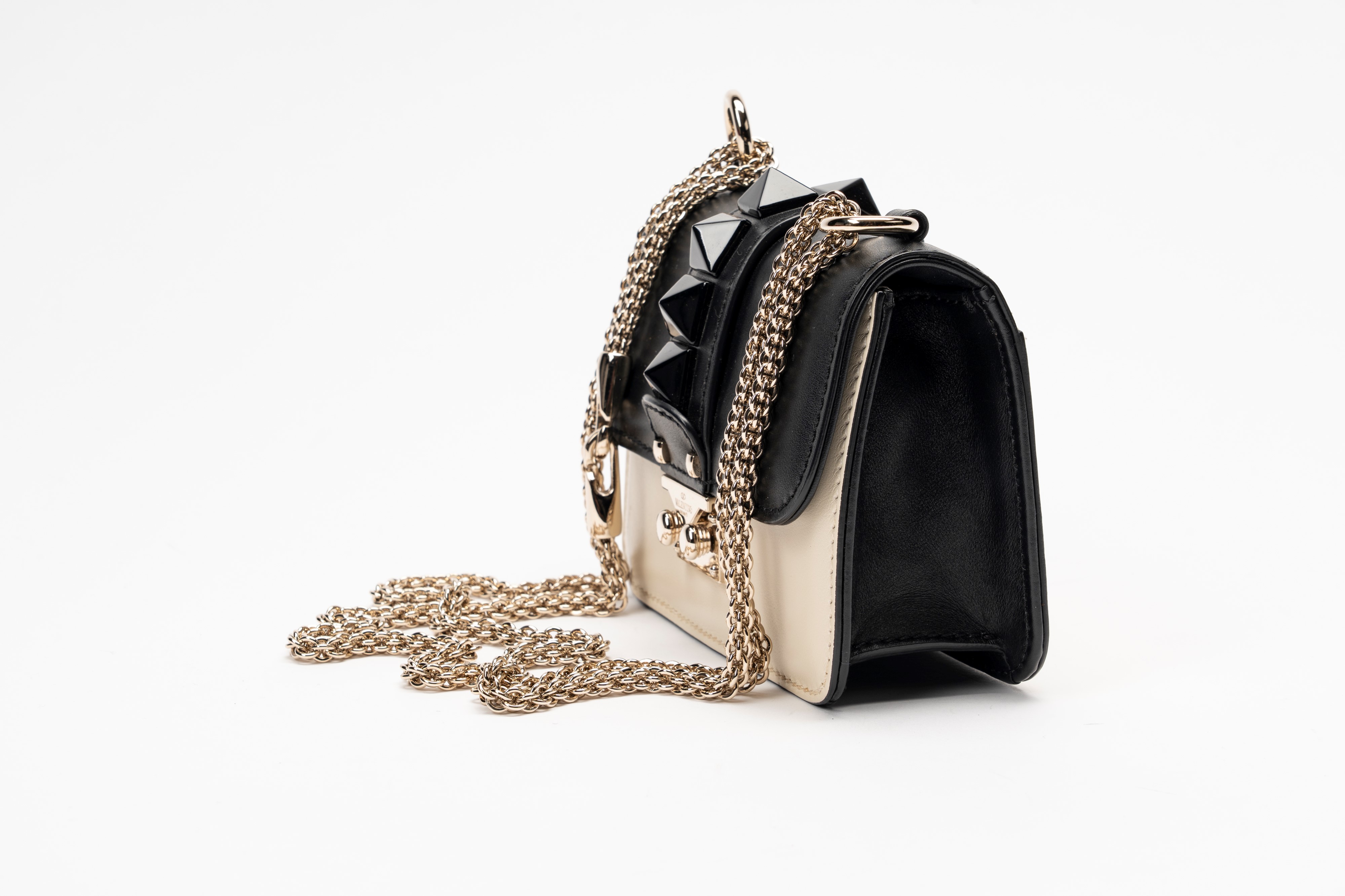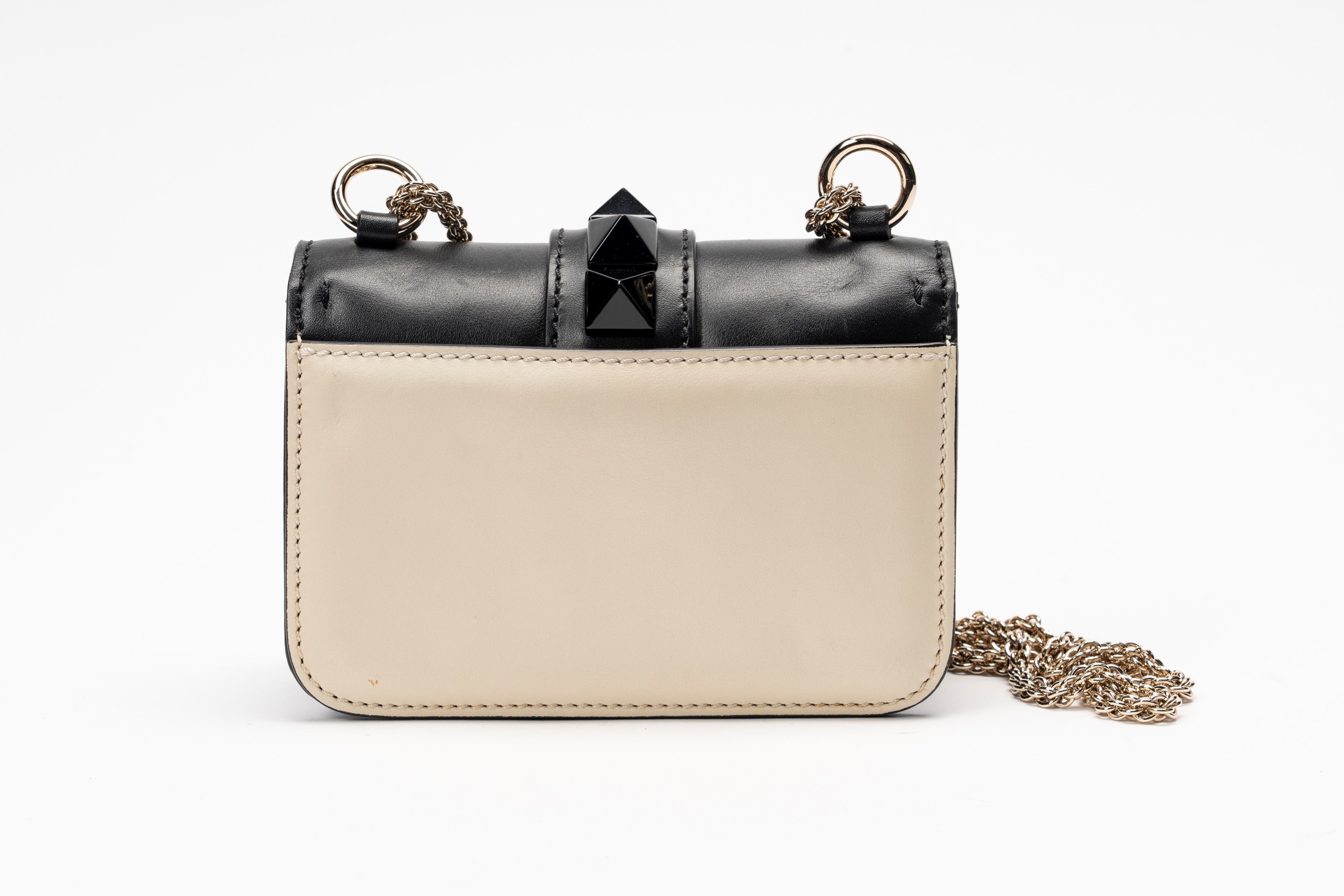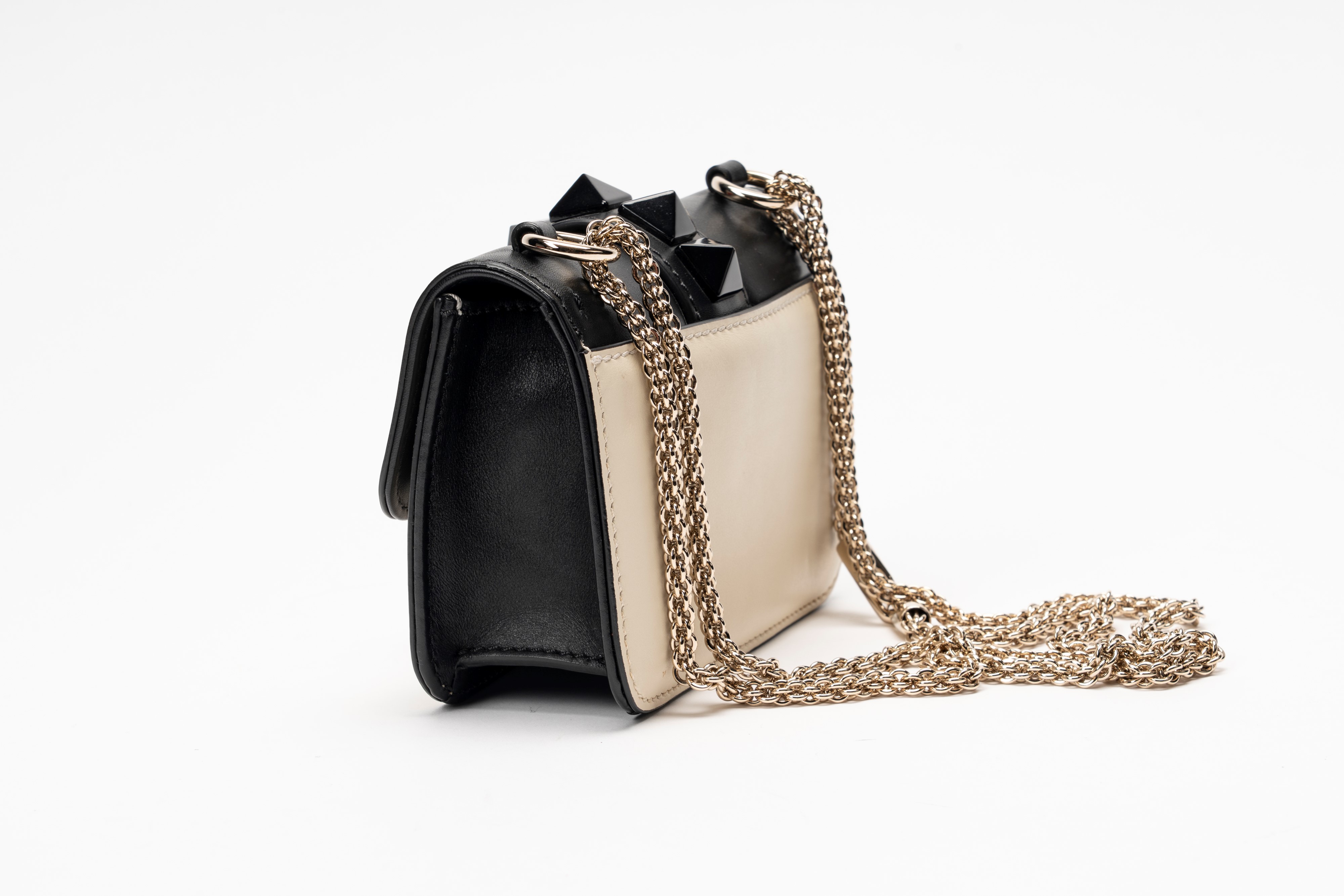 in pelle color panna e nero, dettagli in metallo bicolore, tracolla a catena staccabile, cm 17 (lievi segni d'uso)