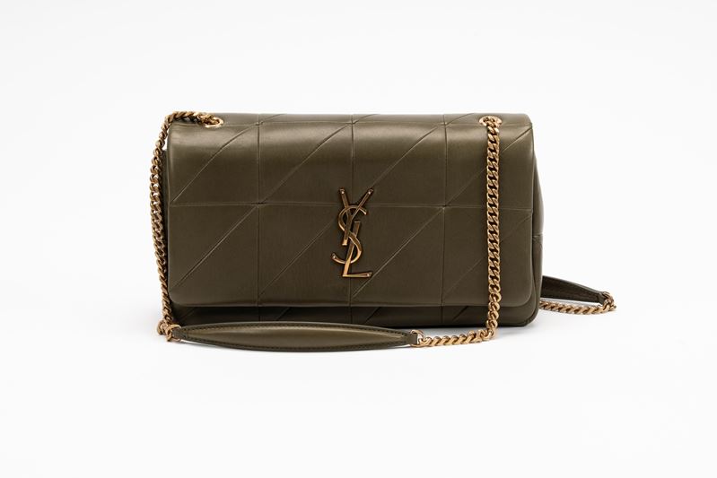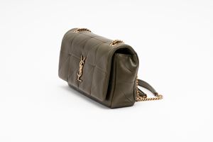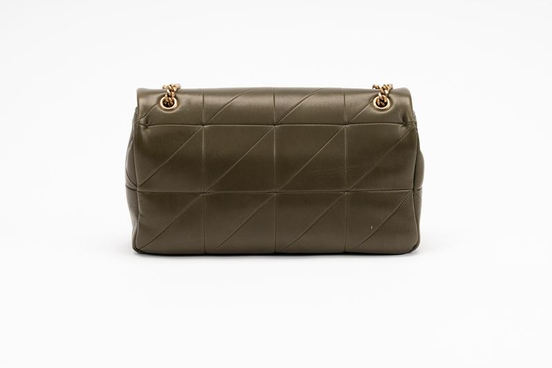 in pelle color verde, cuciture a vista, tracolla a catena e dettagli in metallo dorato, cm 25, con sacchetto e scatola