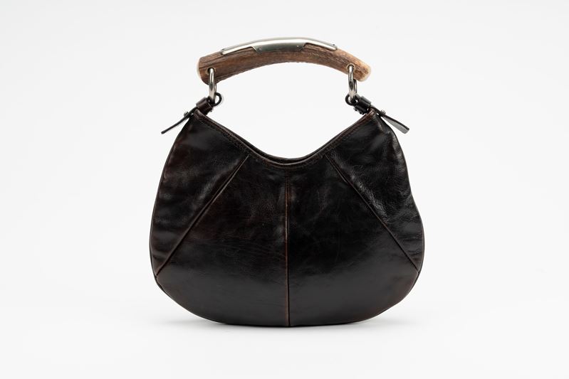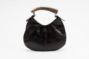 in pelle color marrone, dettagli in metallo, cm 27 (lievi segni d'uso)Base d'asta
