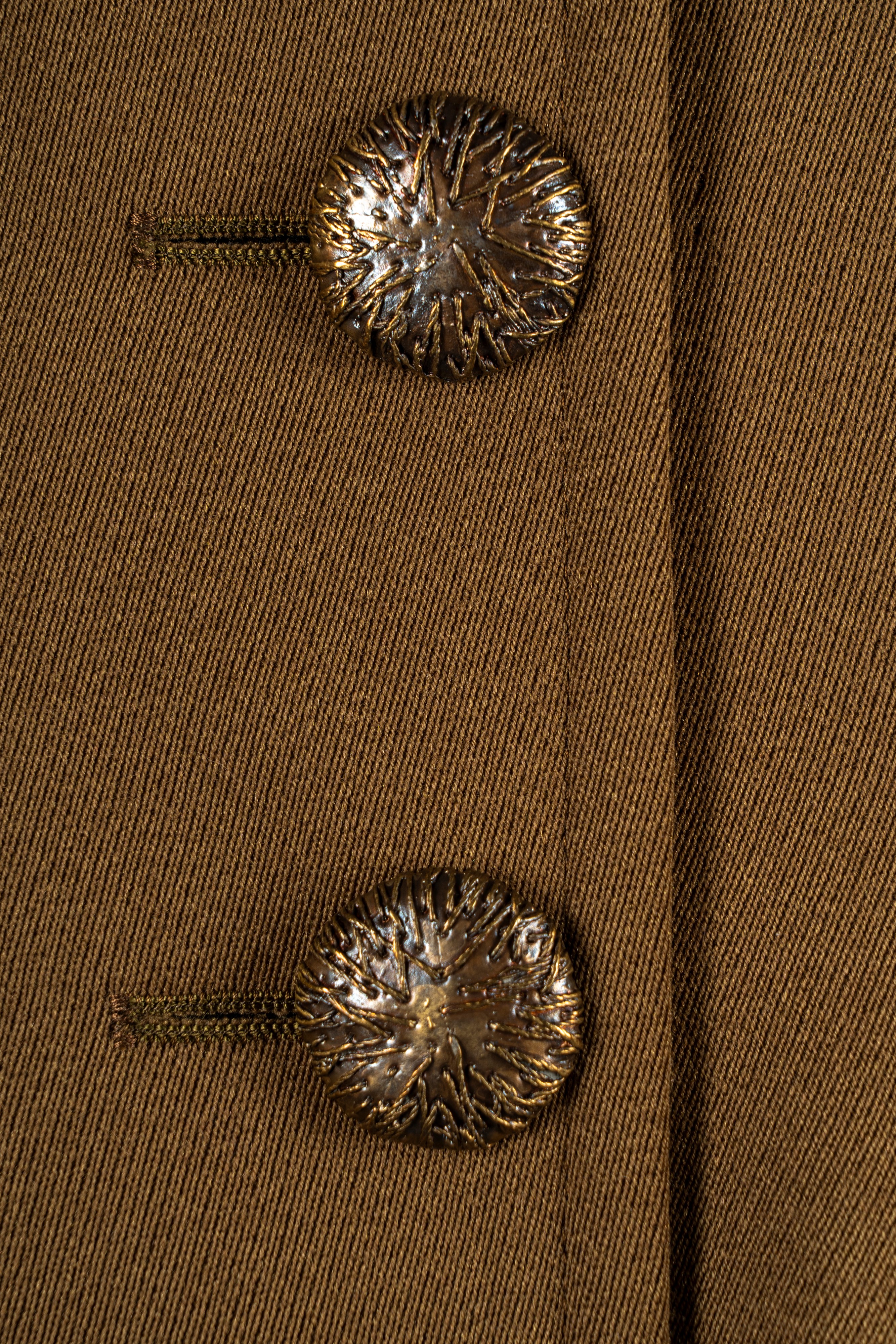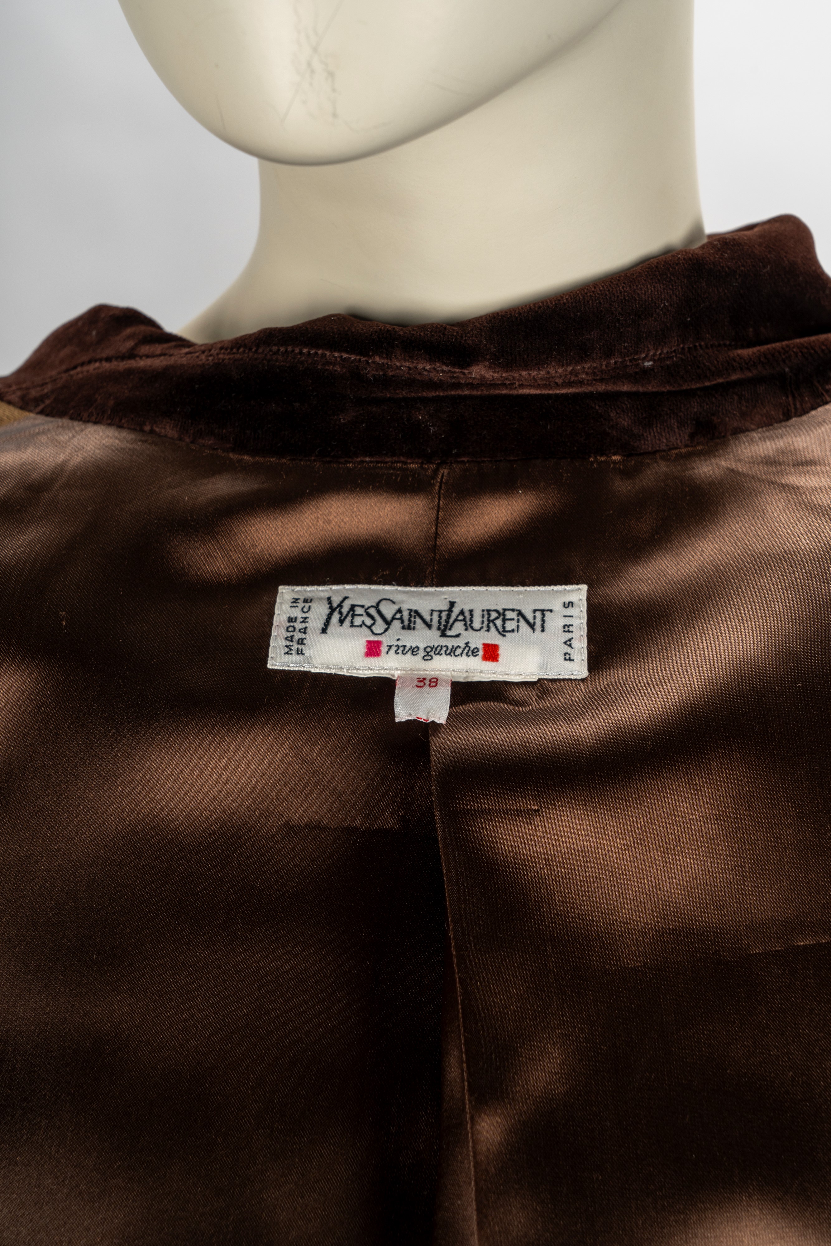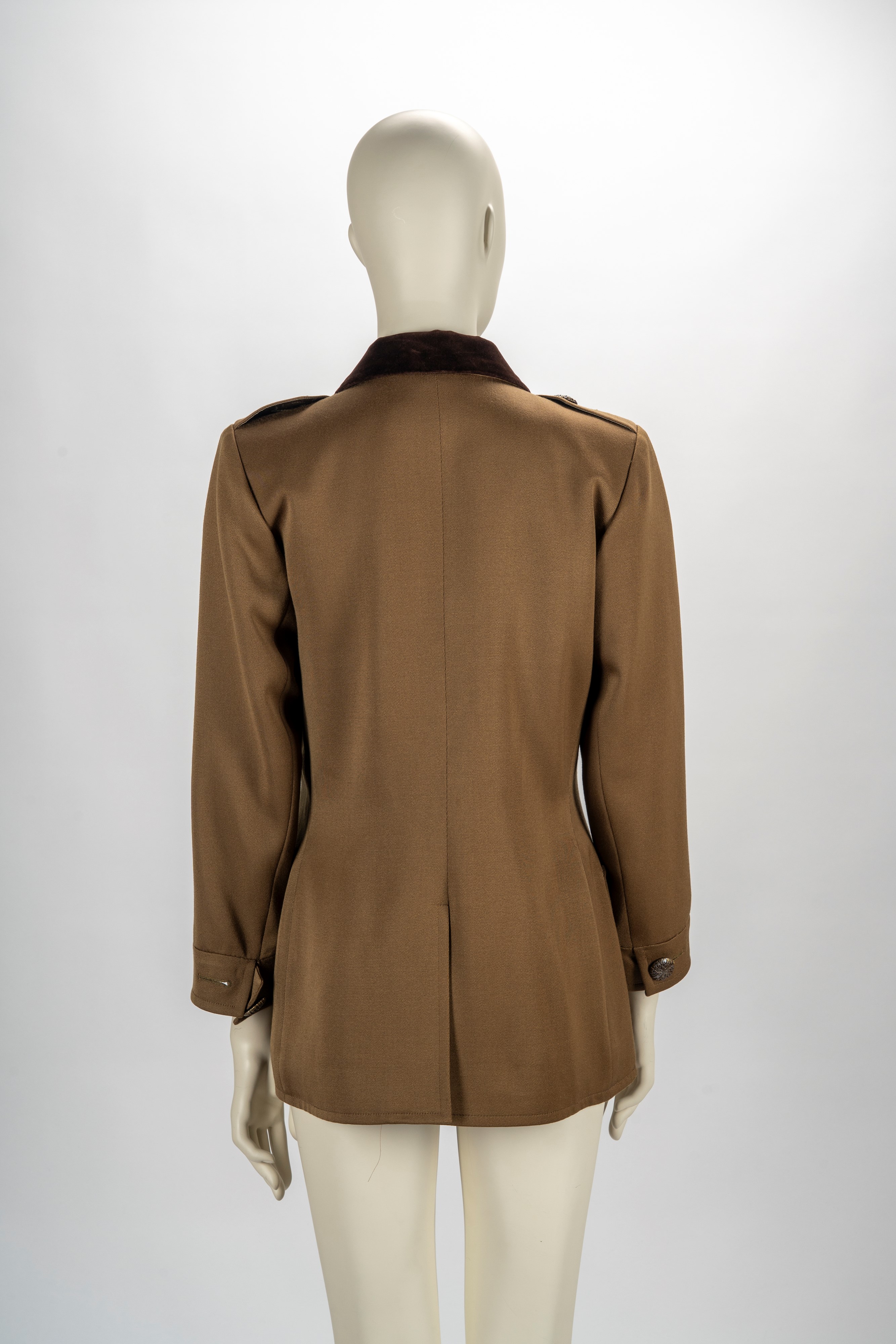 color tabacco, manica lunga, doppia abbottonatura con bottoni gioiello in metallo, dettaglio in velluto color marrone, taglia 38 franceseBase d'asta