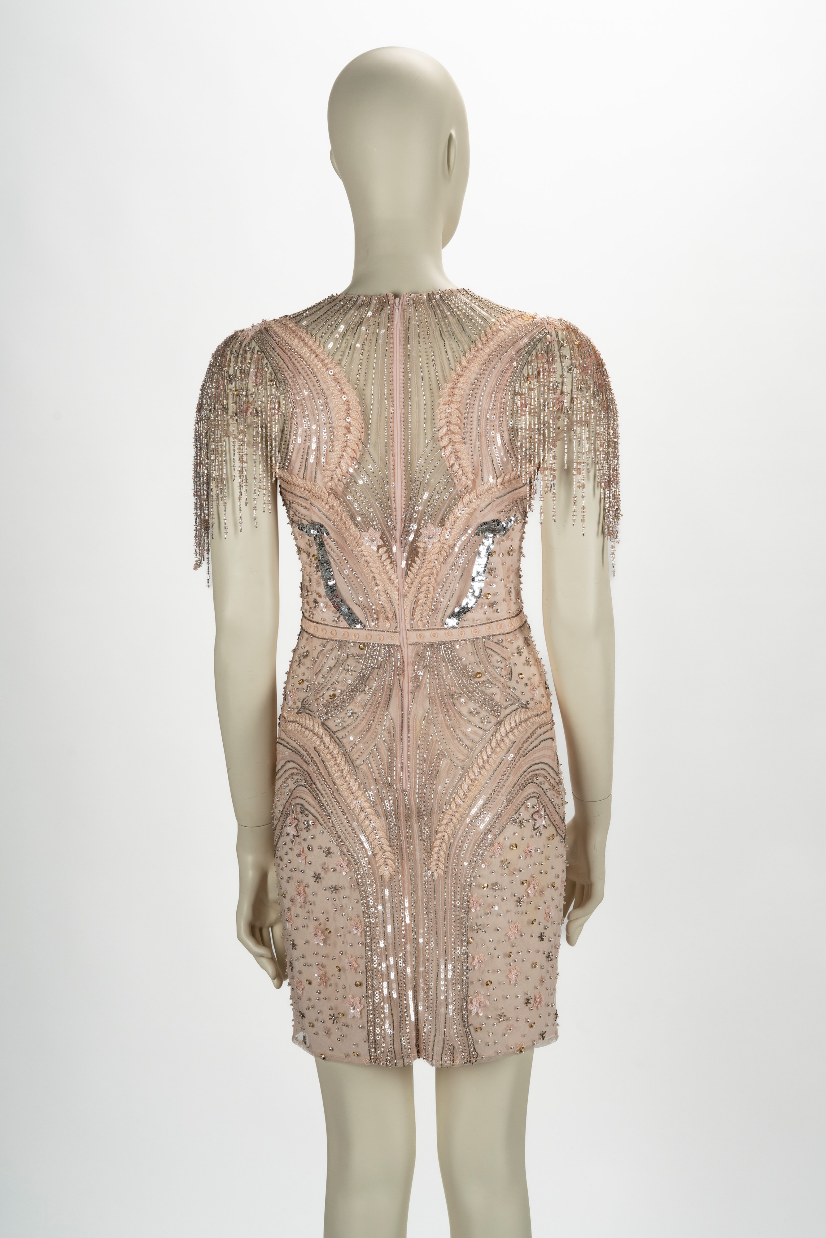 in seta e tulle color rosa internamente ricamato a motivo floreale con paillettes a perline in vetro color rosa e argento, taglia 38, manica corta con frange (lievissimi segni d'uso)Base d'asta